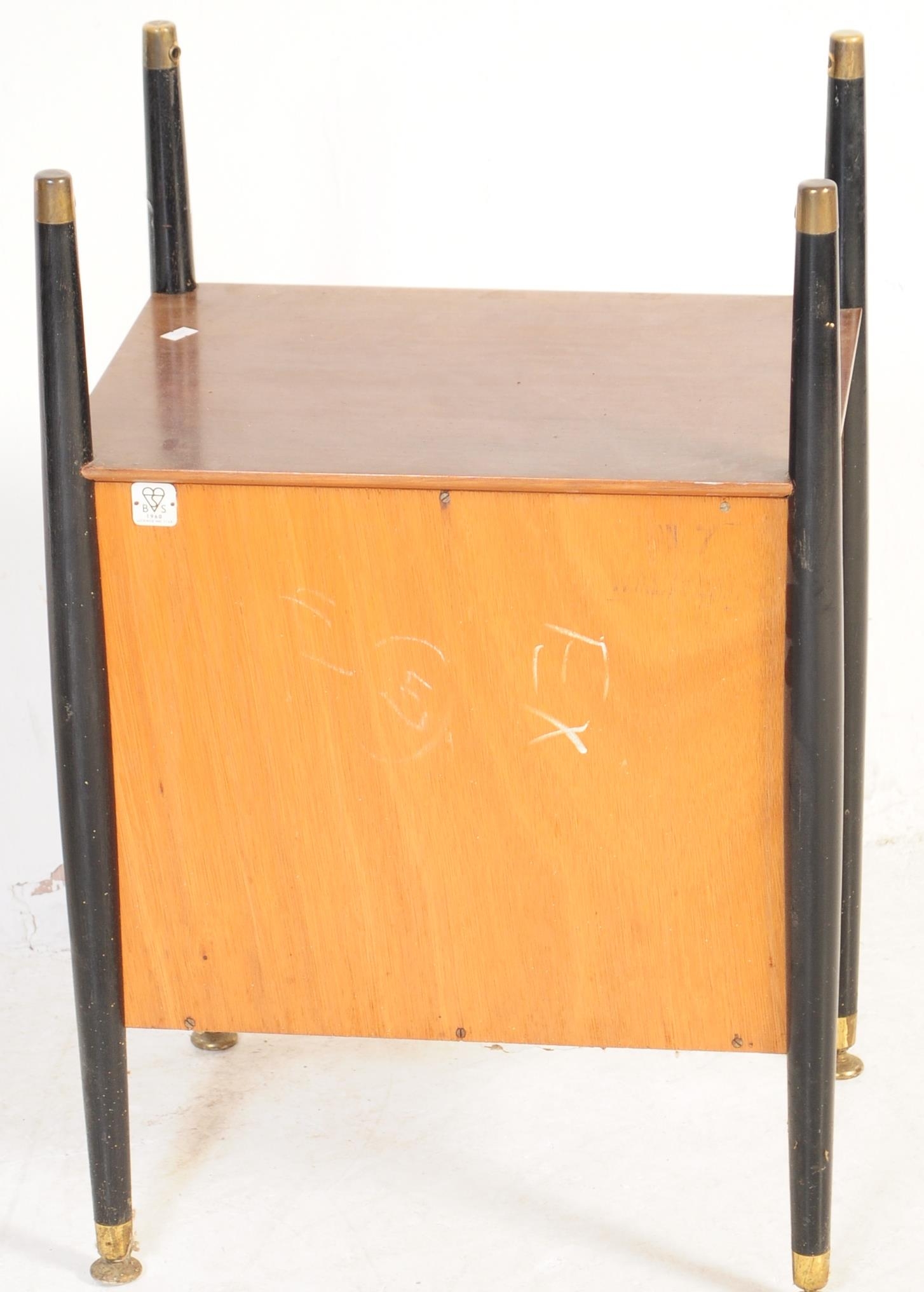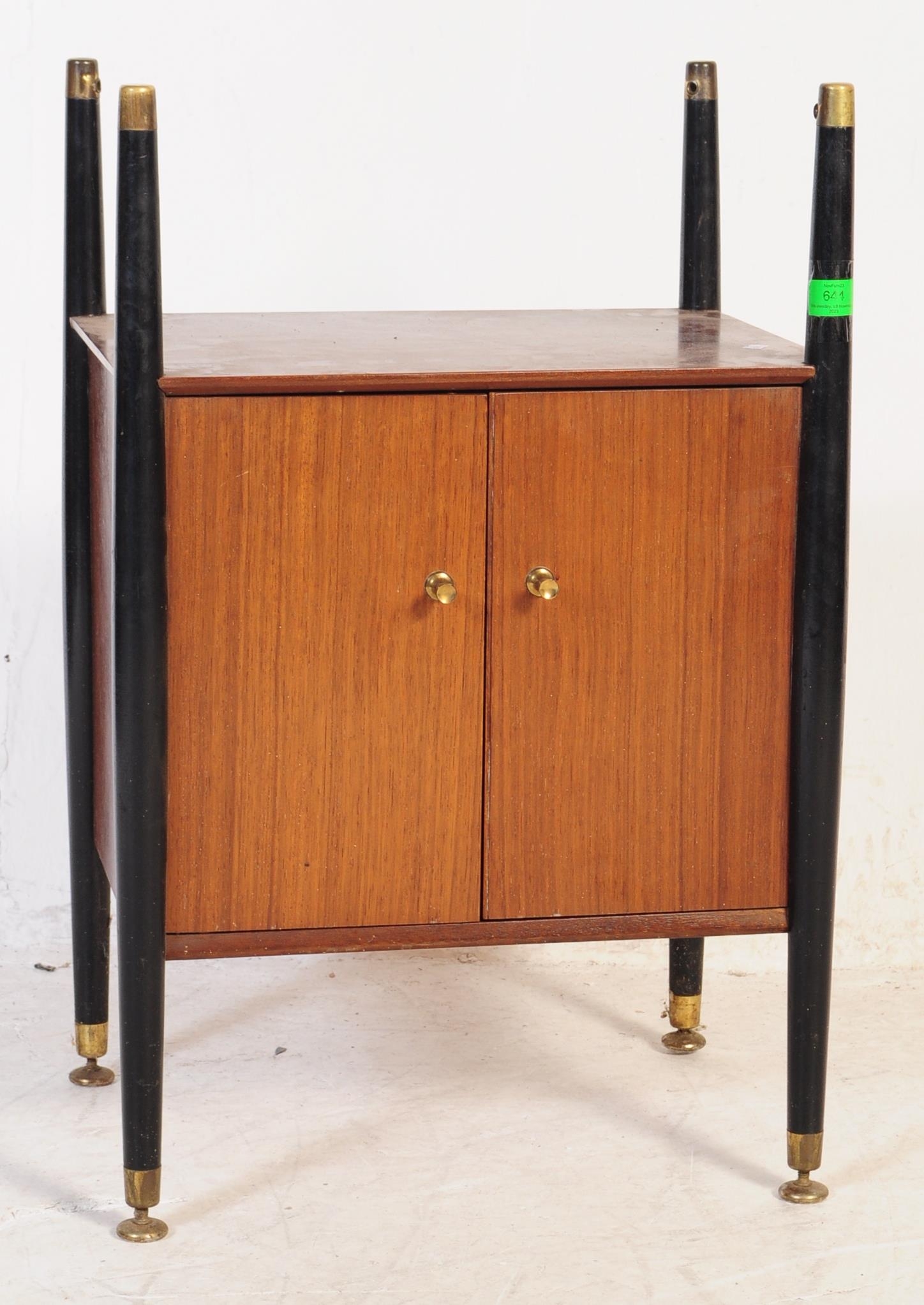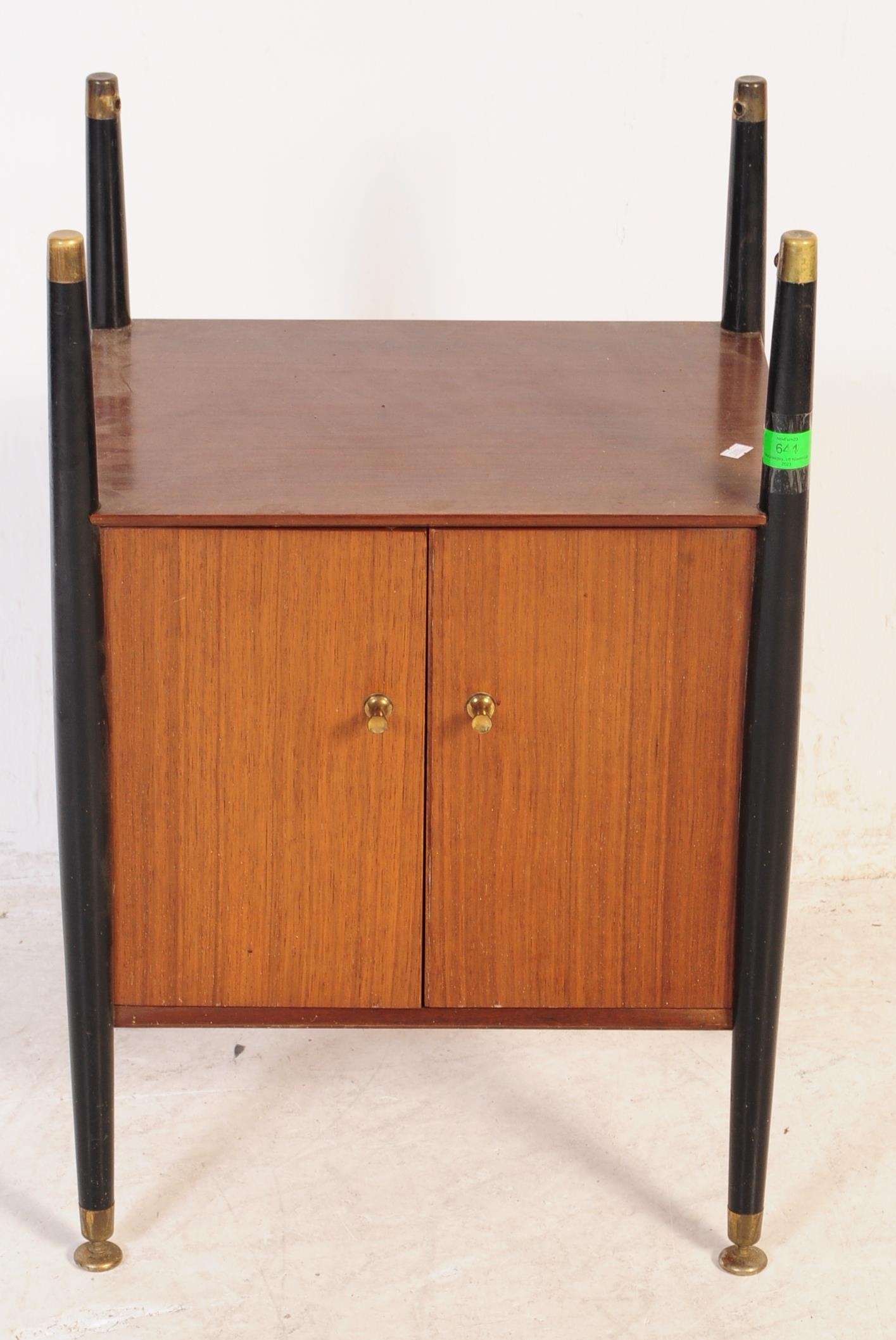 Nathan - A 1960's mid 20th Century teak wood bedside chest / side lamp table by Nathan. Of simple form having a single cupboard with all raised and supported on angled ebonised legs. Missing second tier glass shelf. Measures approx; 70x45x35cm