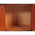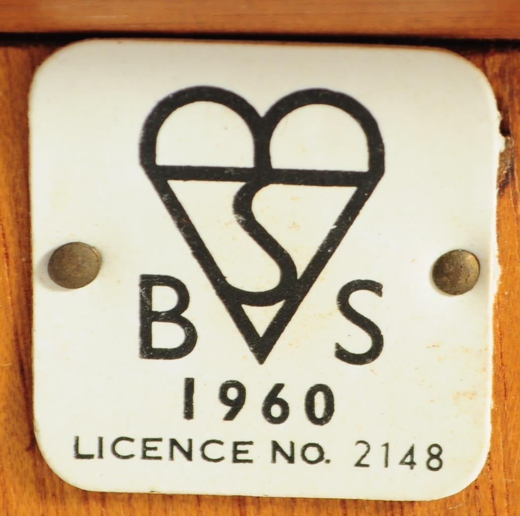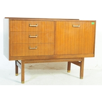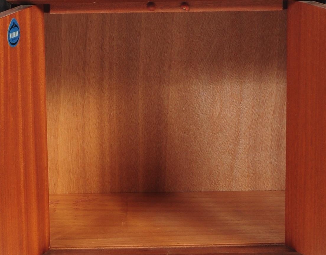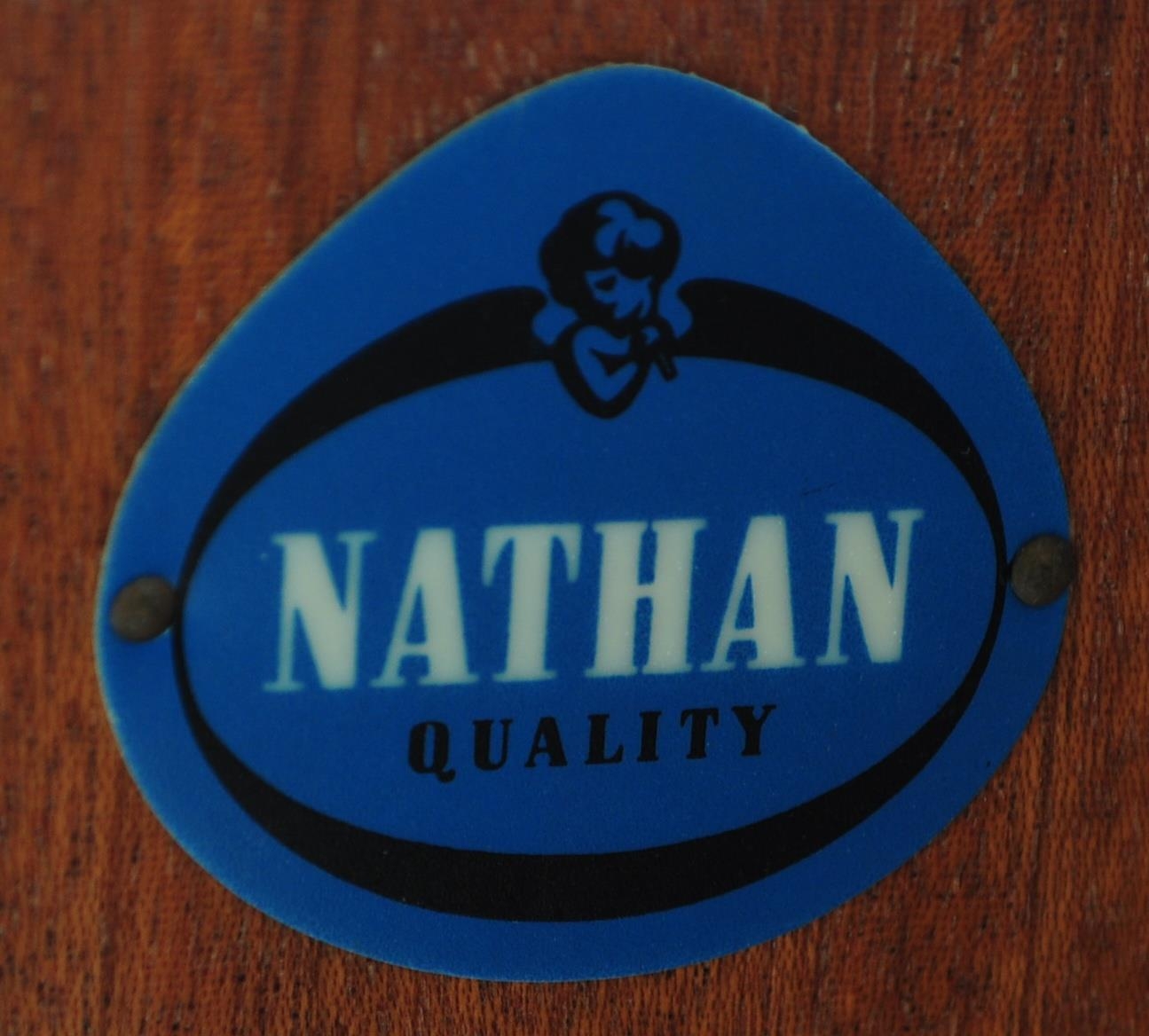 Nathan - A 1960's mid 20th Century teak wood bedside chest / side lamp table by Nathan. Of simple form having a single cupboard with all raised and supported on angled ebonised legs. Missing second tier glass shelf. Measures approx; 70x45x35cm