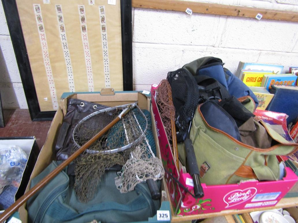 TWO BOXES OF FISHING EQUIPMENT AND BAGS