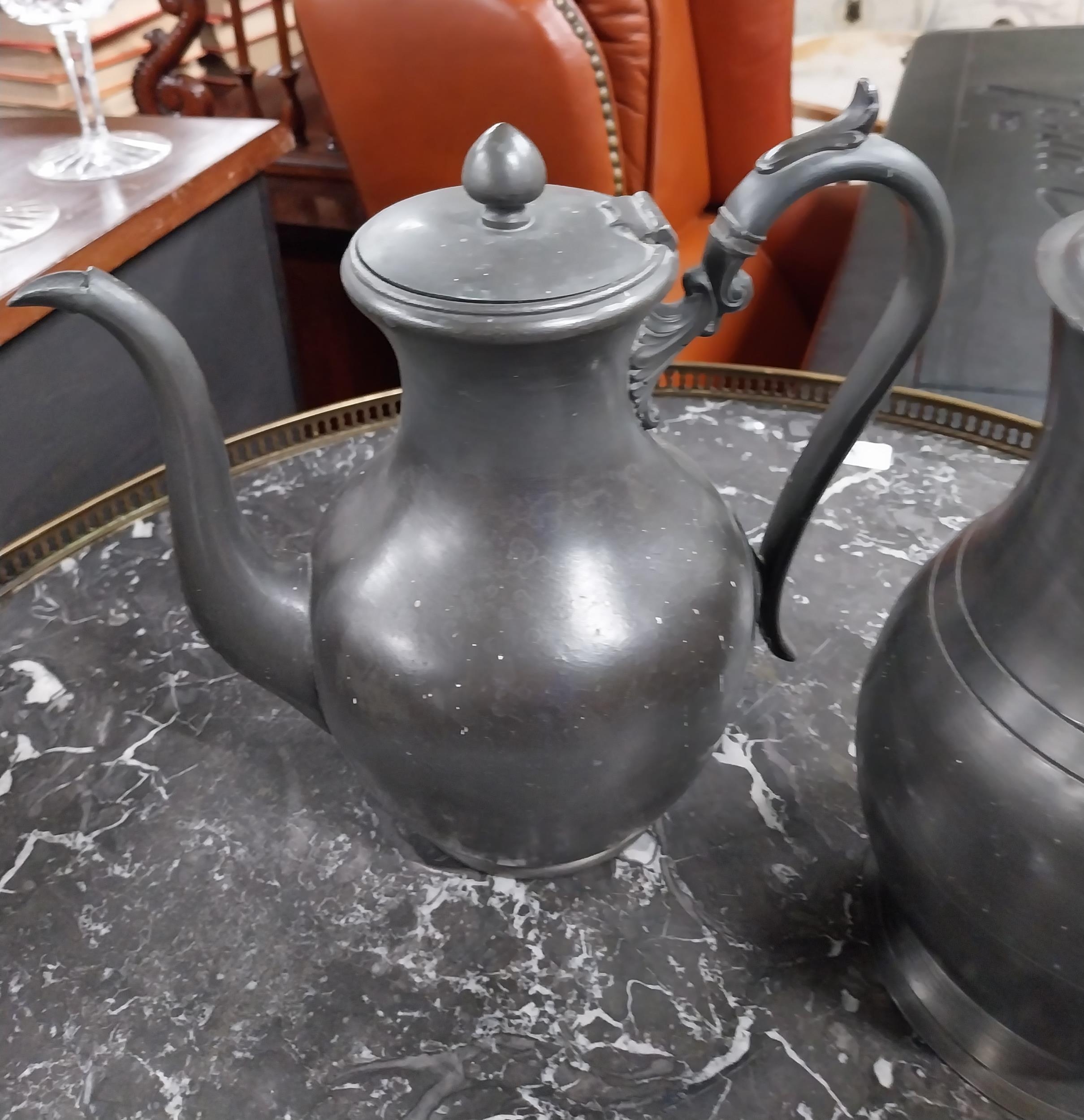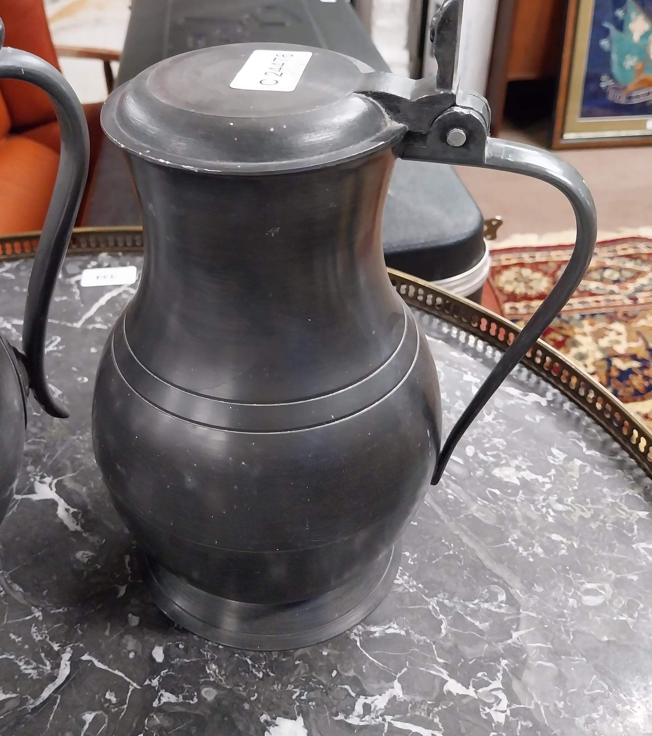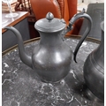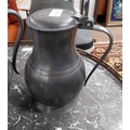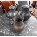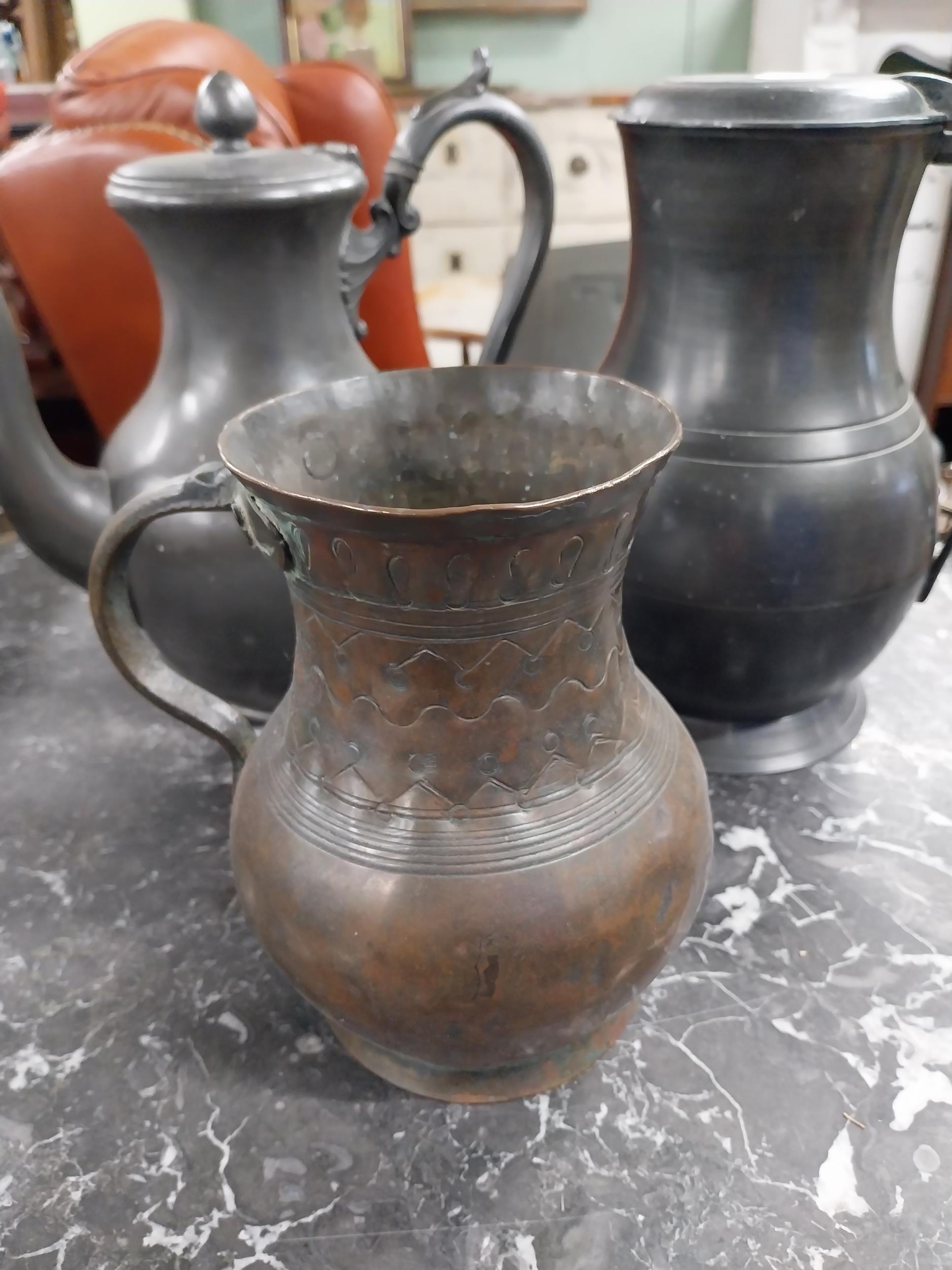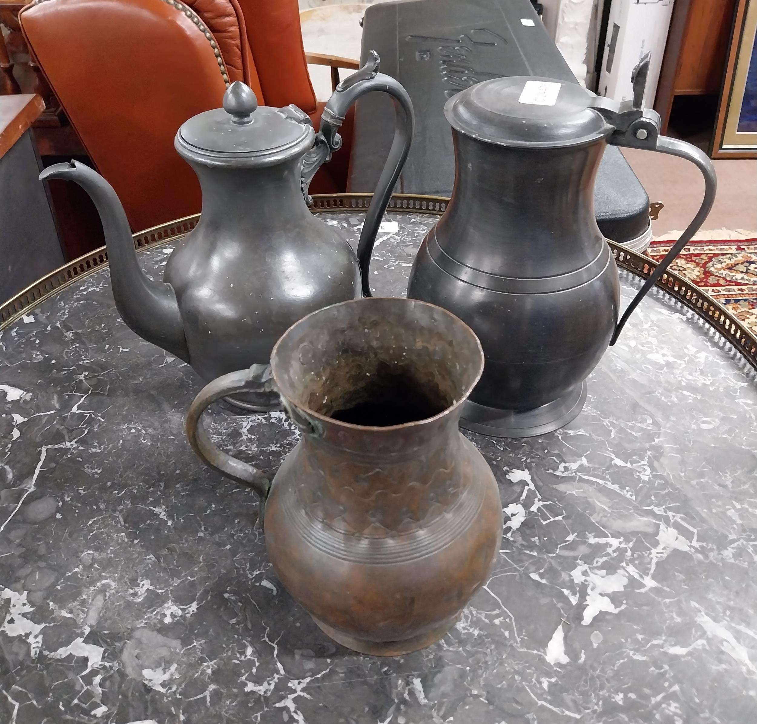 19th C. pewter flagon, tea pot and copper tankard. {22 cm H x 14 cm Dia, 21 cm H x 12 cm Dia and 17 cm H x 12 cm Dia.