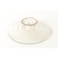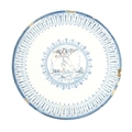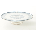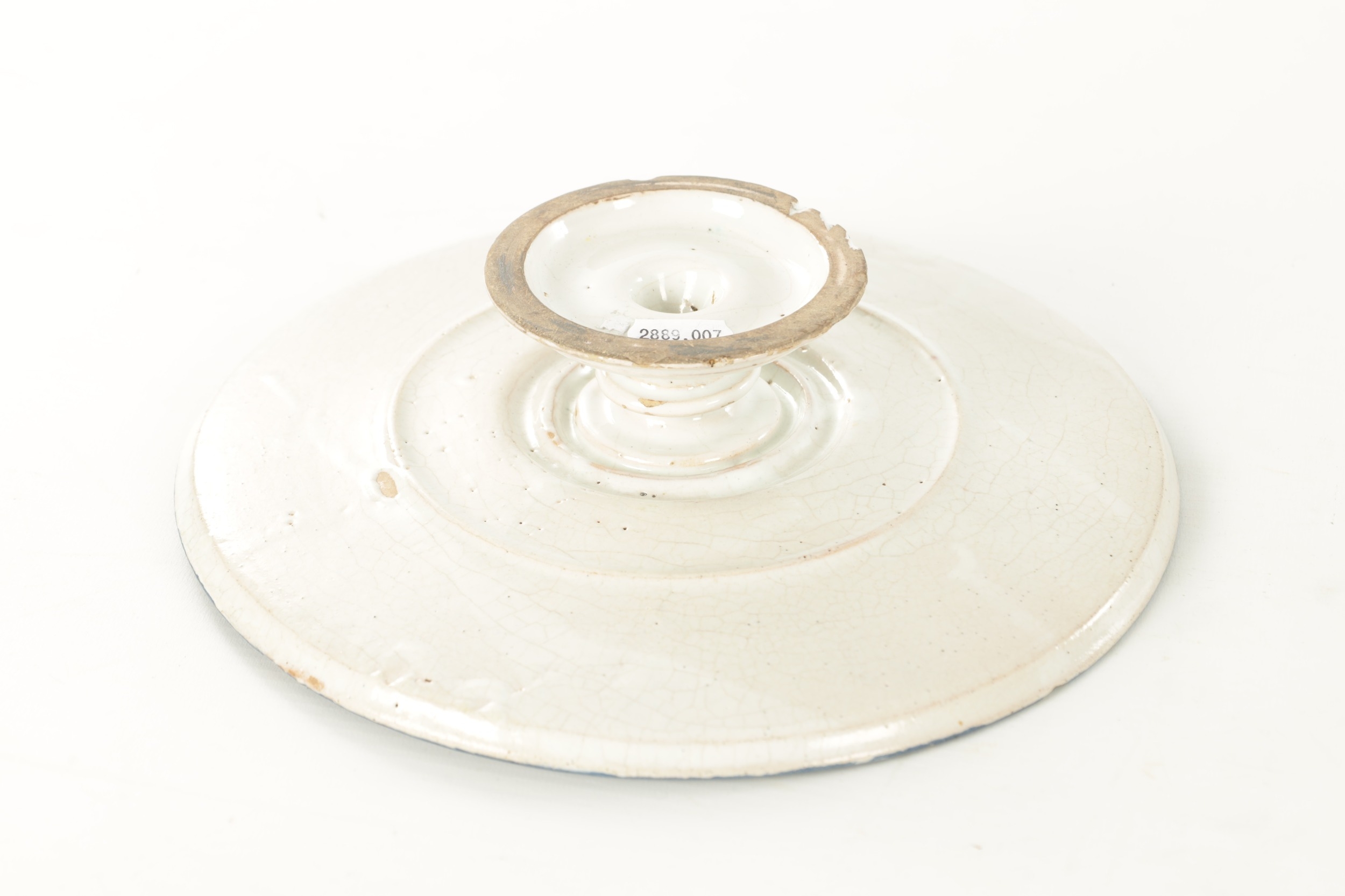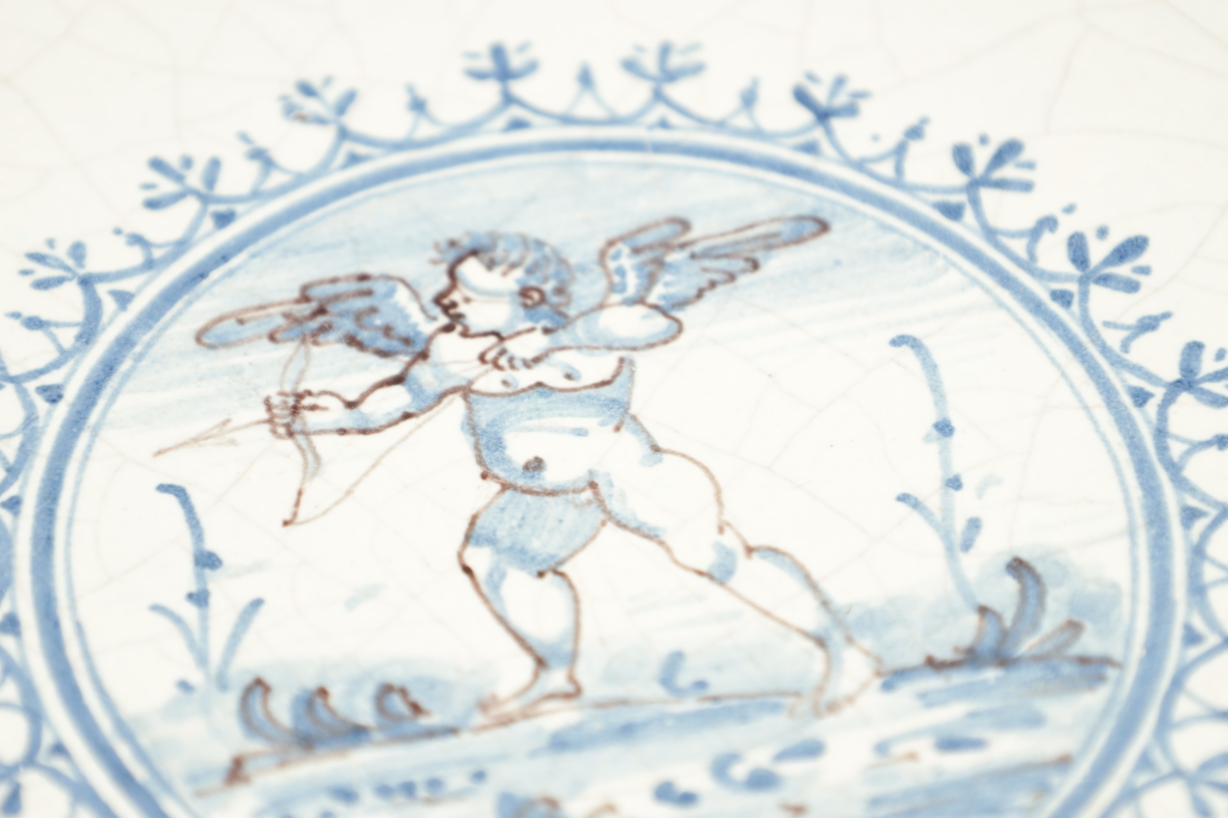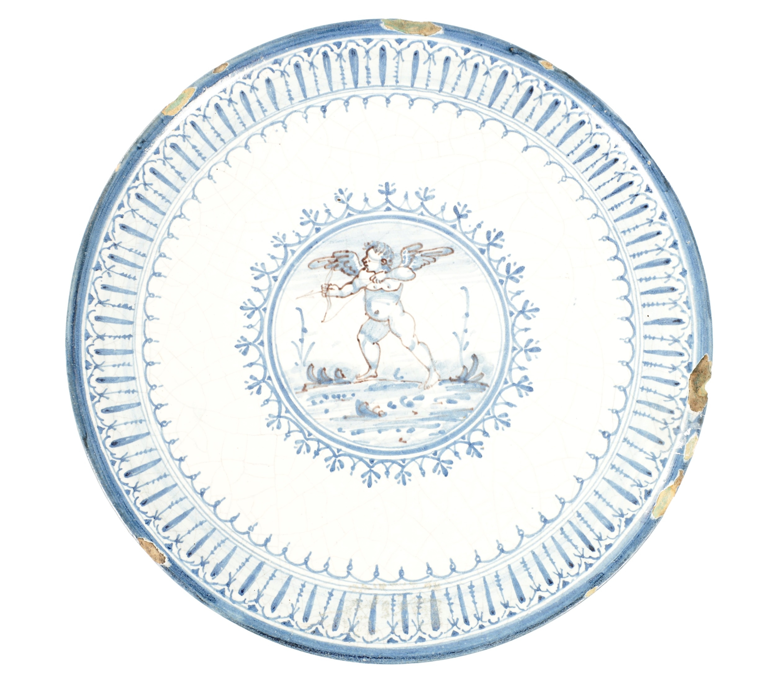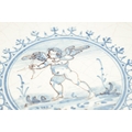 AN 18TH CENTURY DELFTWARE TAZZA with a central medallion depicting a cupid surrounded by blue decoration, with a stylised blue pattern to the border, all on a white ground, raised on a pedestal foot. (Diameter 26cm and 5.8cm high)