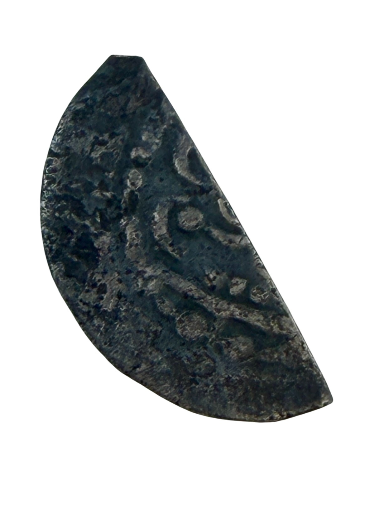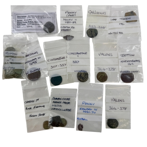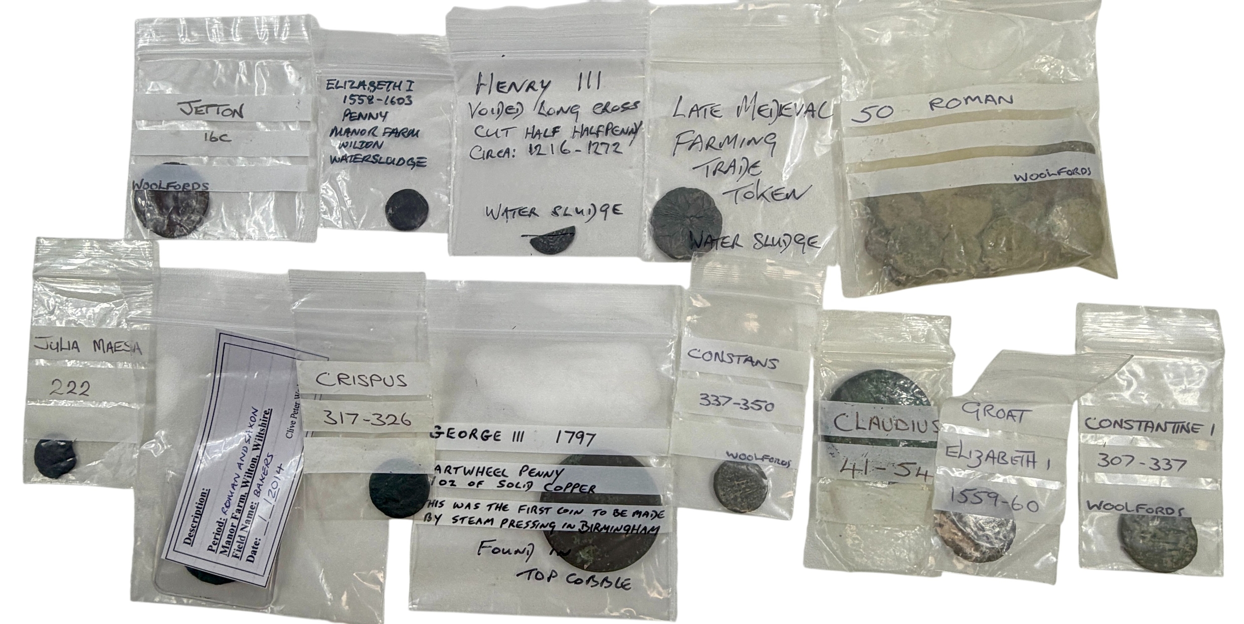 16th century Jetton, Henry III voided long cross, cut halfpenny circa 1216-1272, Elizabeth I Silver penny 1558-1603, Roman and Saxon coin, Late Medieval farming trade token, Claudius coin 41-54, Constantine I 307-337, Elizabeth I Silver groat 1559-60, george 1797 penny Cartwheel, Constans 337-350 coin, Julia Maesa coin 227, Crispus coin 317-326.
