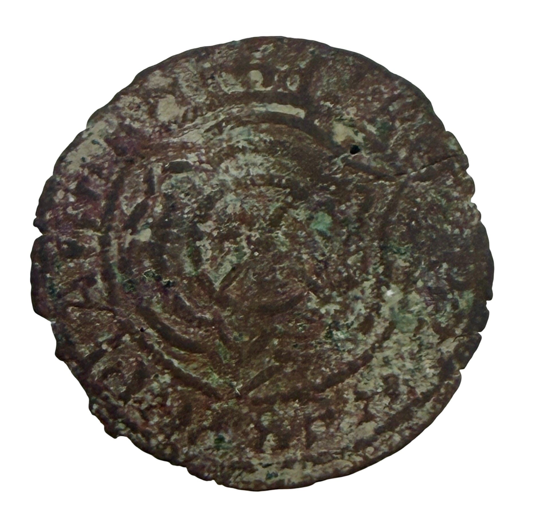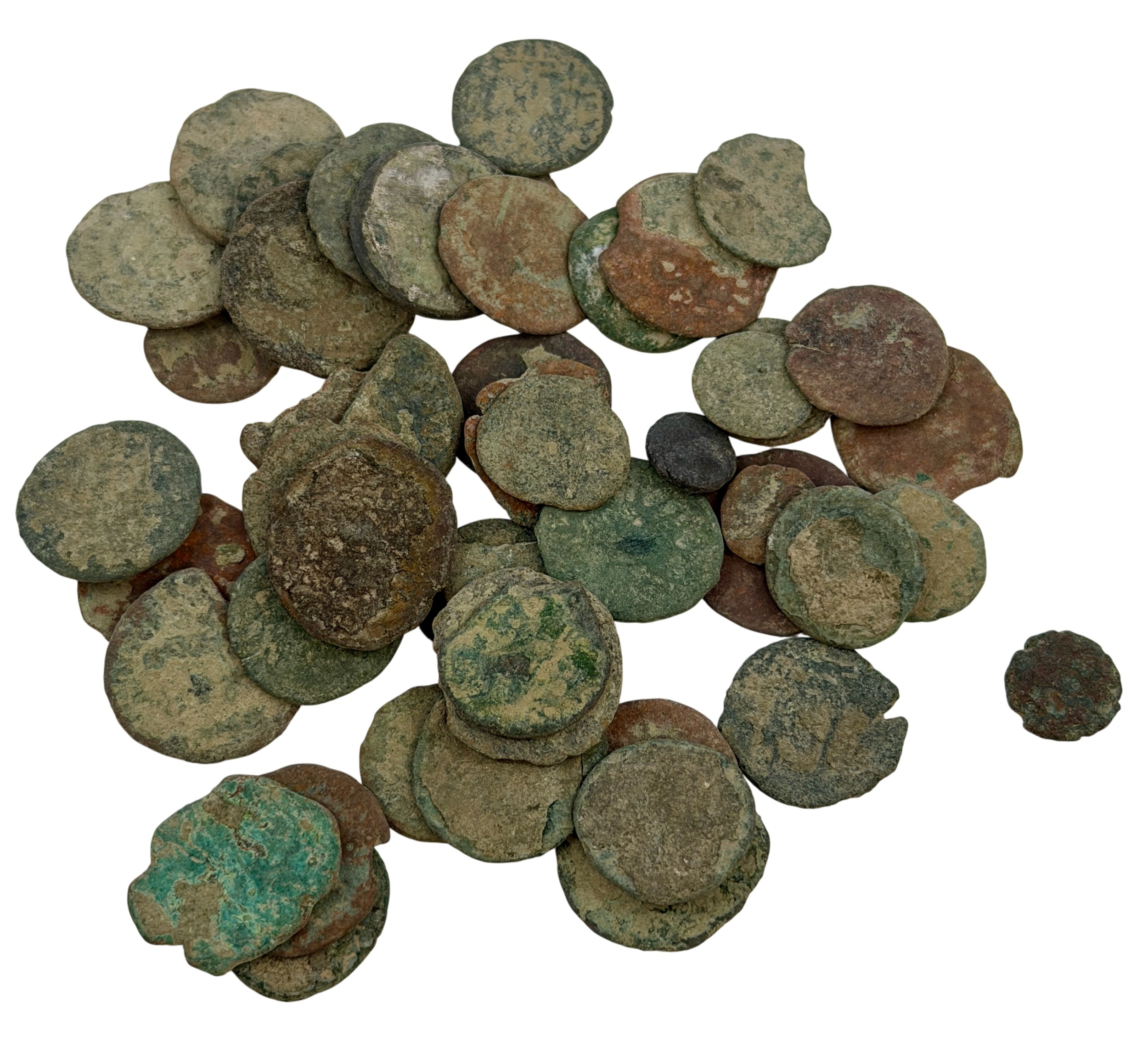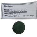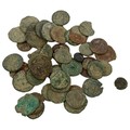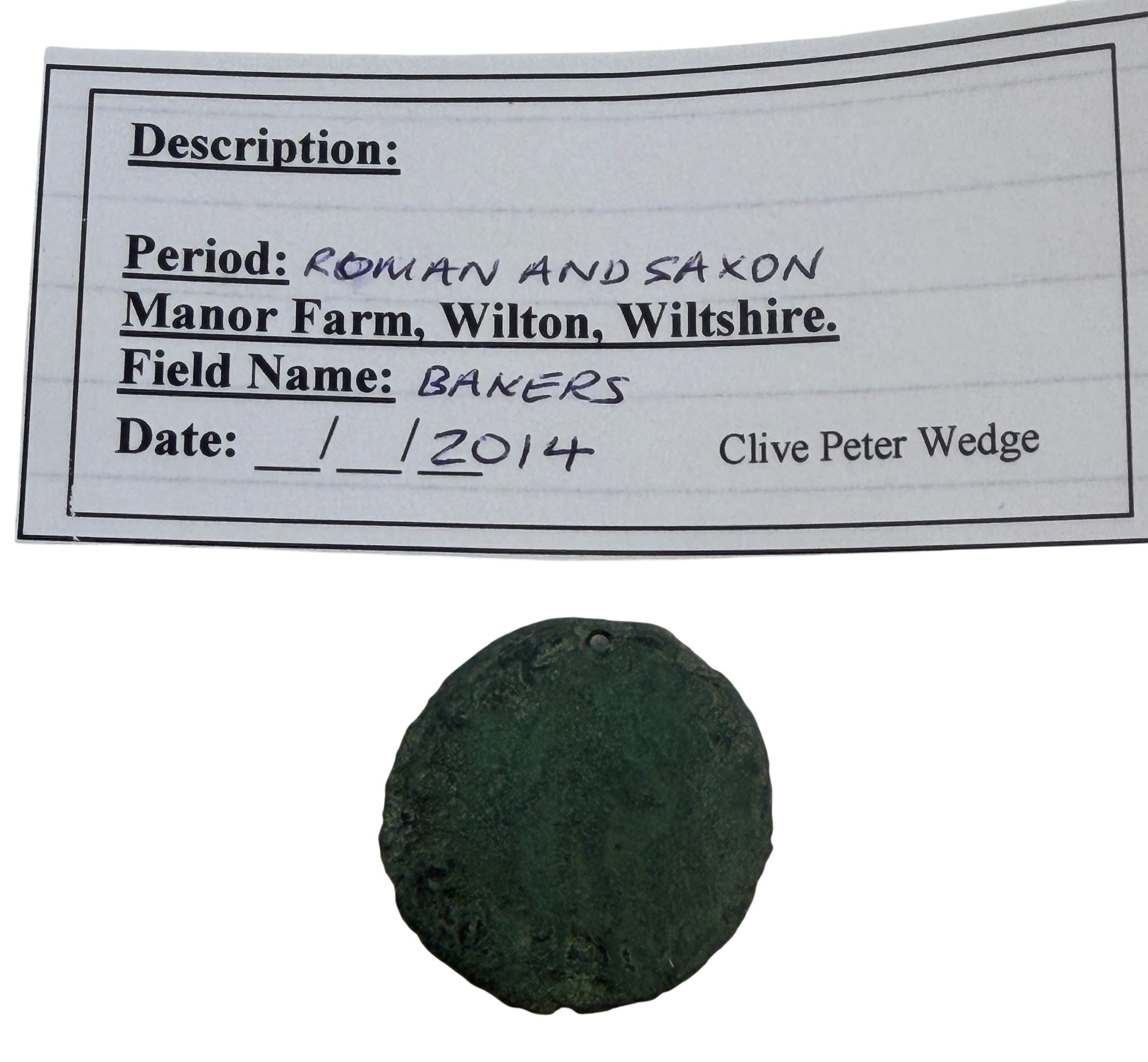 16th century Jetton, Henry III voided long cross, cut halfpenny circa 1216-1272, Elizabeth I Silver penny 1558-1603, Roman and Saxon coin, Late Medieval farming trade token, Claudius coin 41-54, Constantine I 307-337, Elizabeth I Silver groat 1559-60, george 1797 penny Cartwheel, Constans 337-350 coin, Julia Maesa coin 227, Crispus coin 317-326.