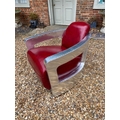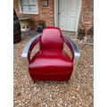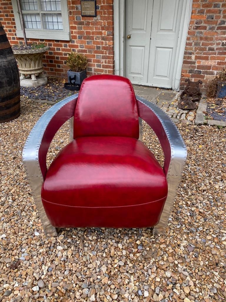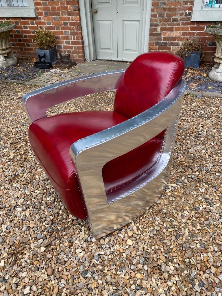 A STYLISH RED LEATHER AND ALUMINIUM AVIATION ARMCHAIR. (74cm...
