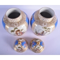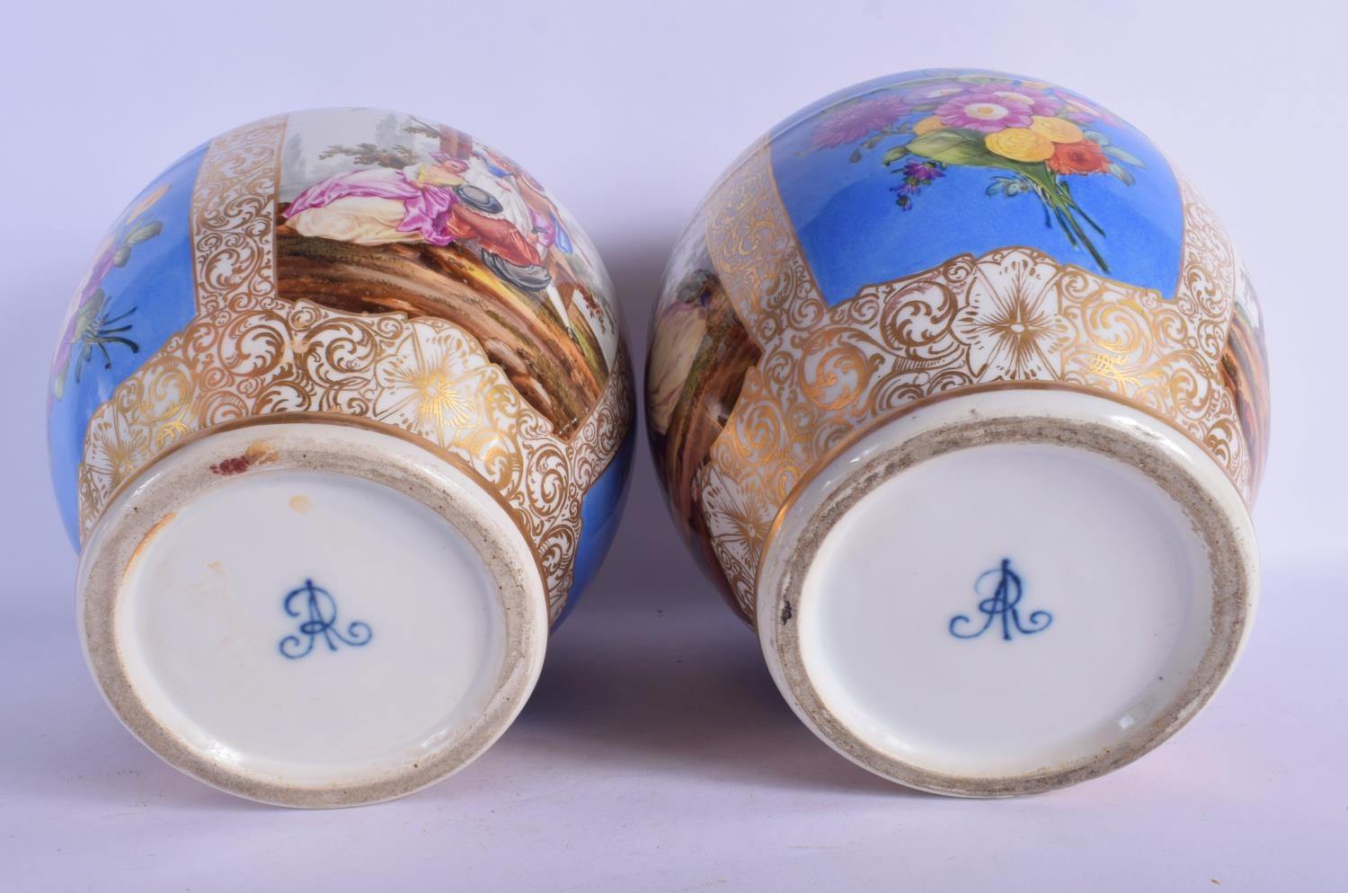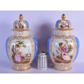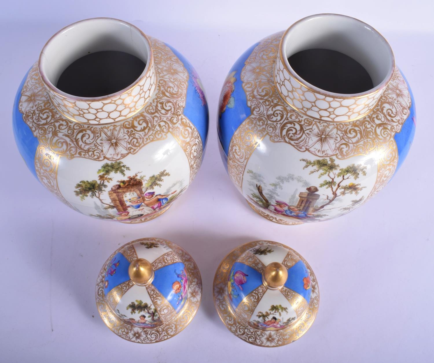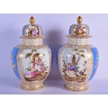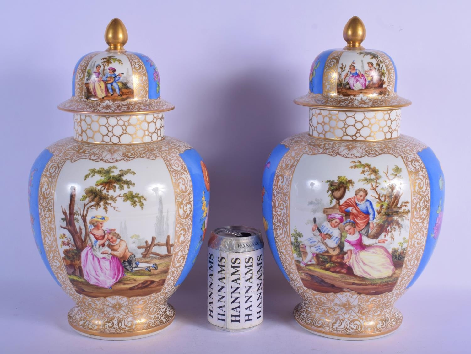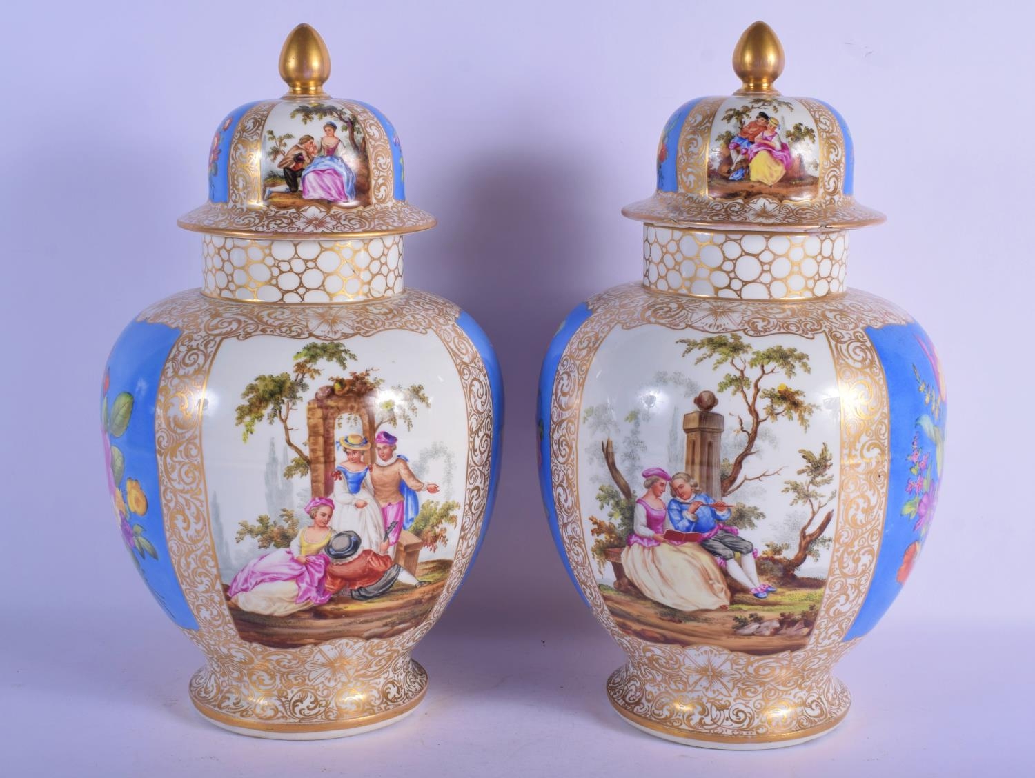 A LARGE PAIR OF 19TH CENTURY GERMAN AUGUSTUS REX VASES AND COVERS painted with lovers. 37 cm x 18 cm.