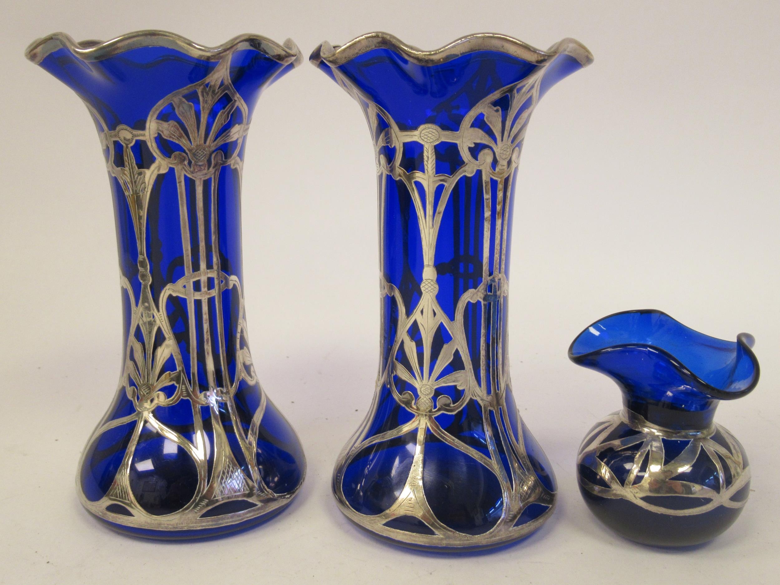 A pair of early 20thC blue glass vases of waisted and part bulbous cylindrical form, having flared, wavy rims, overlaid in Art Nouveau taste with silver/white metal 6"h; and a smaller, more modern blue glass bulbous vase with similar ornament 2.5"h