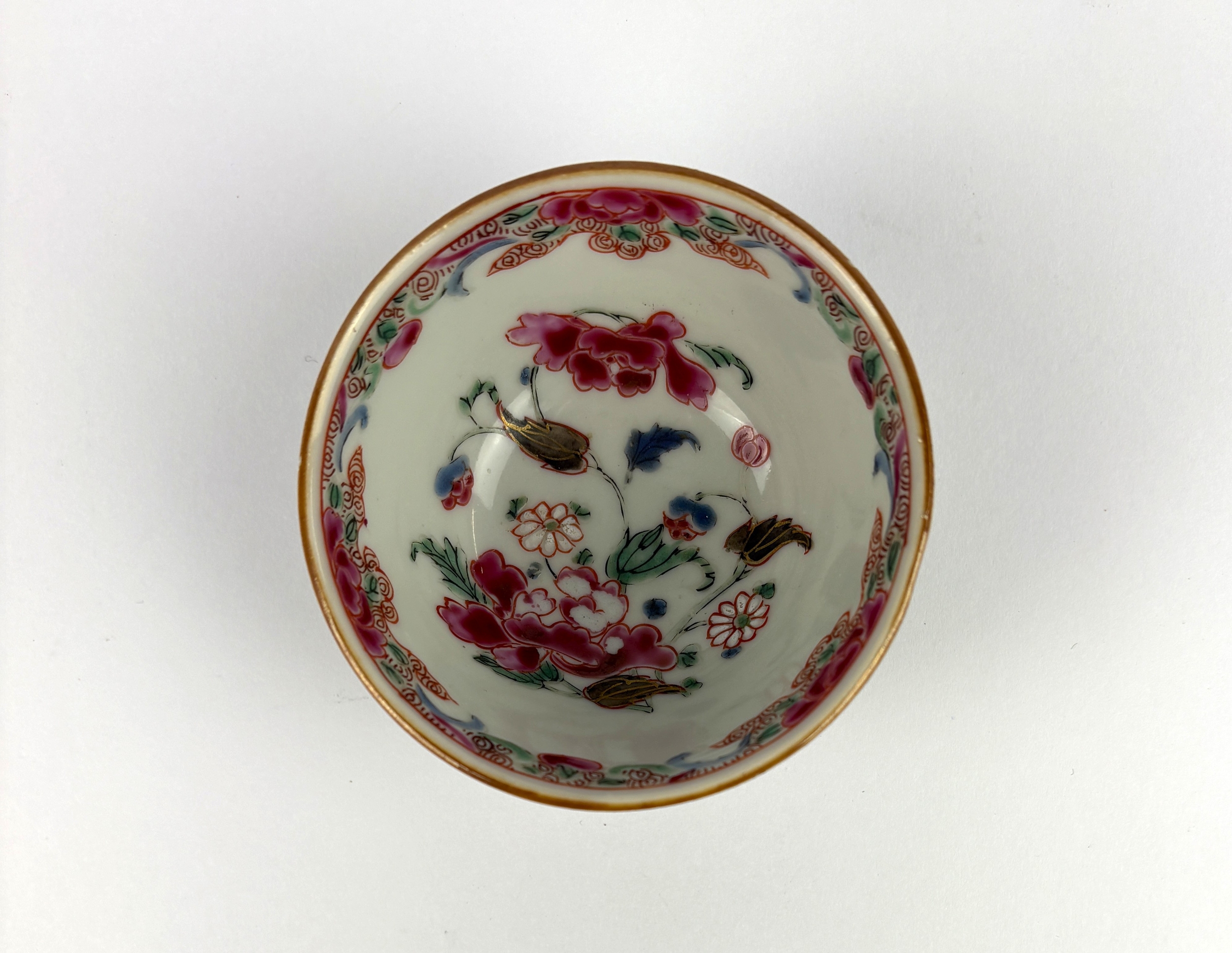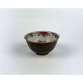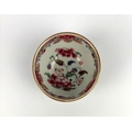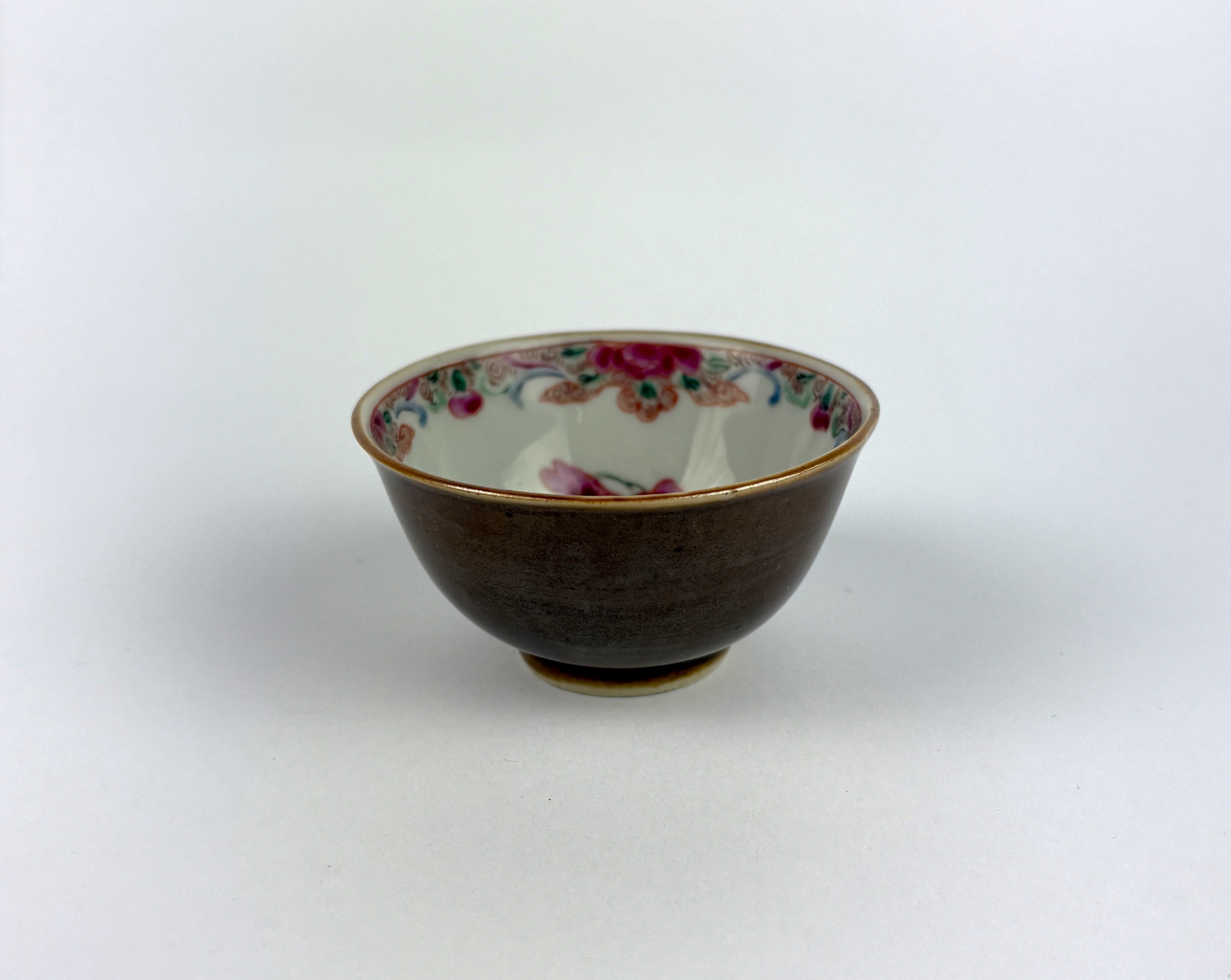 An antique Chinese porcelain tea bowl, probably c.1760, painted with a famille rose interior depicting delicate flowers and foliage, and with a cafe-au-lait exterior, 7.5cm diameter by 4cm high.