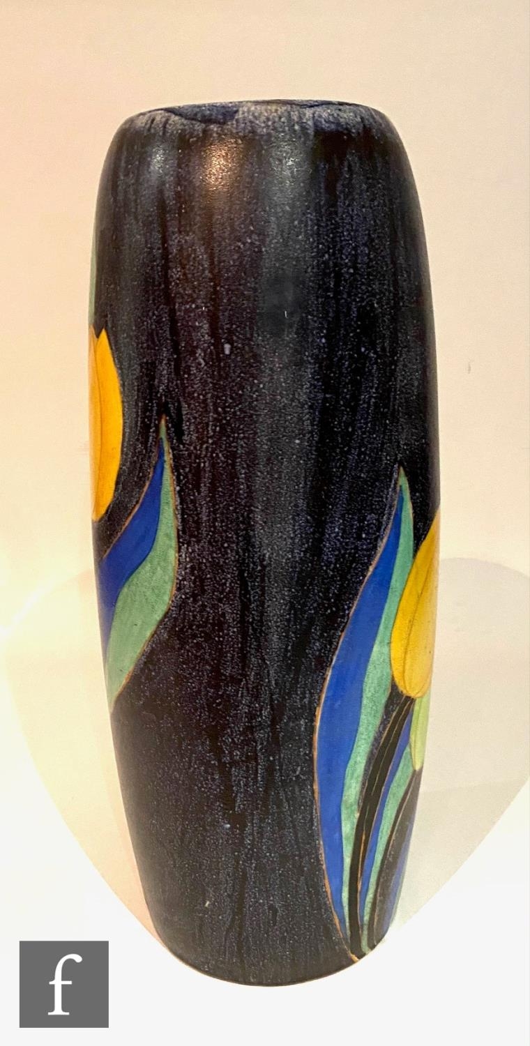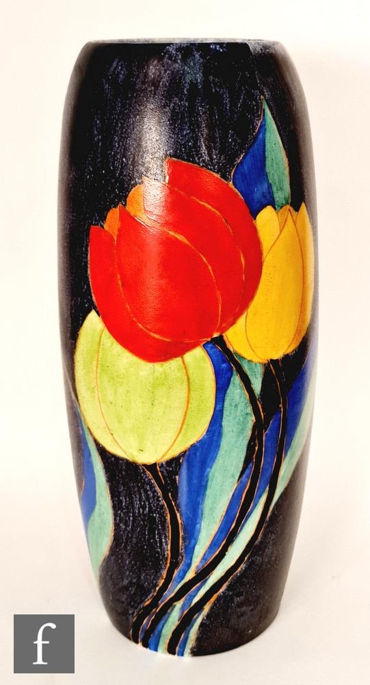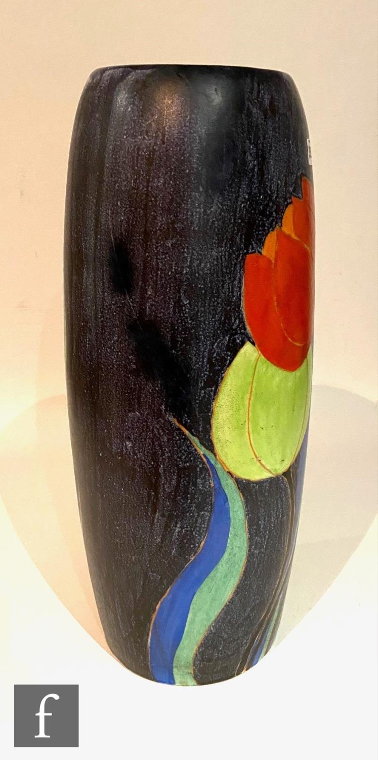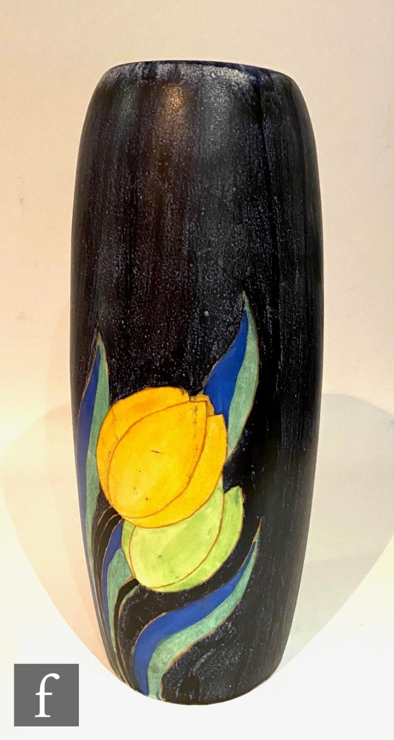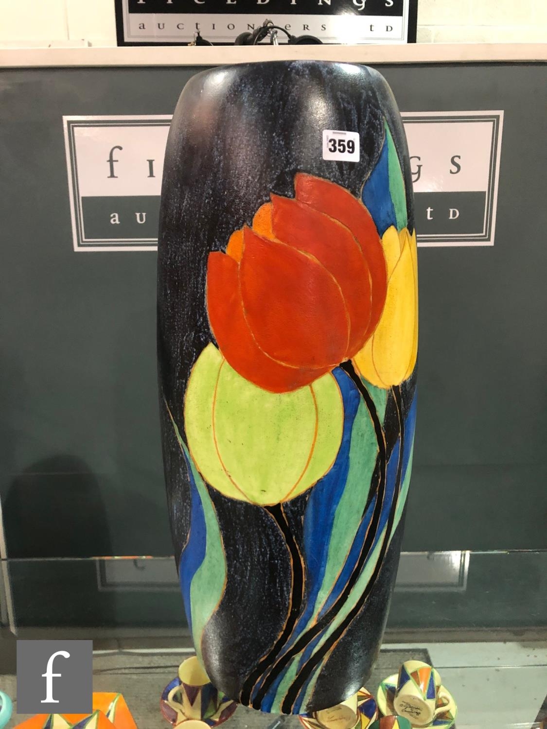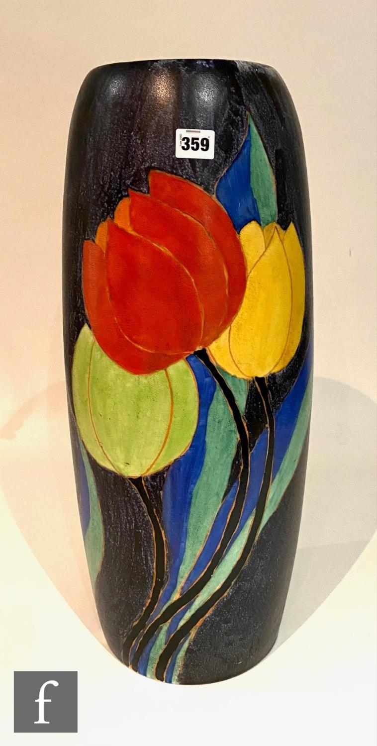 Clarice Cliff - Inspiration Clovre Tulip - A large umbrella stand circa 1930, of swollen cylindrical form, hand painted with three large tulip blooms and foliage over a mottled ink blue and pale blur ground, hand painted CLOVRE and Bizarre mark, height 61cm, A/F.