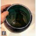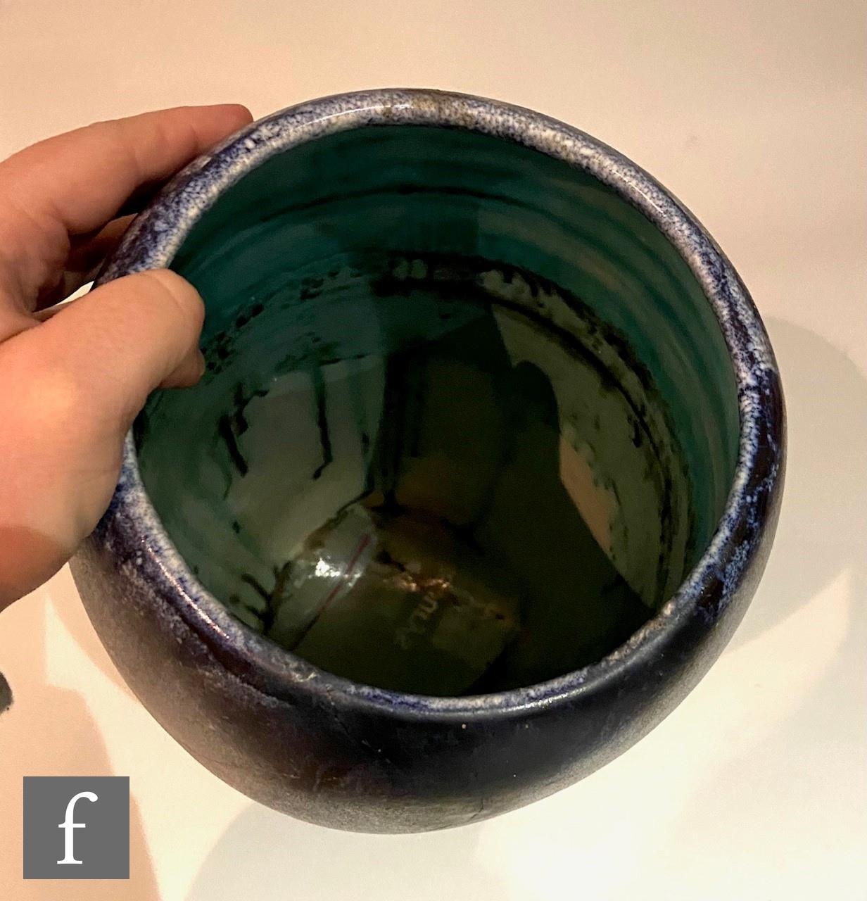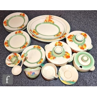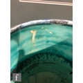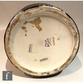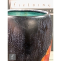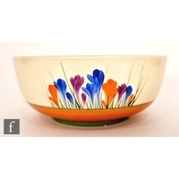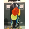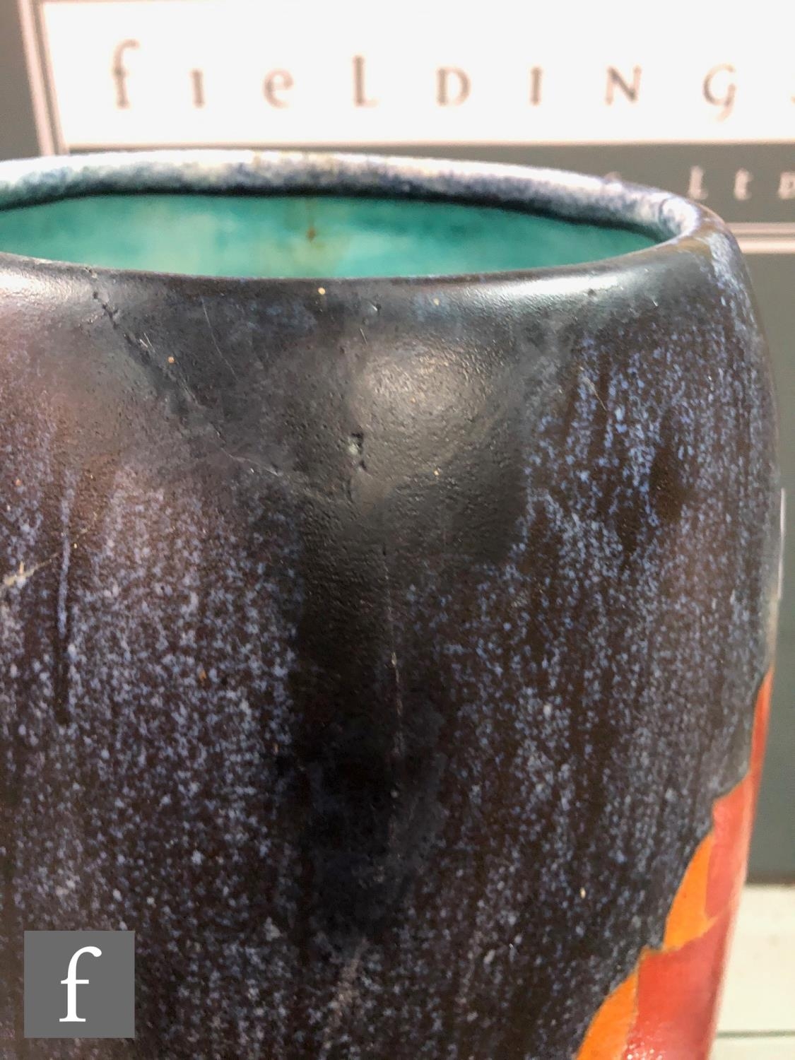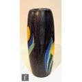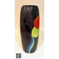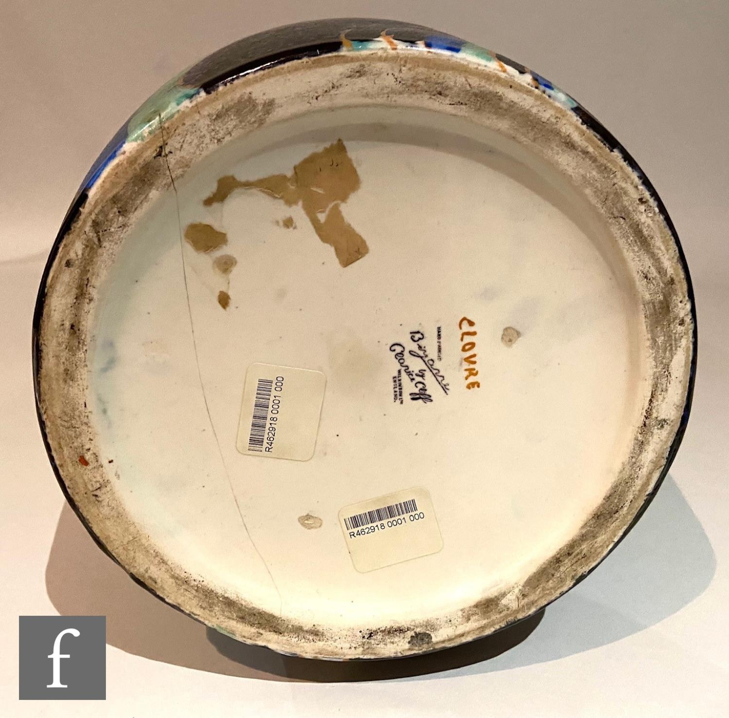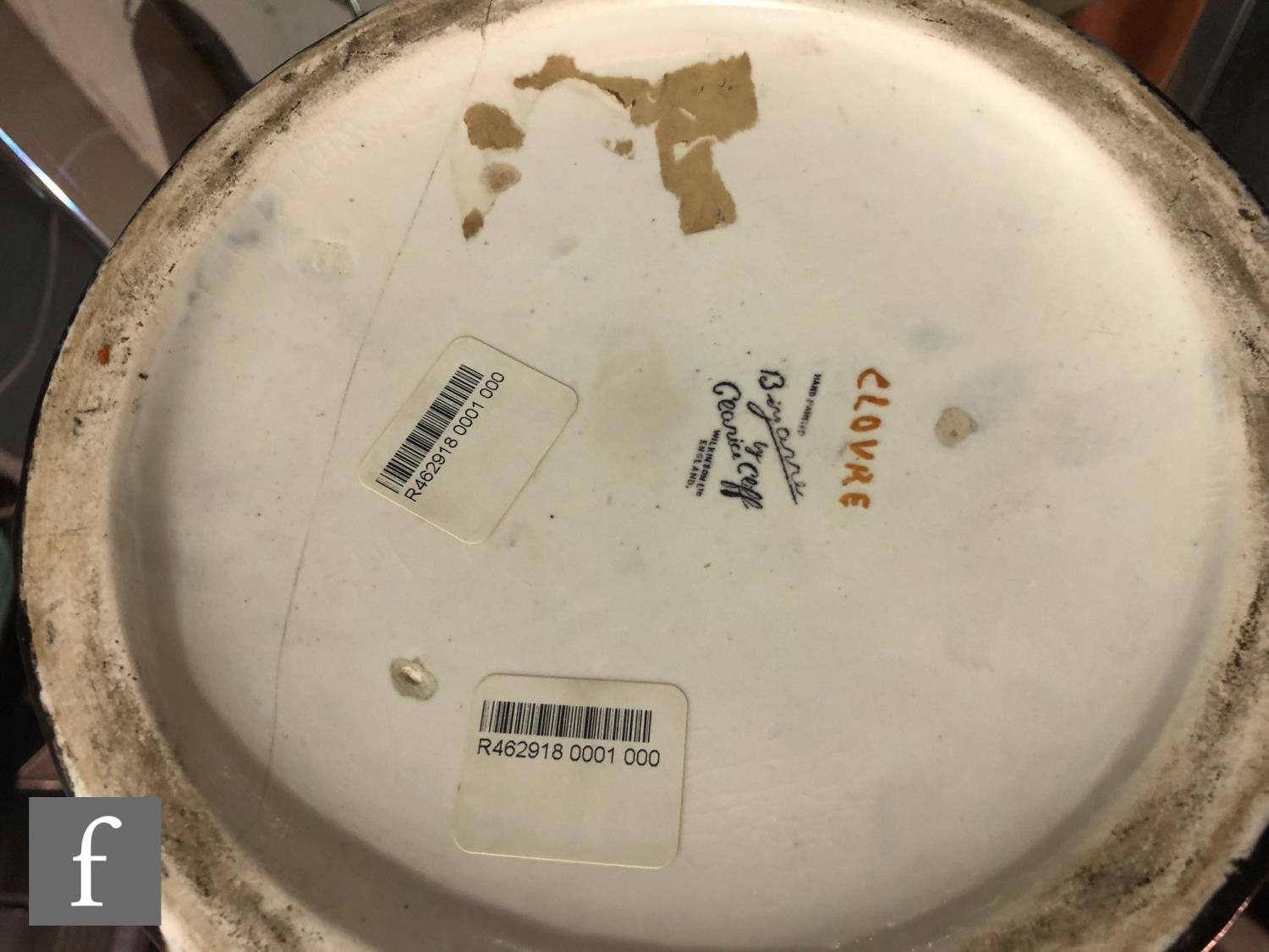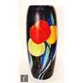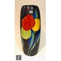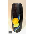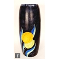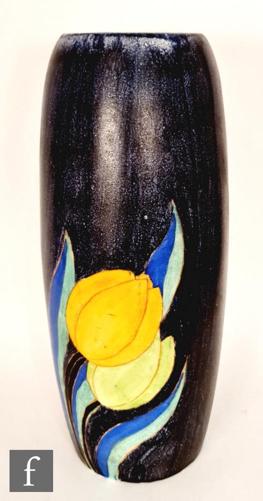 Clarice Cliff - Inspiration Clovre Tulip - A large umbrella stand circa 1930, of swollen cylindrical form, hand painted with three large tulip blooms and foliage over a mottled ink blue and pale blur ground, hand painted CLOVRE and Bizarre mark, height 61cm, A/F.