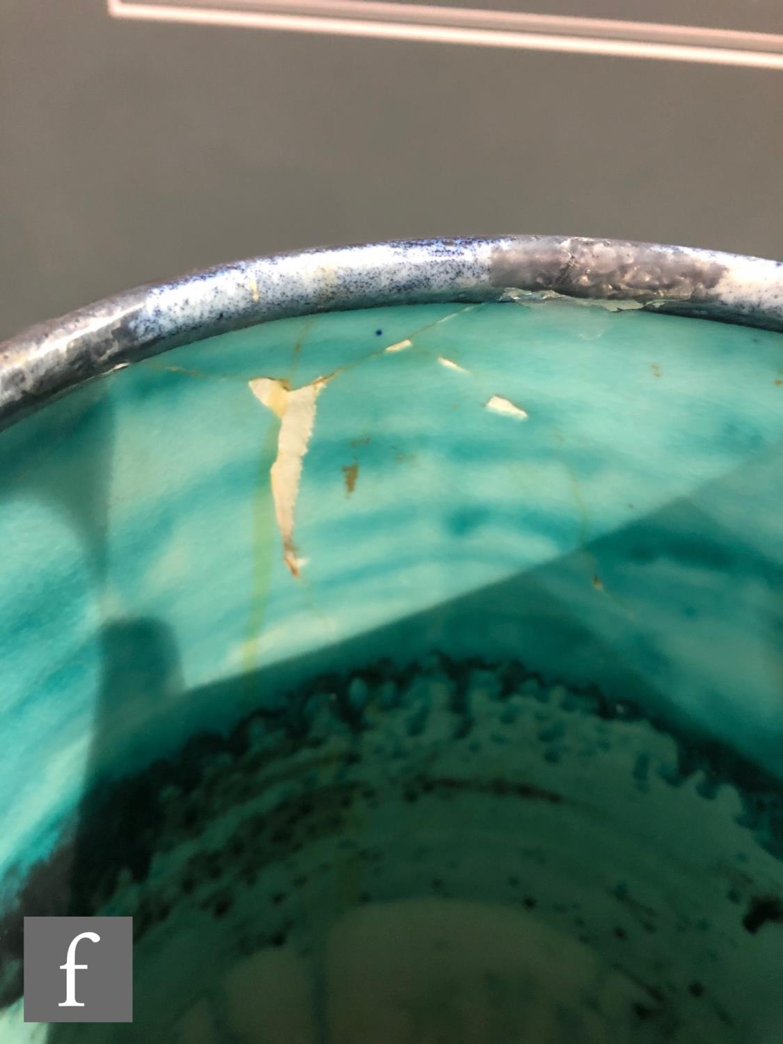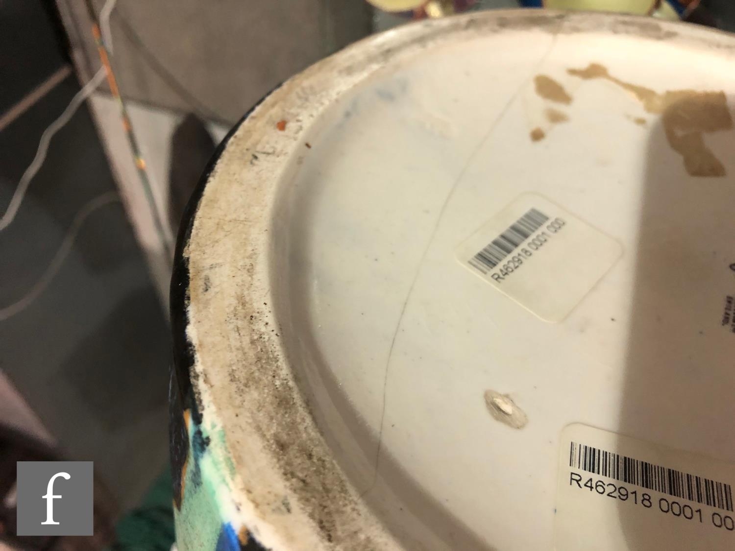 There has been a break to the body resulting in the umbrella stand having been half and re-glued back in place. The repair is partial and of an average standard but the cracks is visible through the body and the base and there is a small amount of material missing to the interior upper rim.