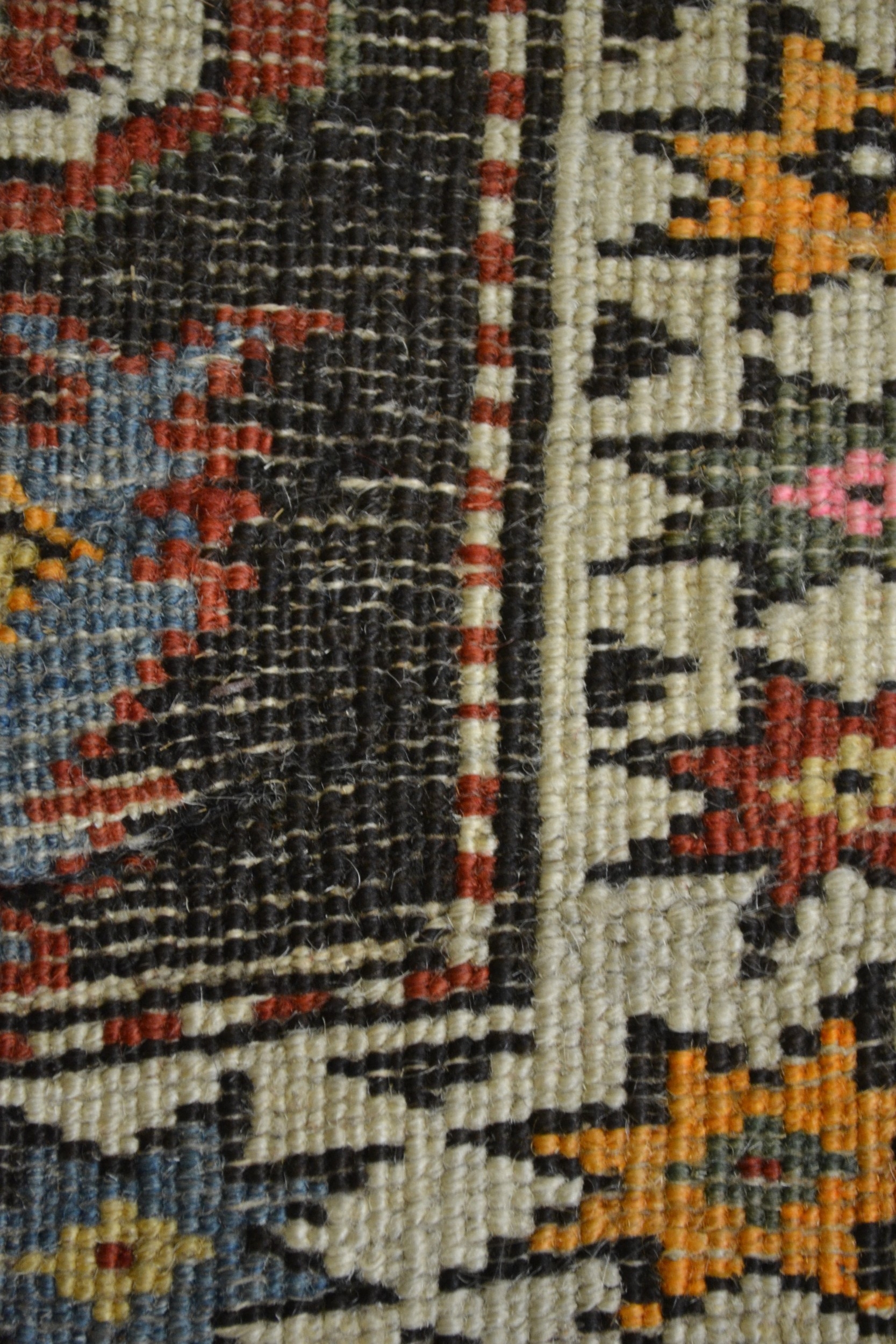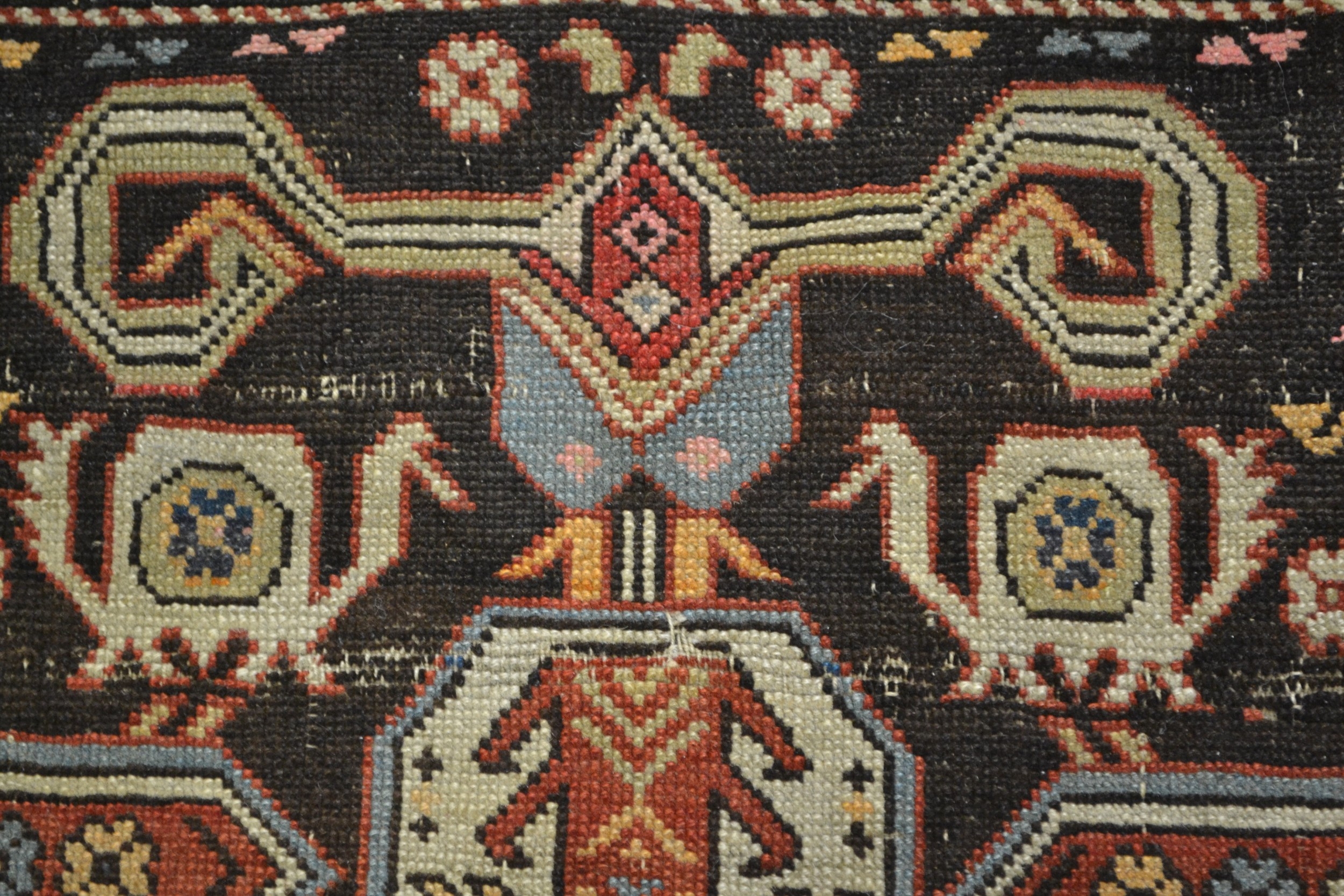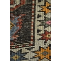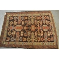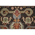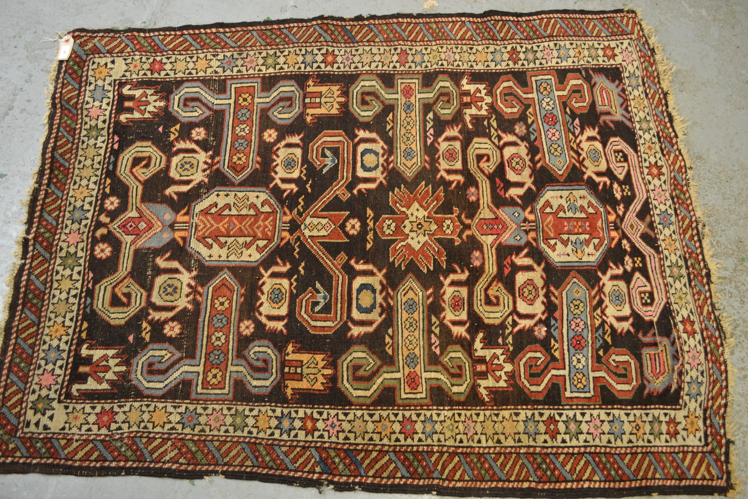 Kazak rug with stylised ram's horn and geometric designs on a brown ground with twin border, 140 x 106cm approximately