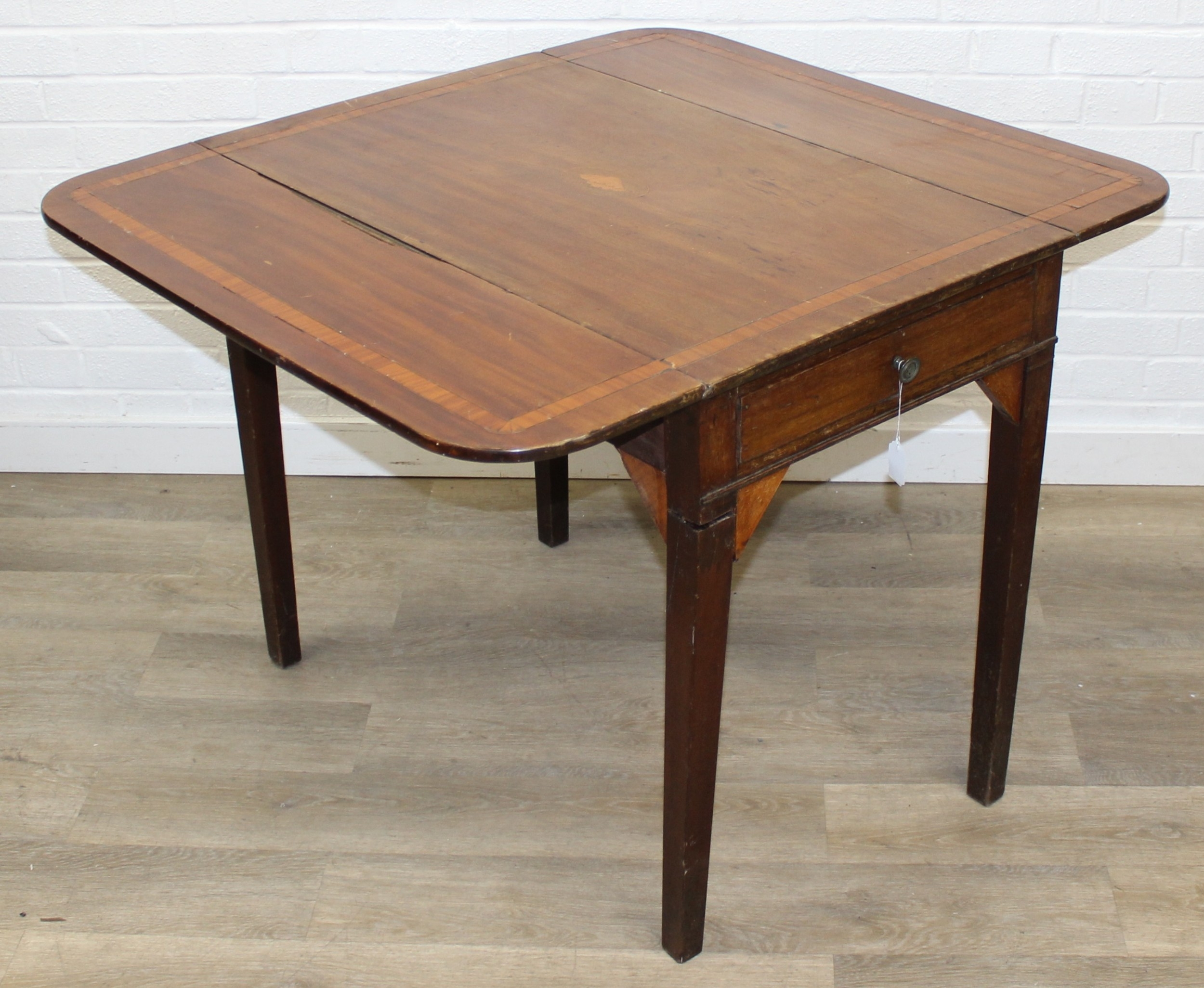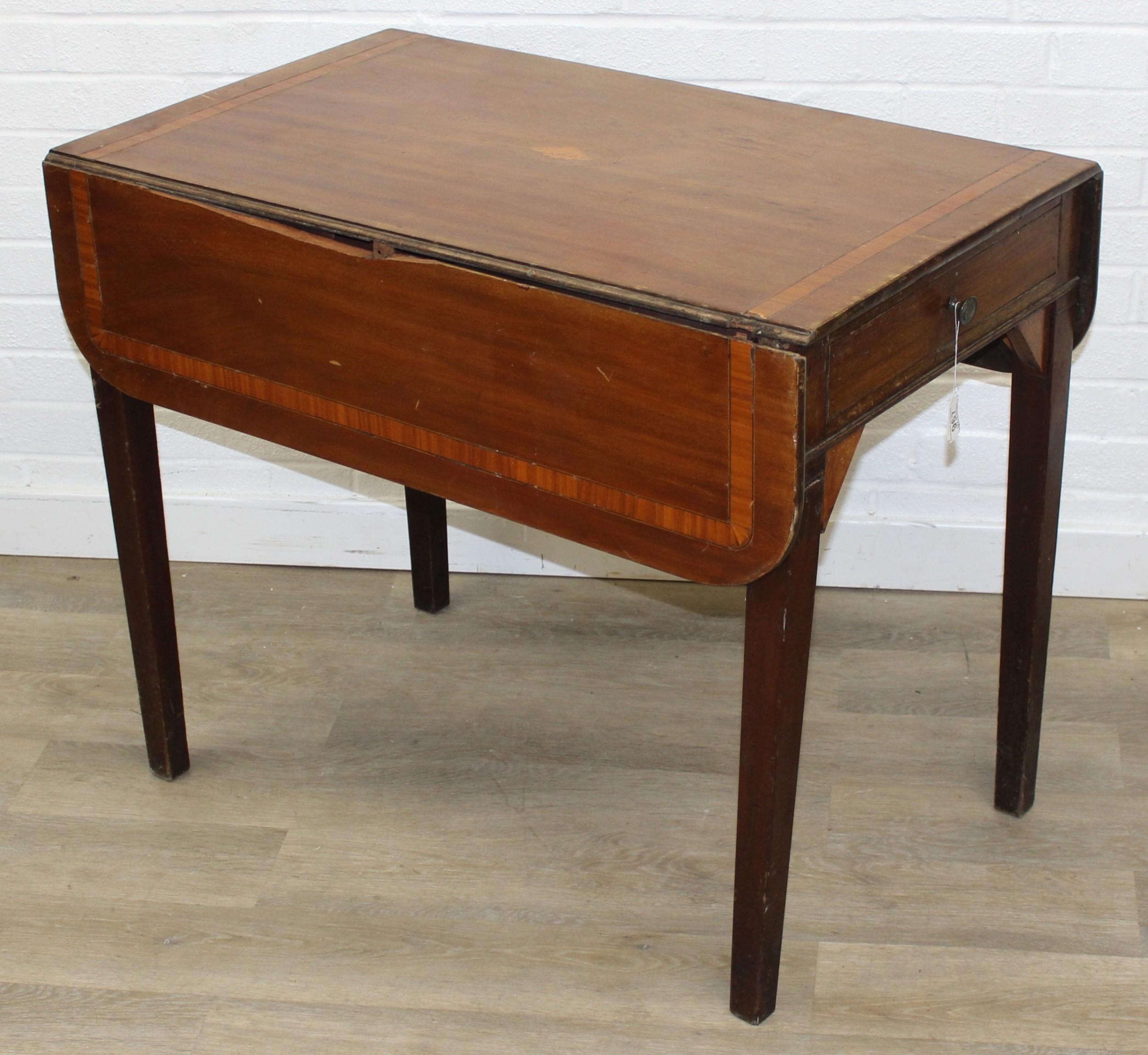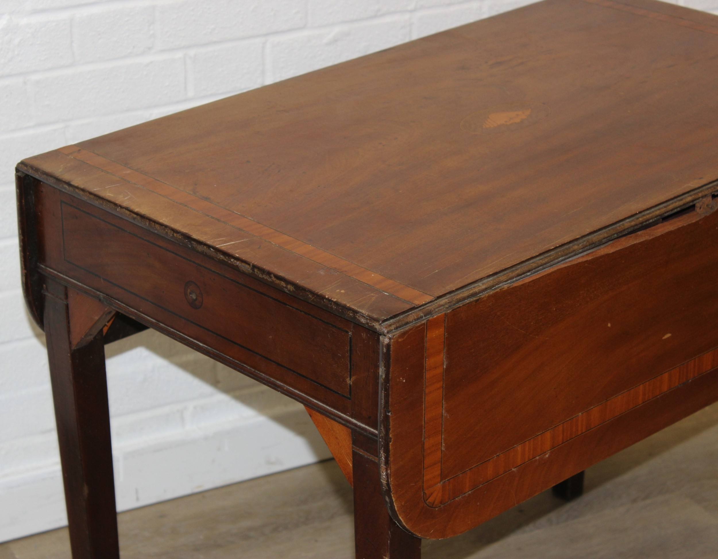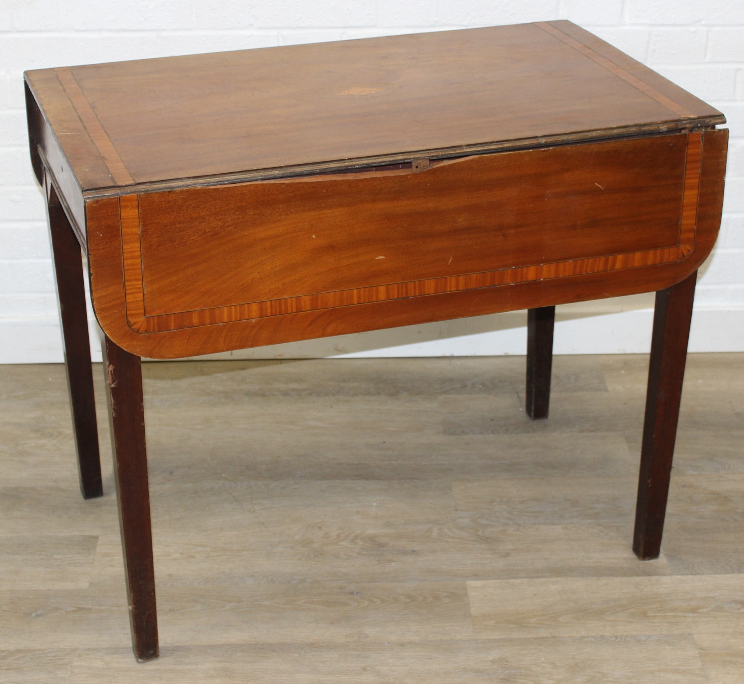 An antique mahogany Pembroke dropleaf table with shell inlaid details, 91cm x 56cm x 74cm extending to 104cm