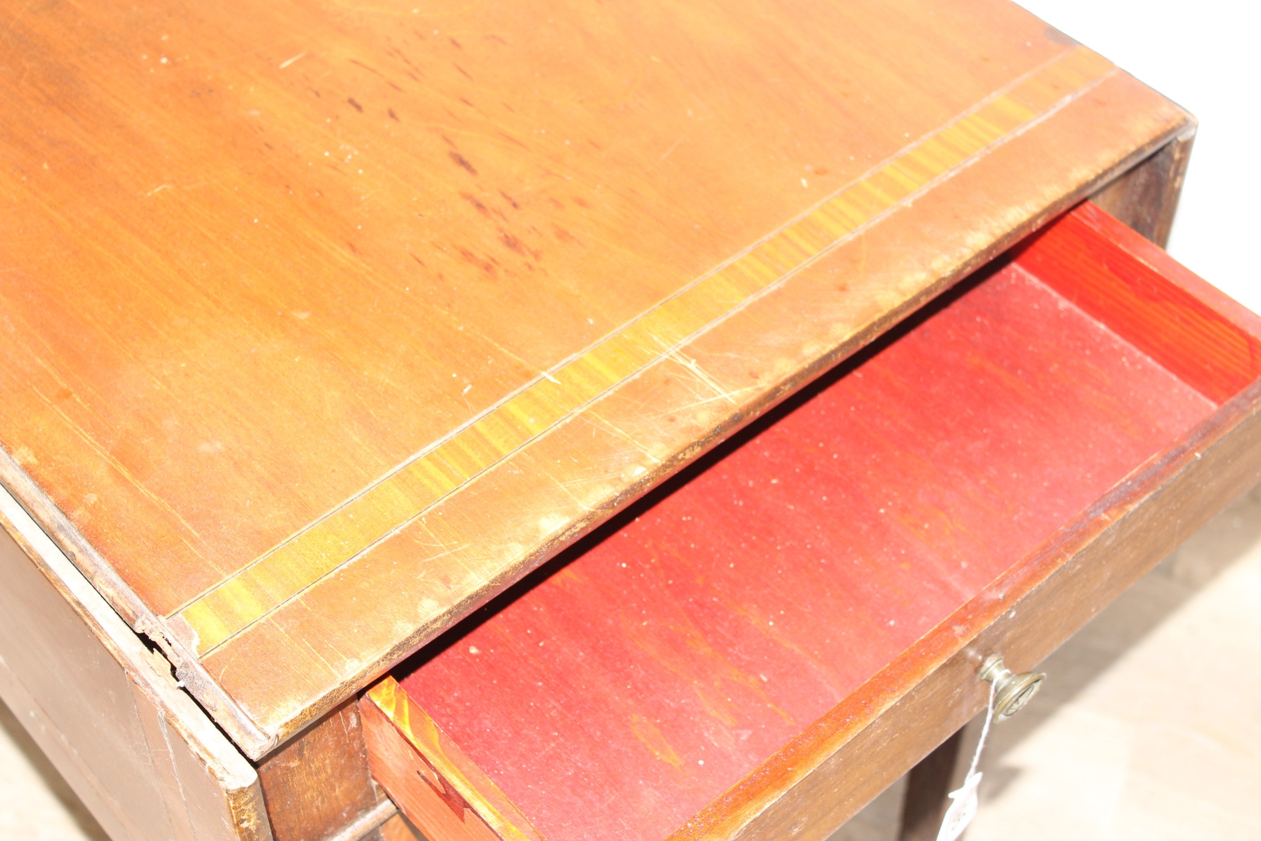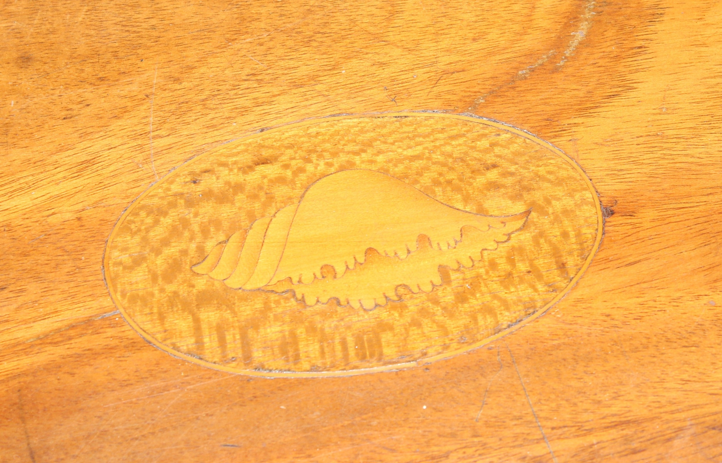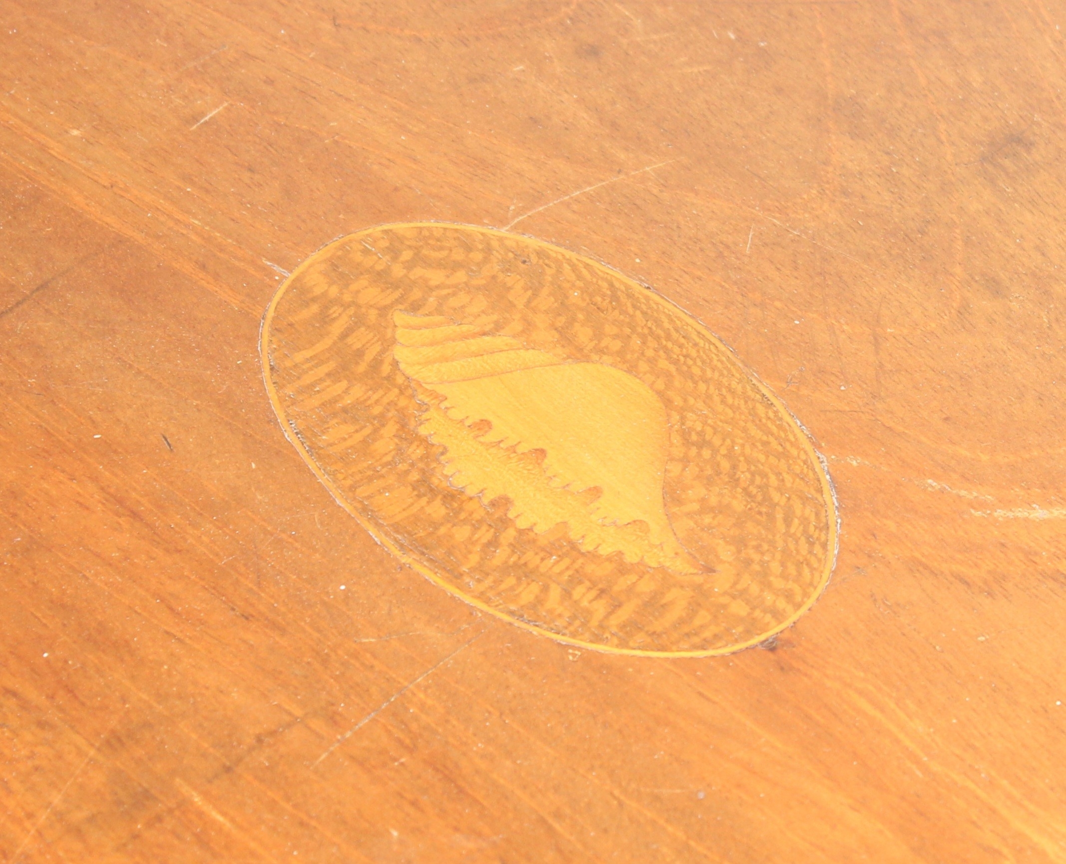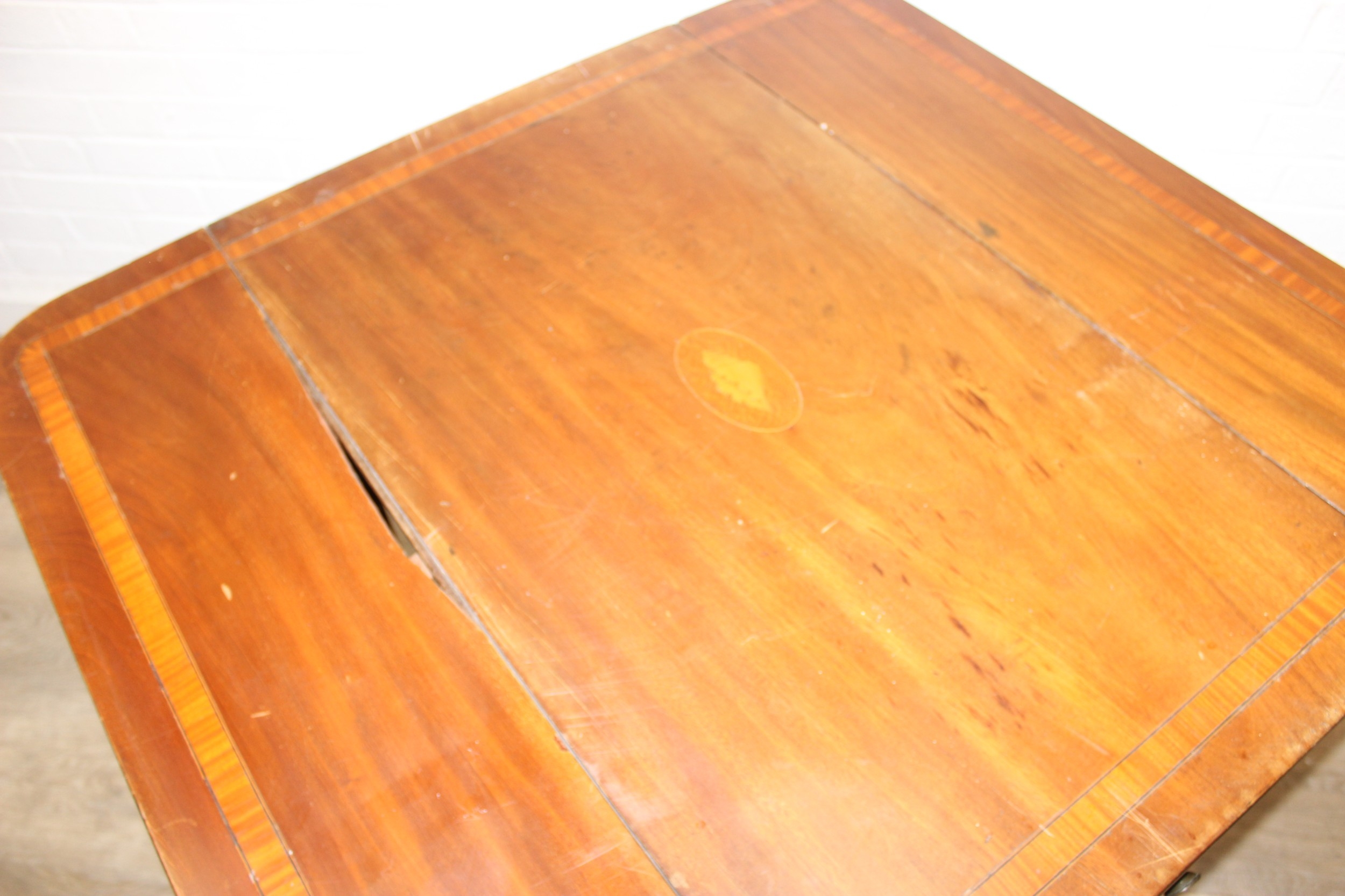 An antique mahogany Pembroke dropleaf table with shell inlaid details, 91cm x 56cm x 74cm extending to 104cm
