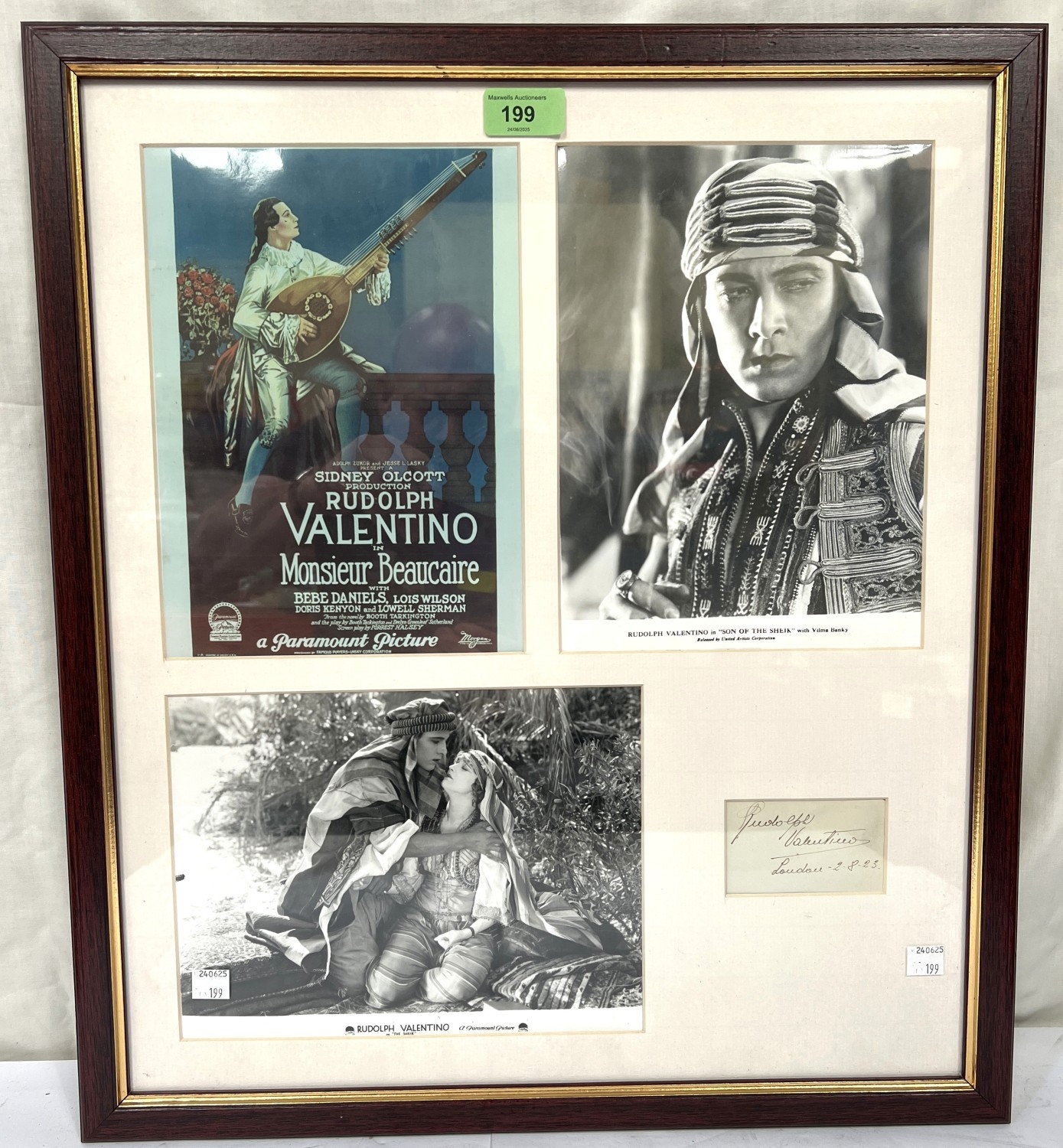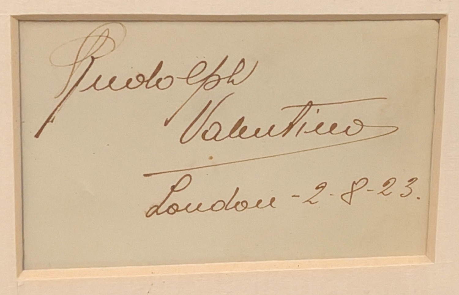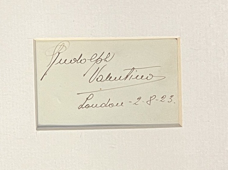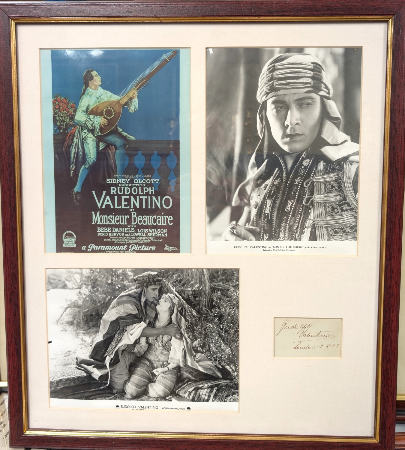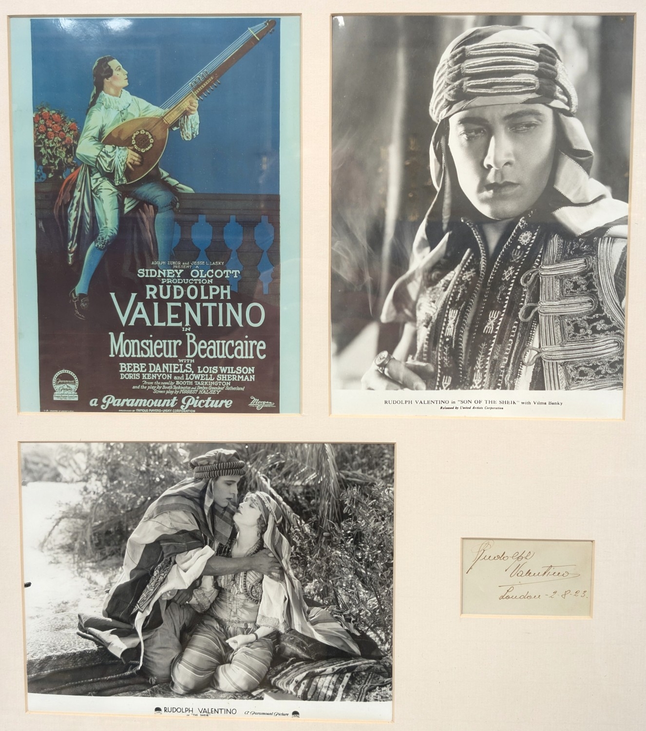 Valentino, Rudolph: (1895-1926), Itialian Silent Film actor signature dated 2.8.23, in pen framed with three publicity shots