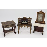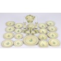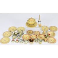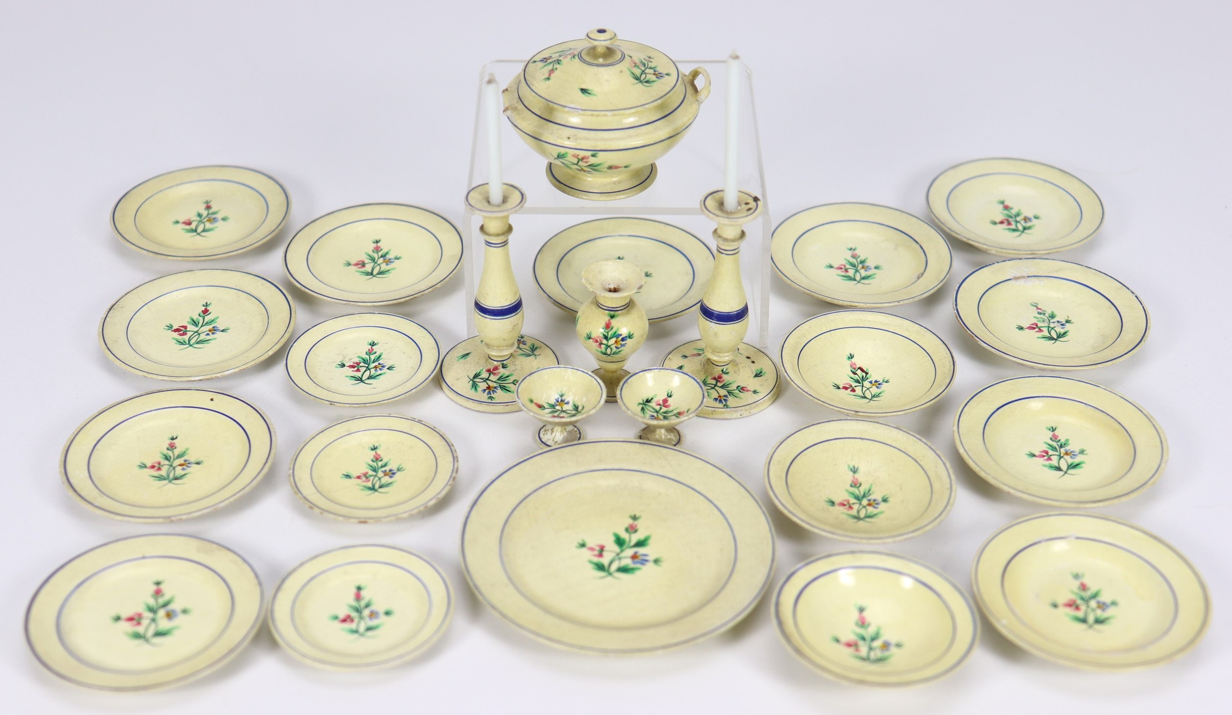 A pretty set of finely carved wooden tableware, German mid 19th century, all painted in cream with blue trim and flower decoration, comprising six dinner plates, five soup plates, three bowls, round platter, tureen with lid, two candle sticks, vase and two bowls for condiments, platter 2 3/4" (6.5cm), (condition: excellent, tureen lacks one handle), (lot).
