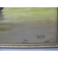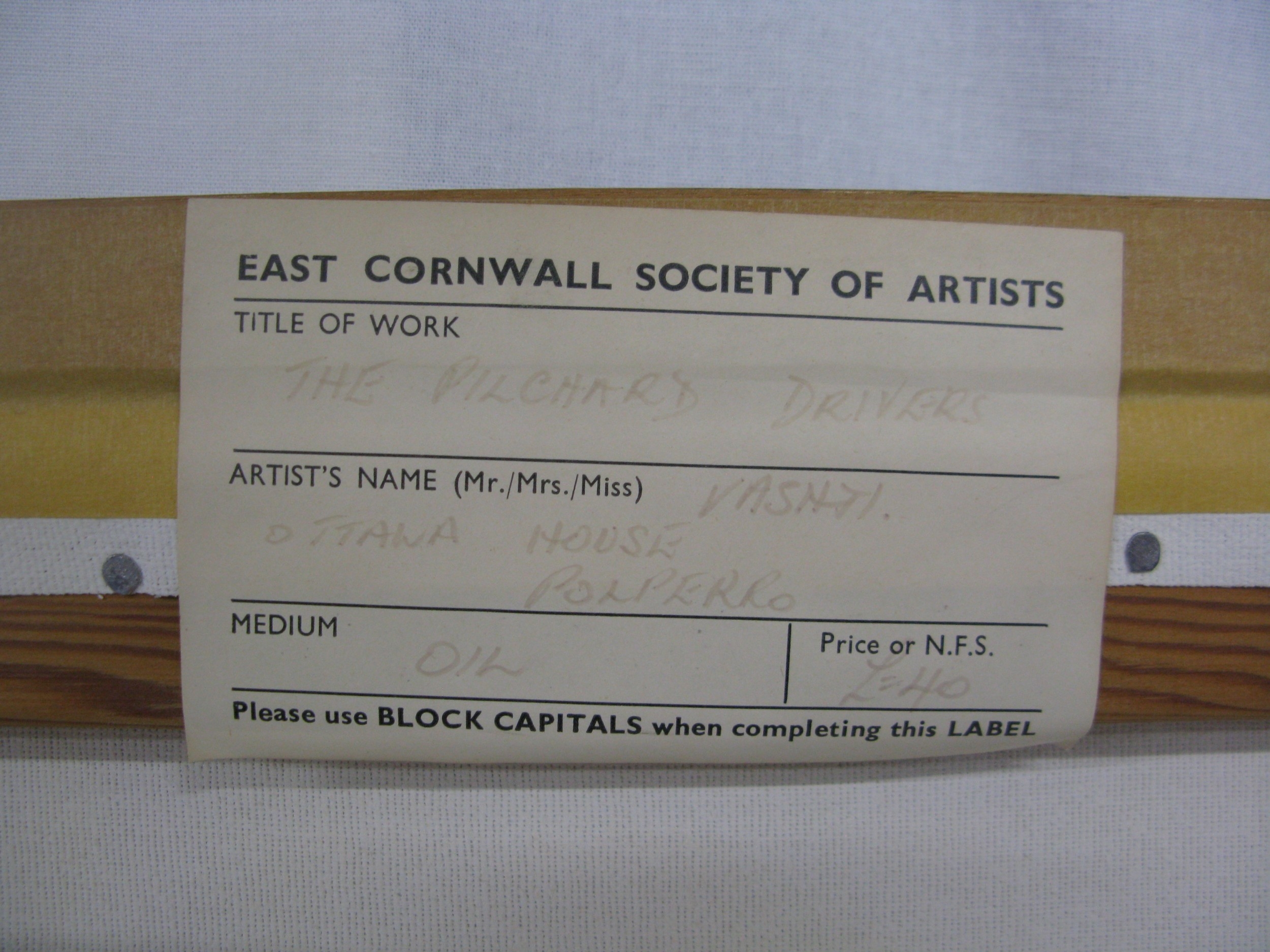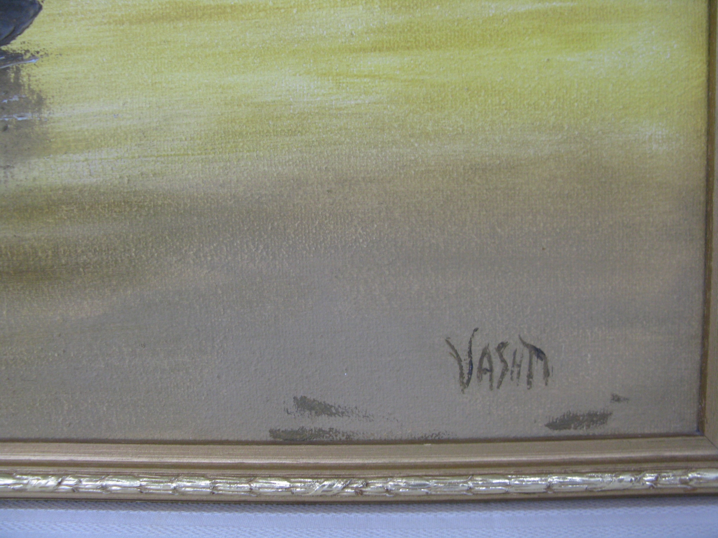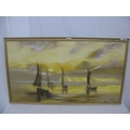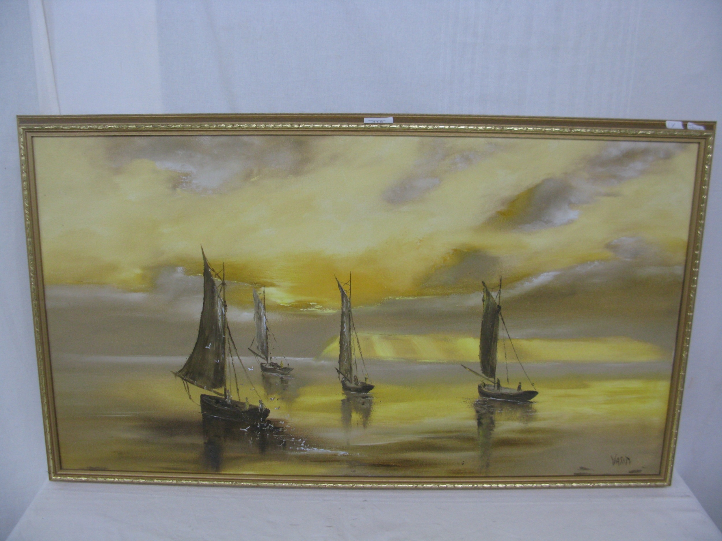 Vashti (possibly Vashti Trudeau) oil on canvas of four sailing boats at sunset, signed bottom right Vashti and titled on verso The Pilchard Drivers - 90.5cm x 49.5cm in unglazed gilt frame