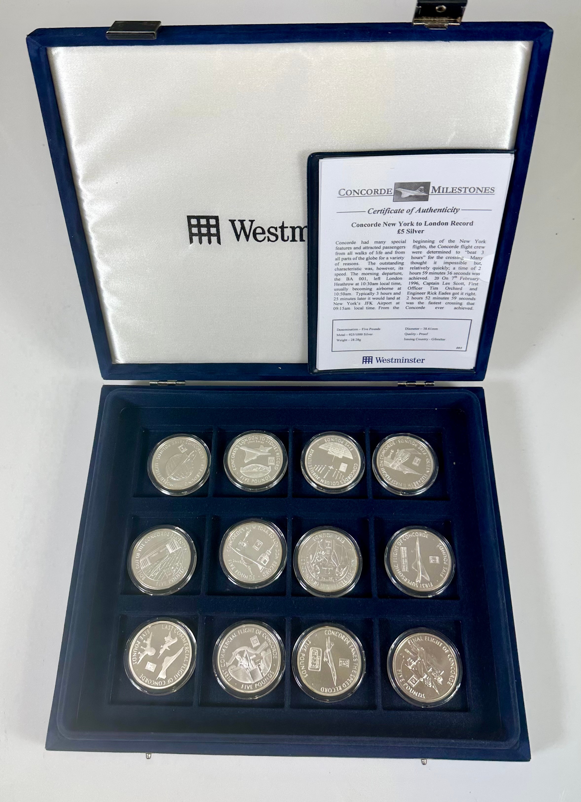 A SET OF 12 WESTMINSTER SILVER £5 CONCORDE COINS IN PRESENTATION BOX