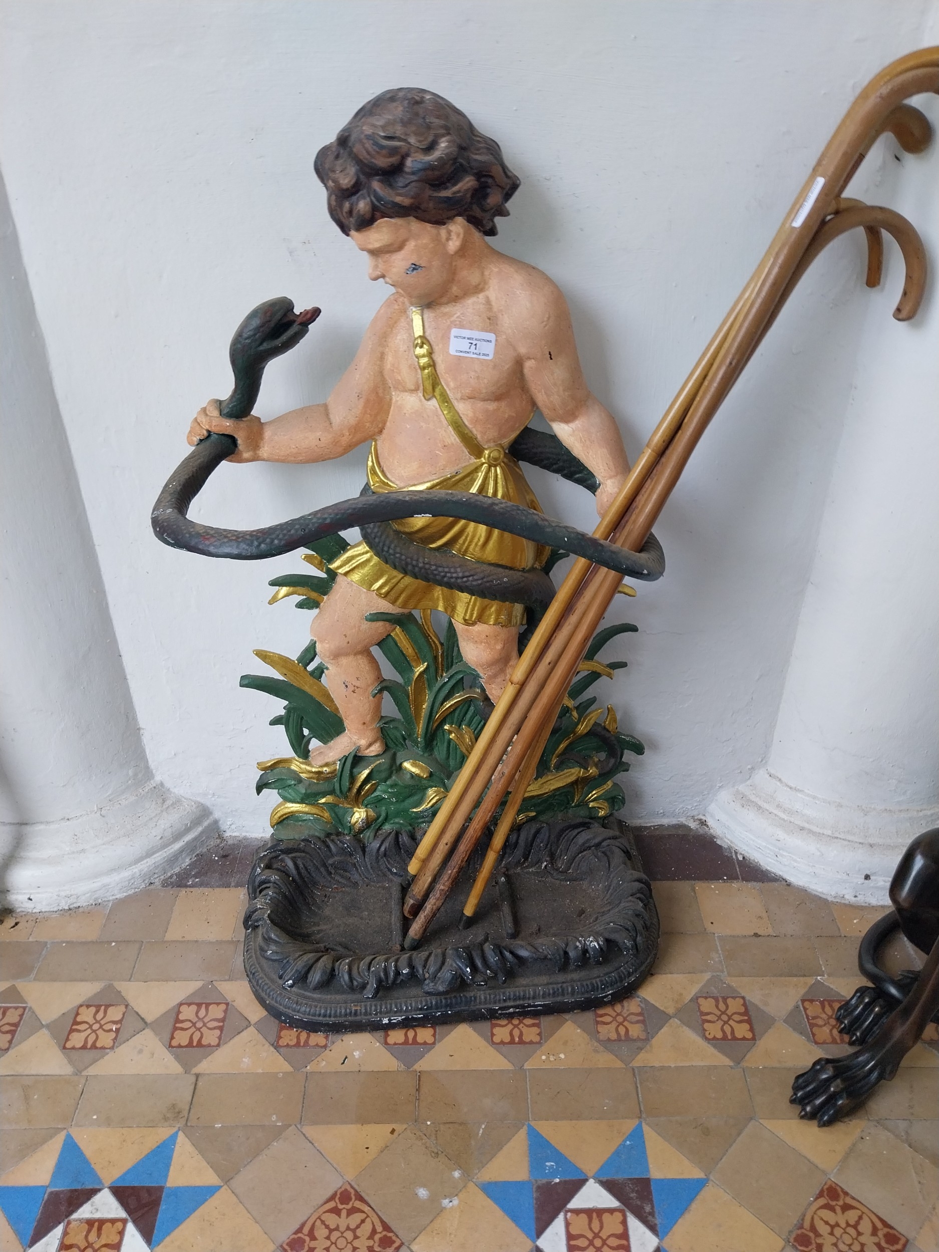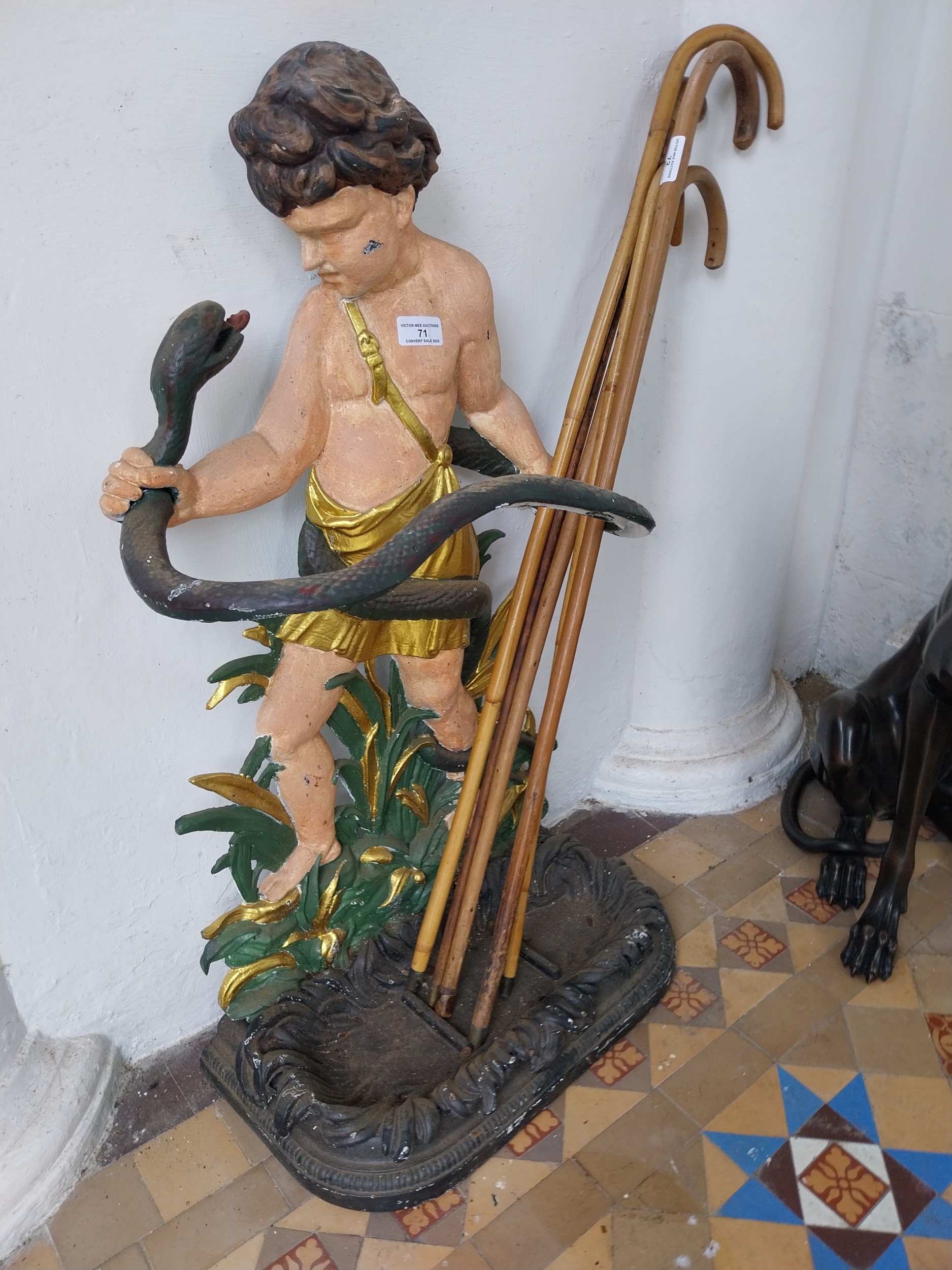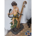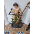 Decorative cast iron stick stand mounted on cherub. { 84cm H X 48cm W X 26cm D }.