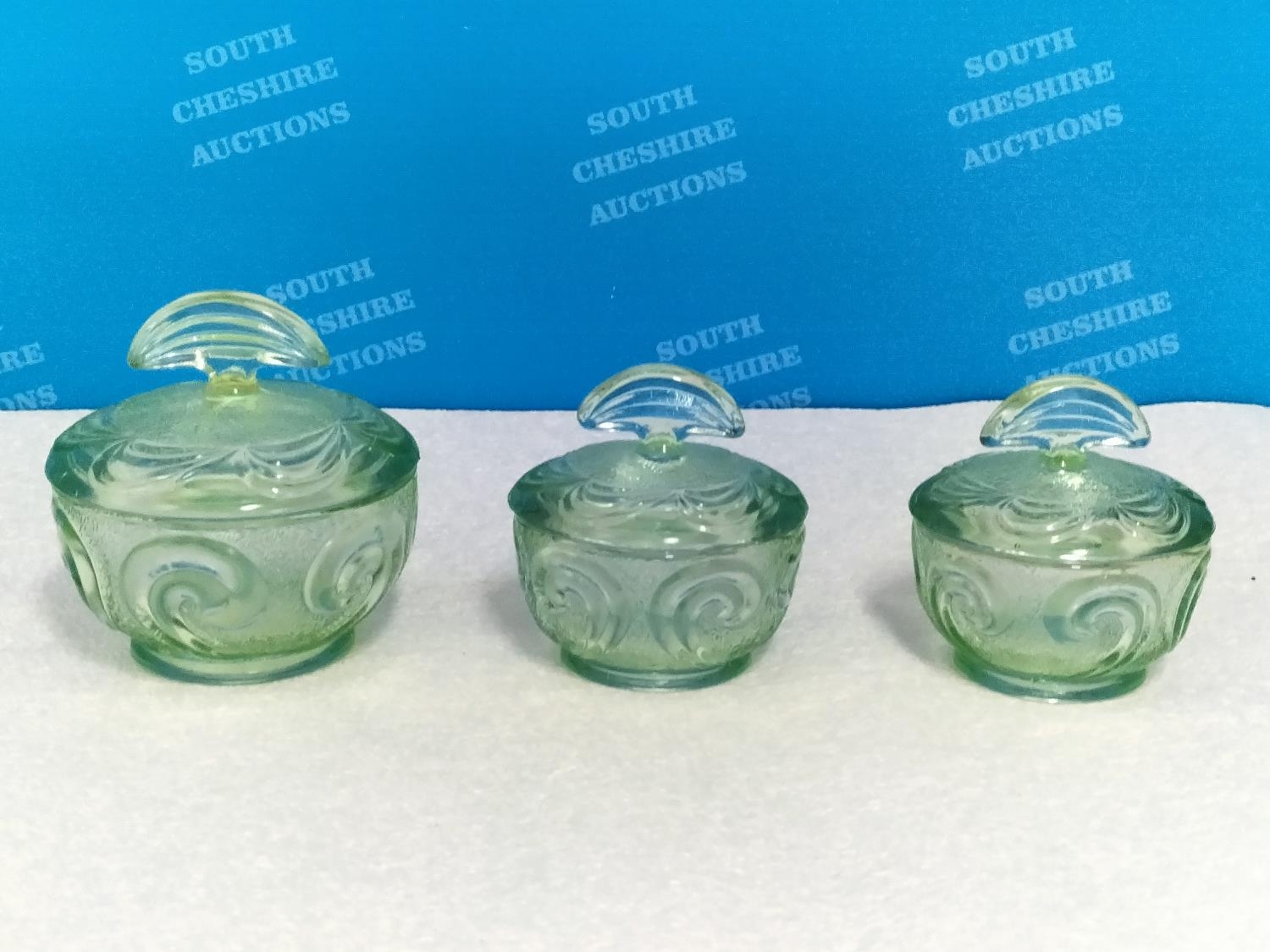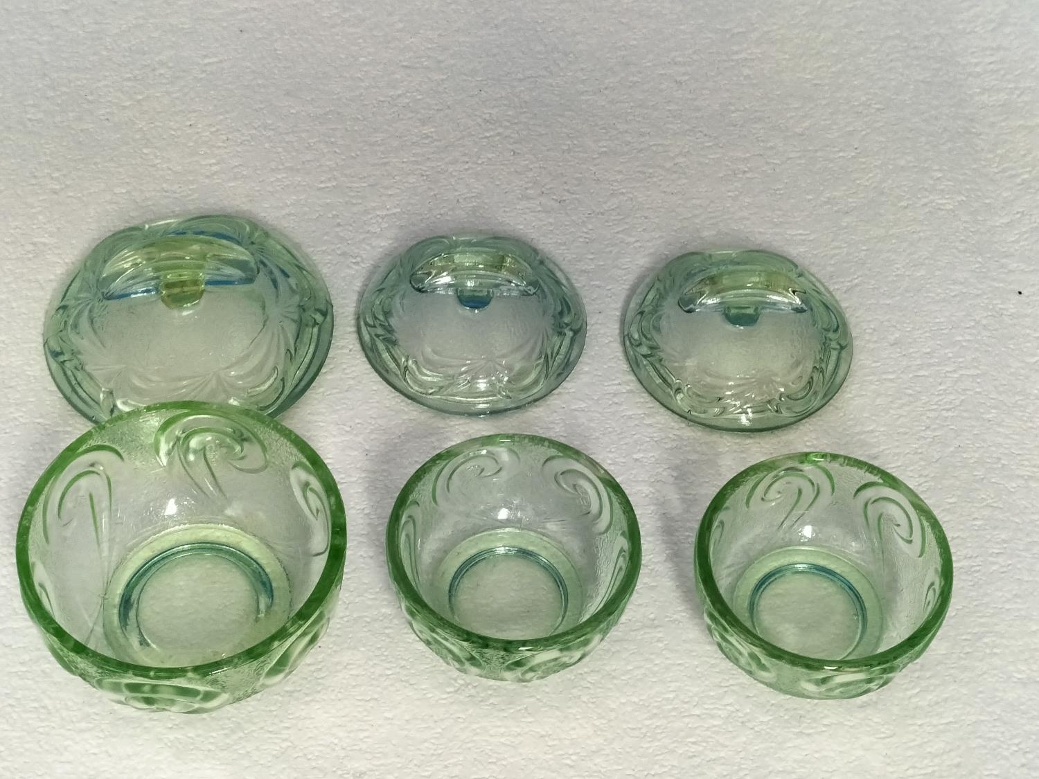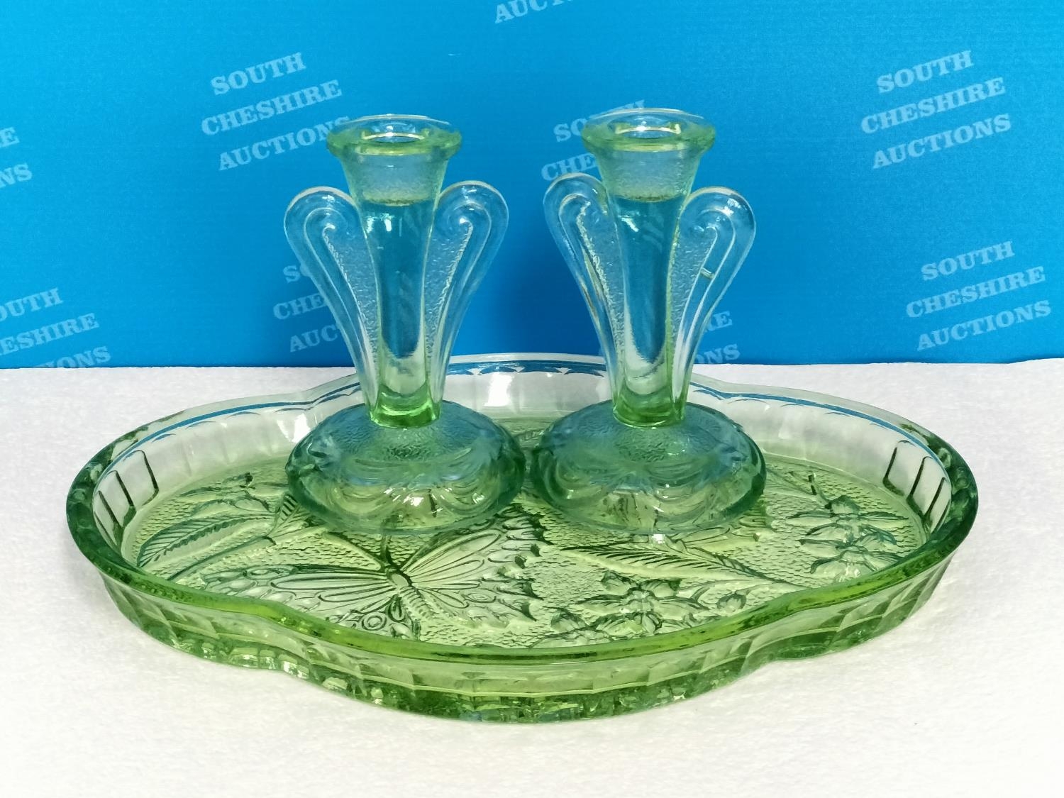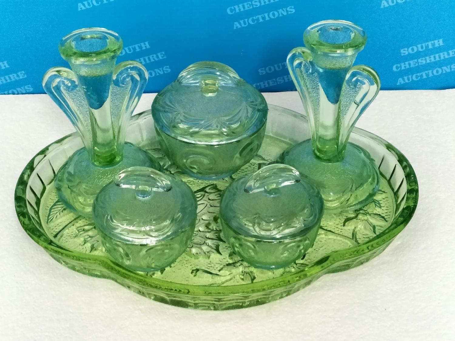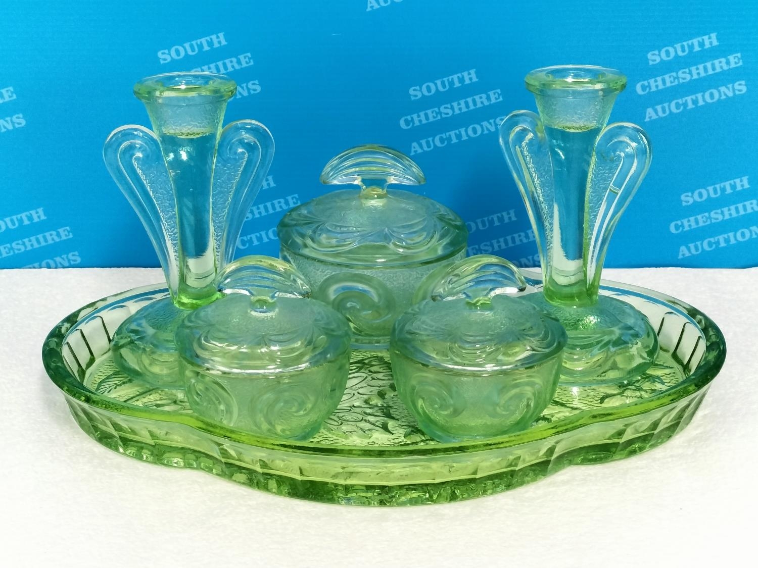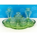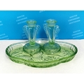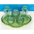 Vintage 1930's Bagley & Co Green Glass Dressing Table Set in the 'Rutland' Pattern.