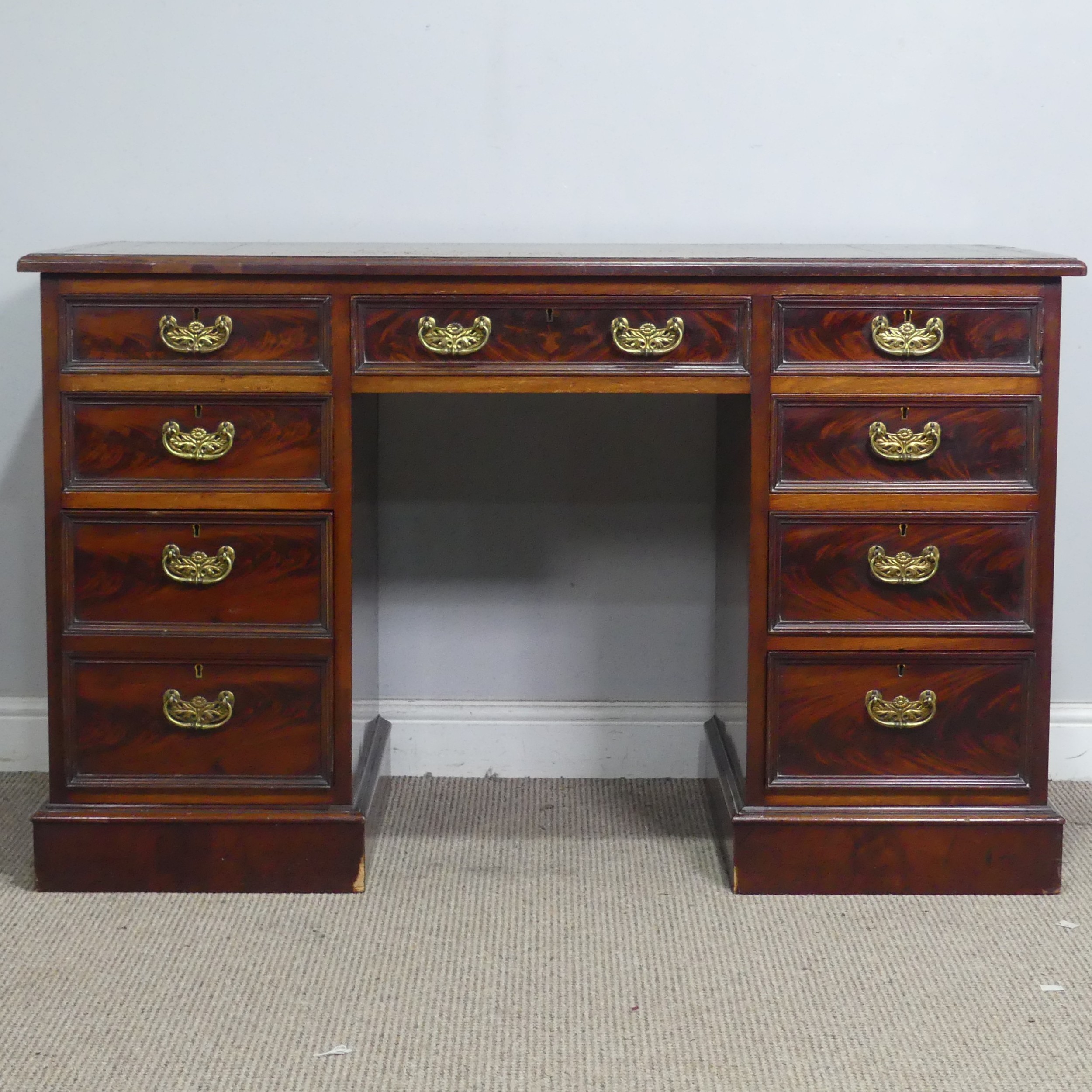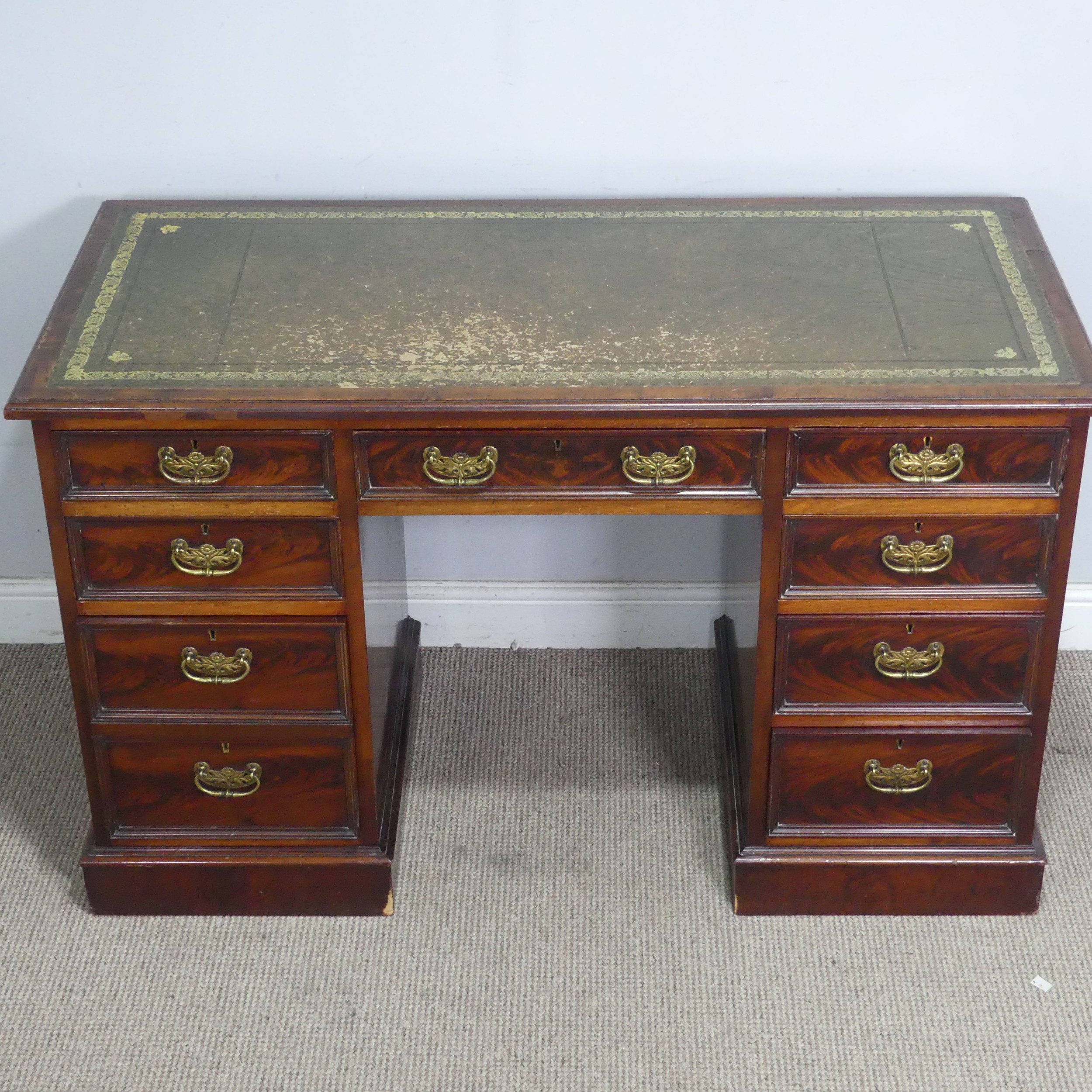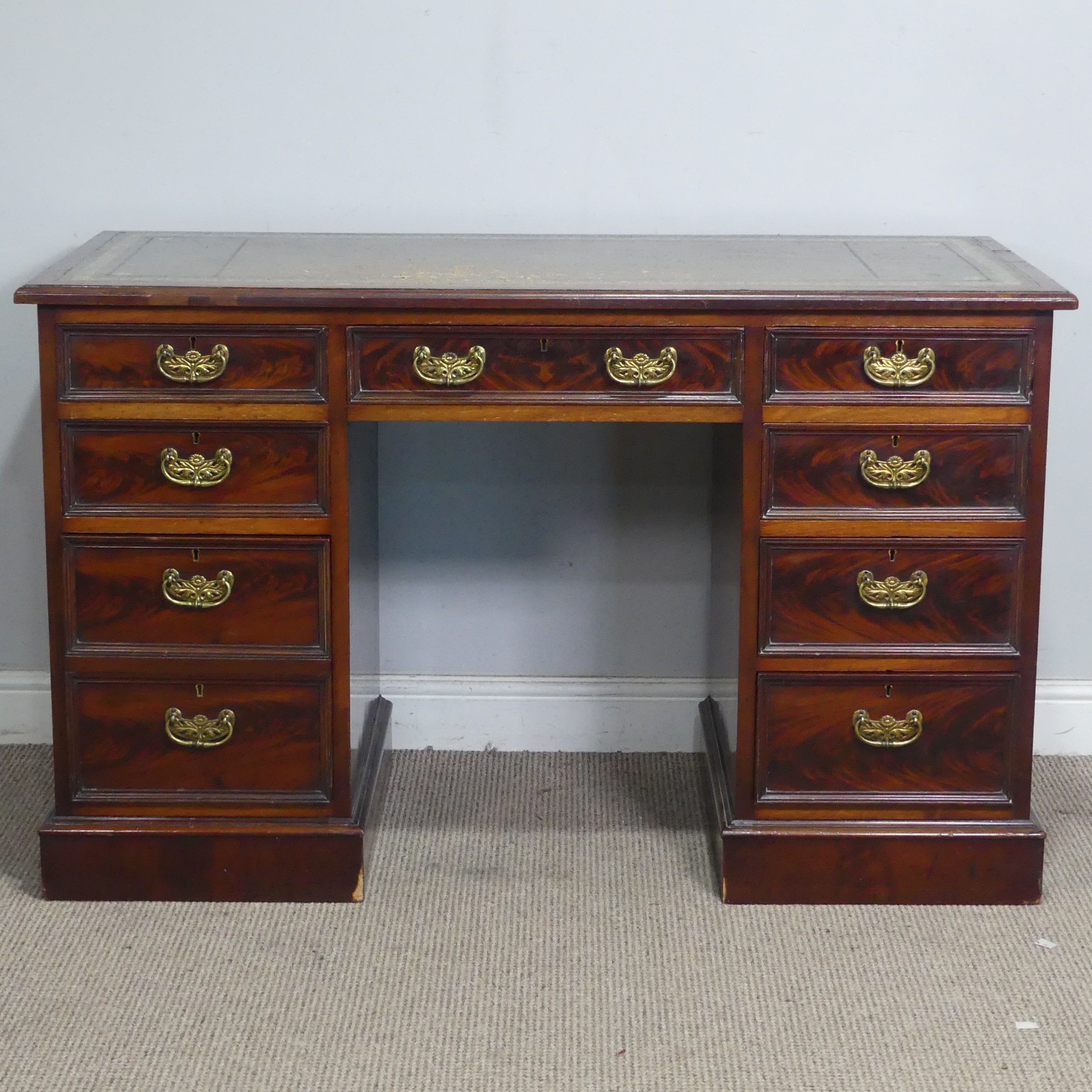 A reproduction mahogany twin pedestal Desk, the top applied with a gilt-tooled leather writing skiver, over central frieze drawer and kneehole, flanked by four drawers to either side, raised on castors, W 122 cm x H 77 cm x D 57 cm.