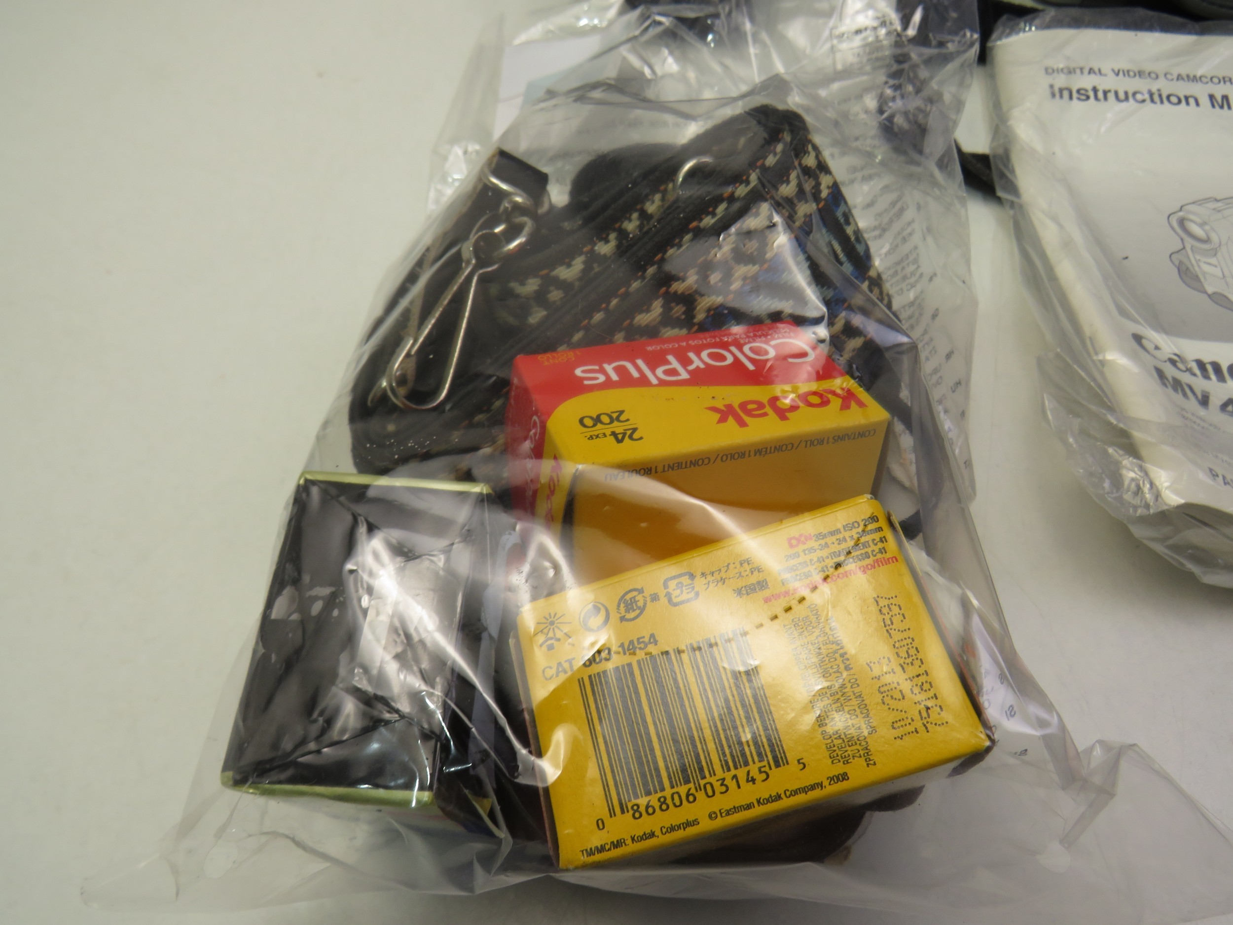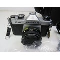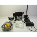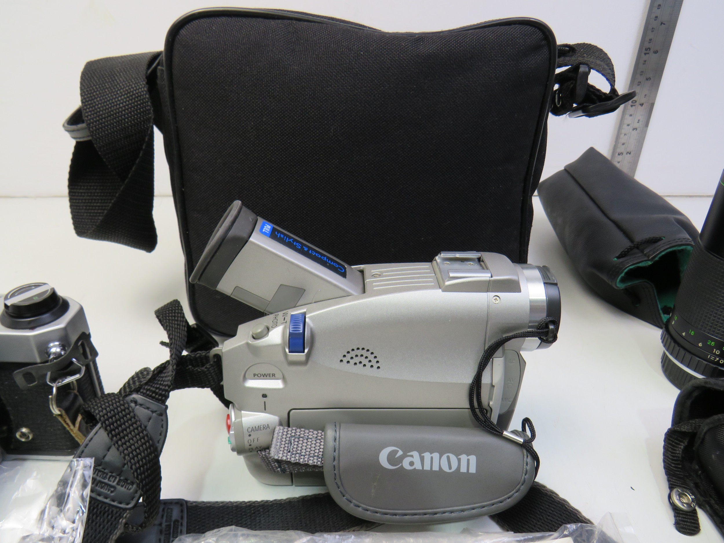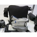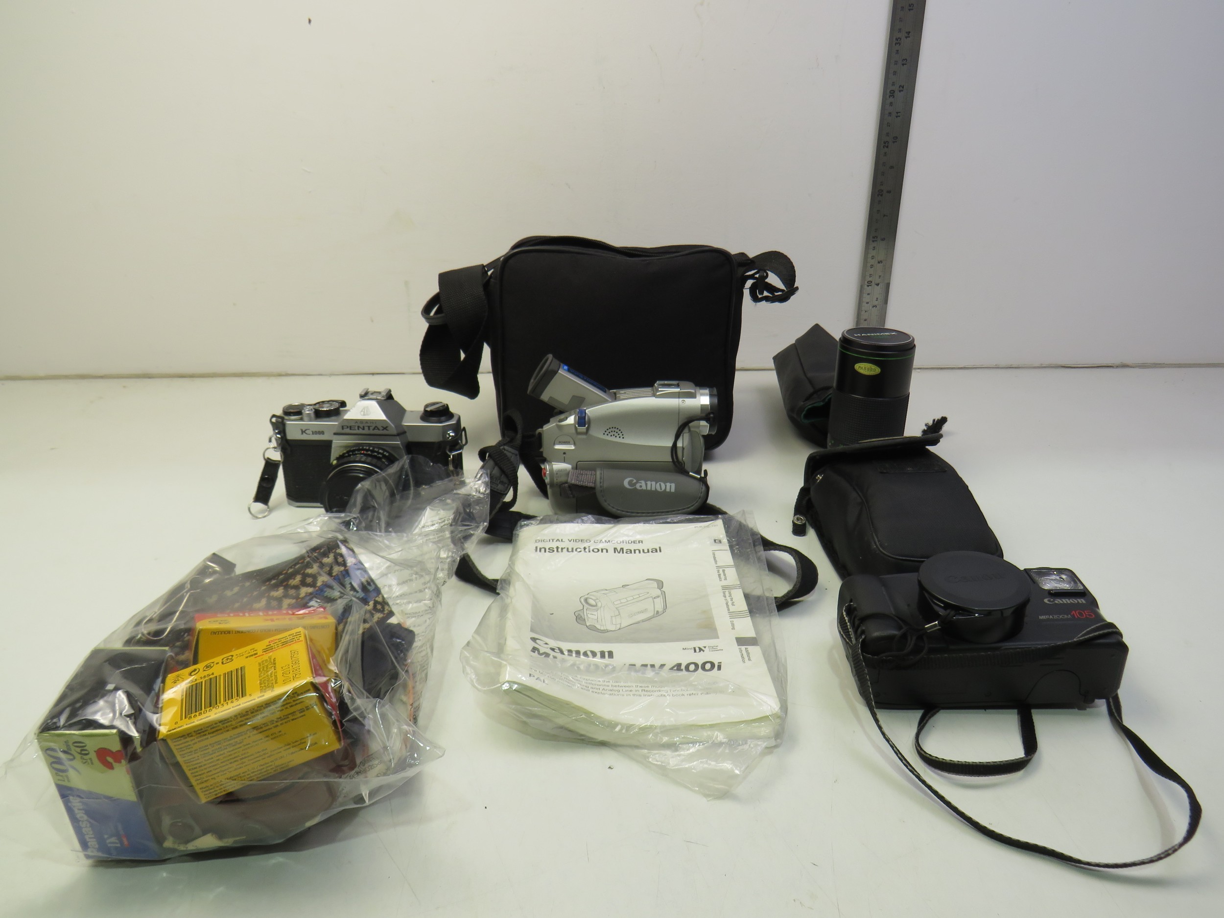 Assortment of cameras including Pentax slr camera, lens, light meter, camcorder, various instruction booklet