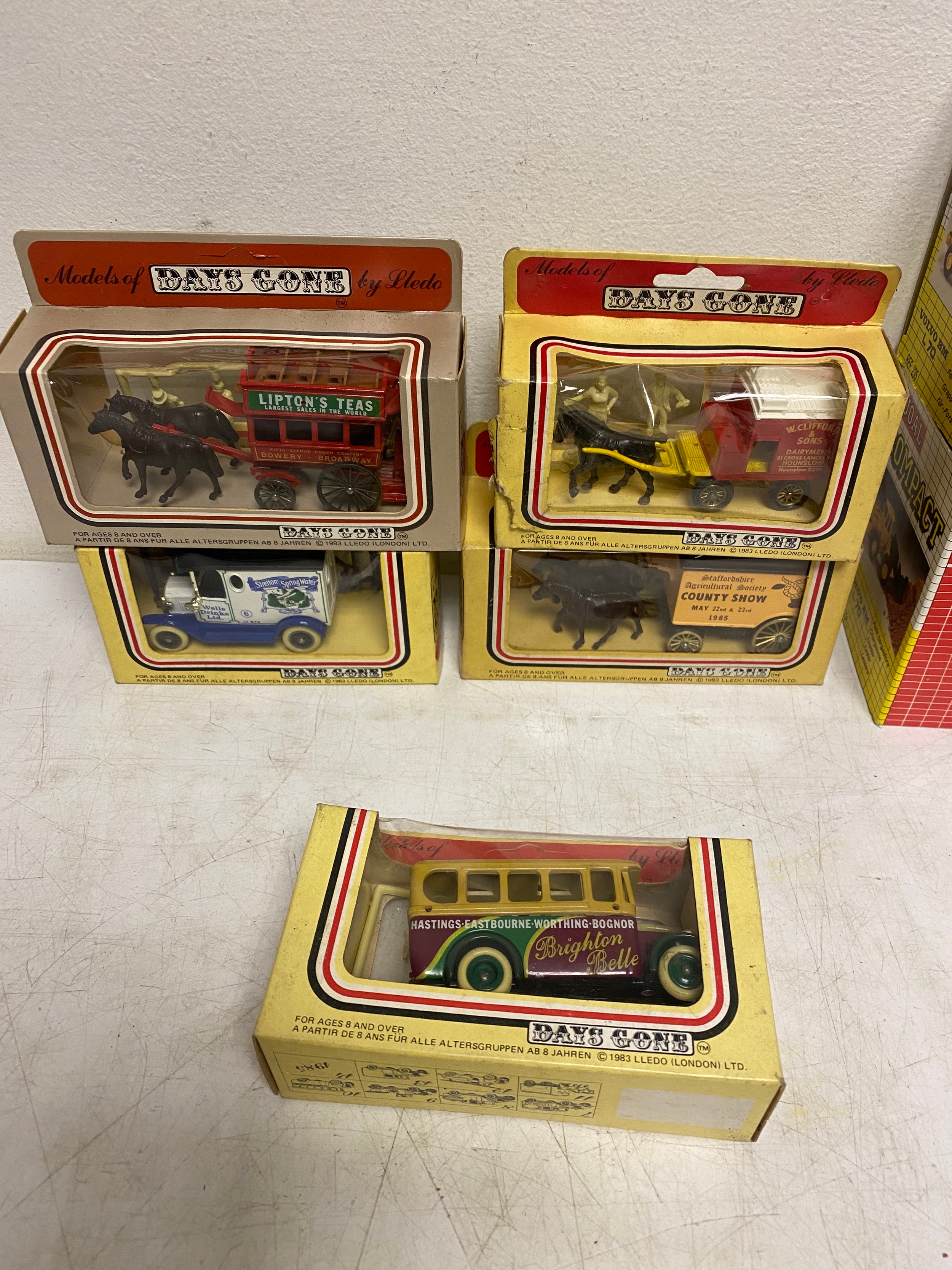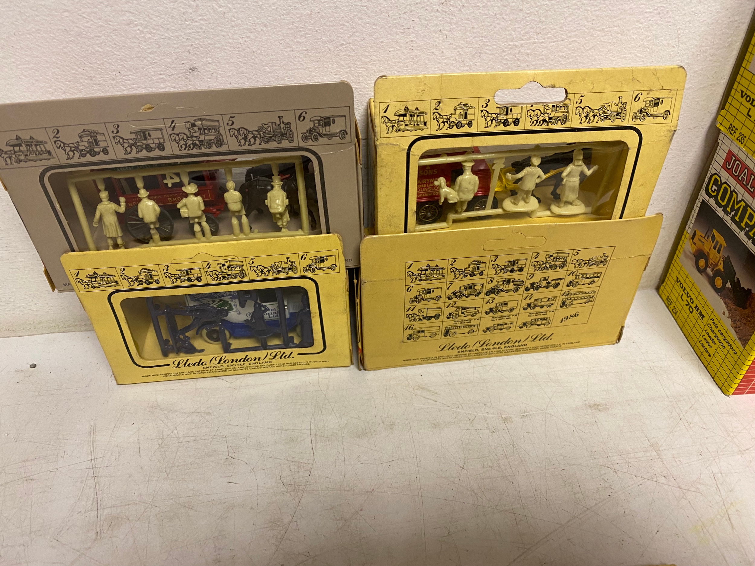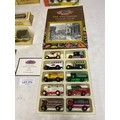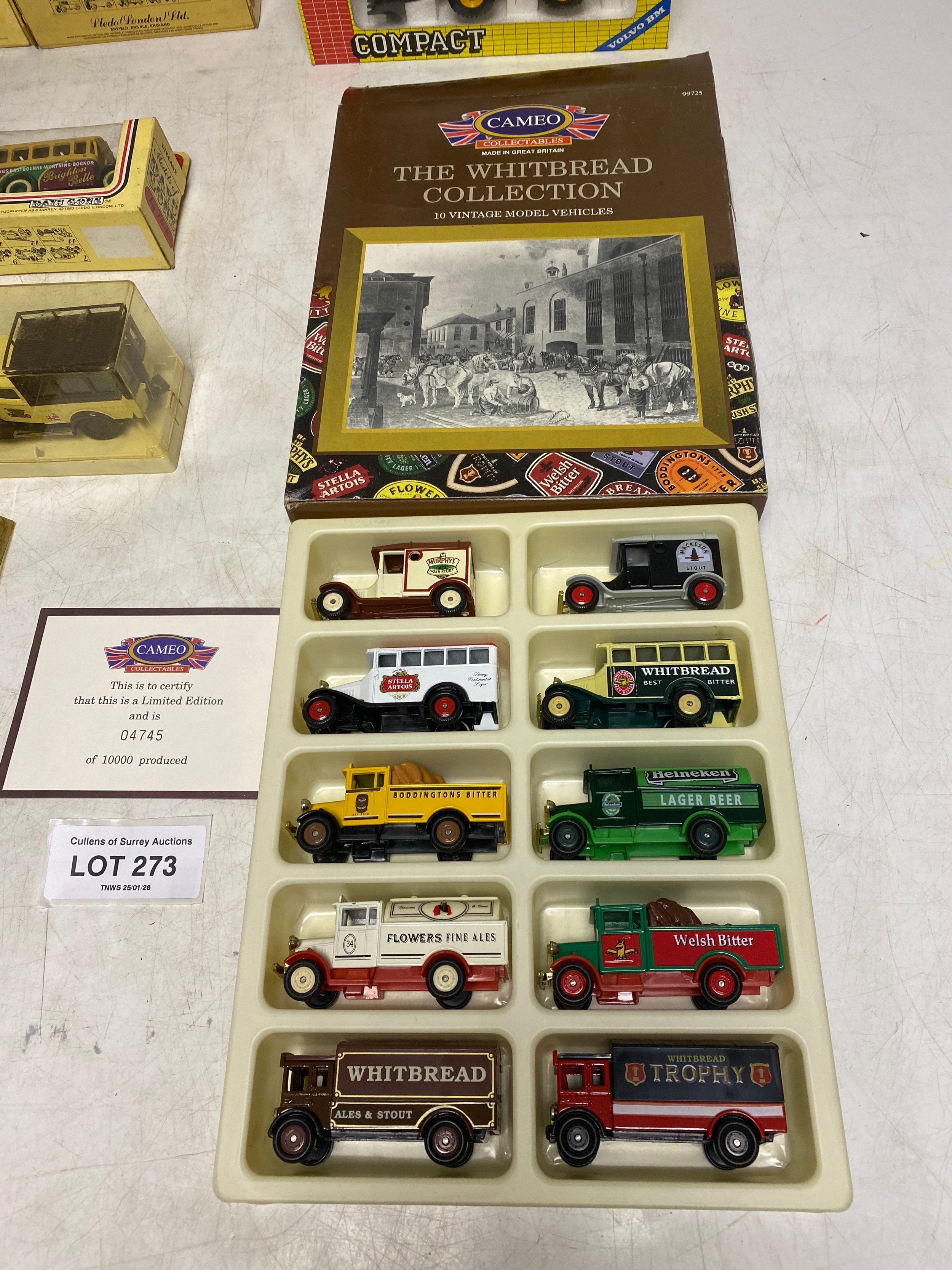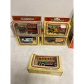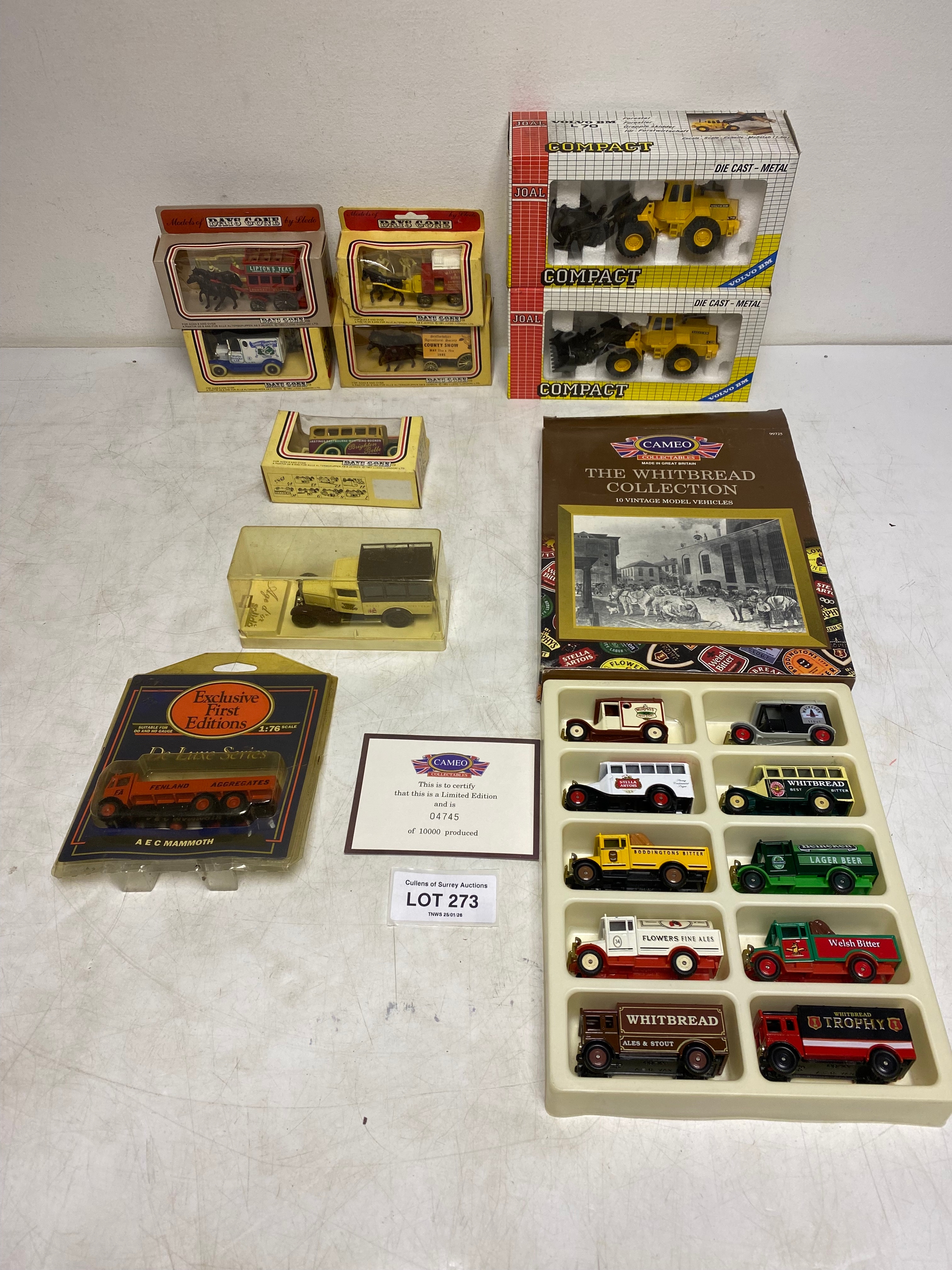 Assortment of Diecast Vehicles in original packaging, including Cameo Whitbread Collection of 10 Brewery Vans, 5x Ledo Days Gone sign written vintage vehicles and horse drawn carriages. 2 Joal Diecast Volvo BM L70