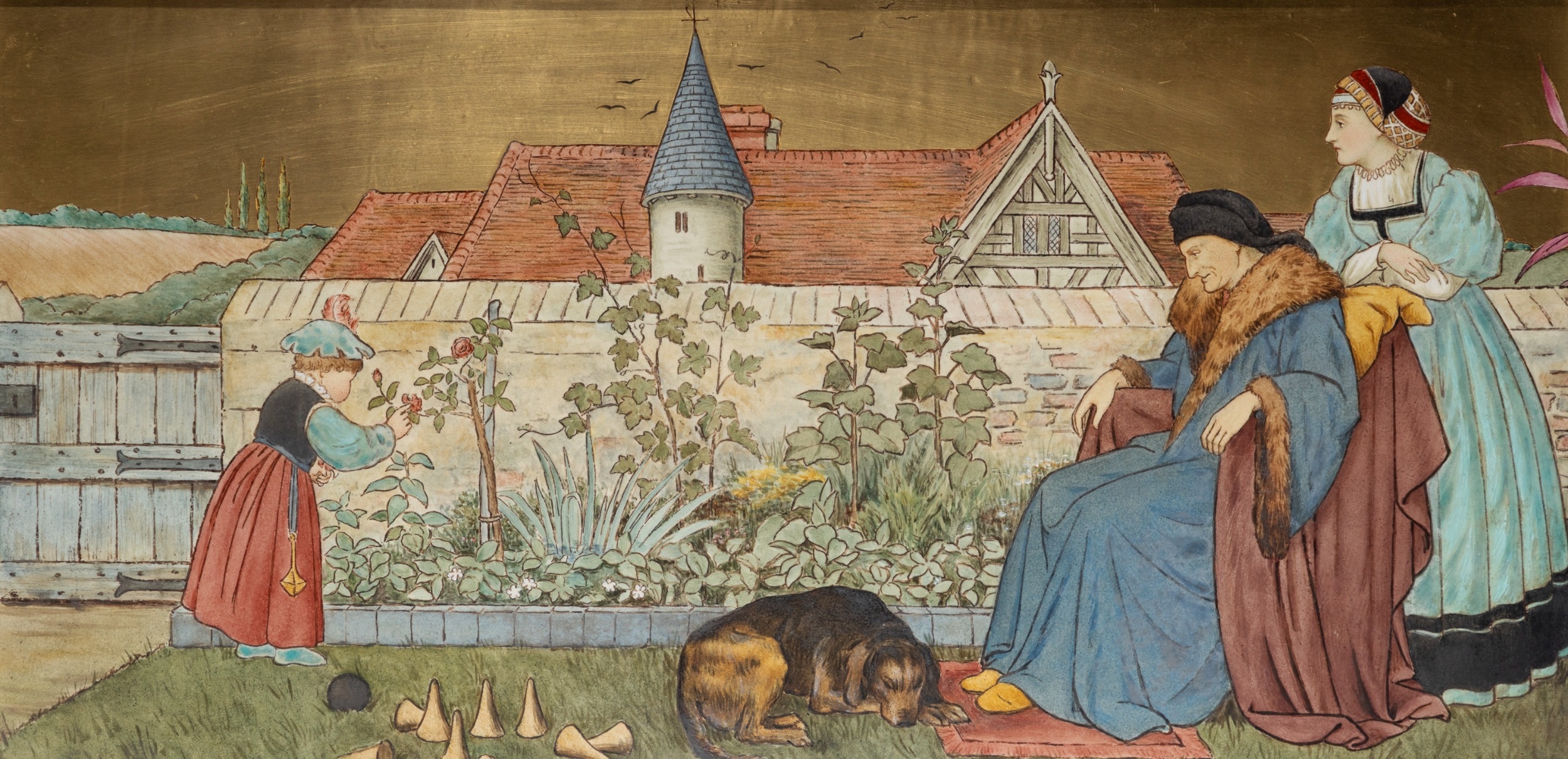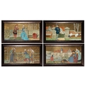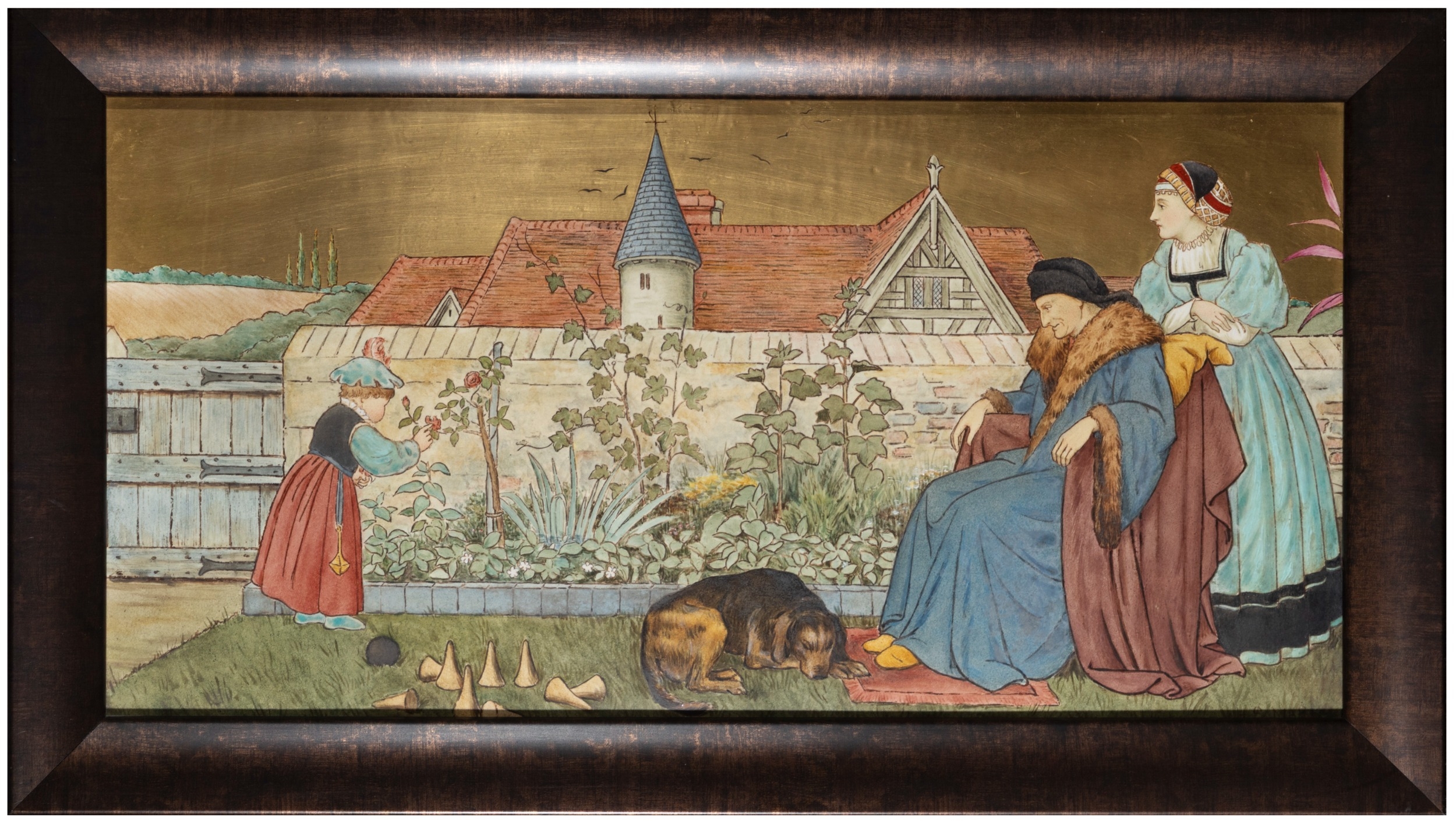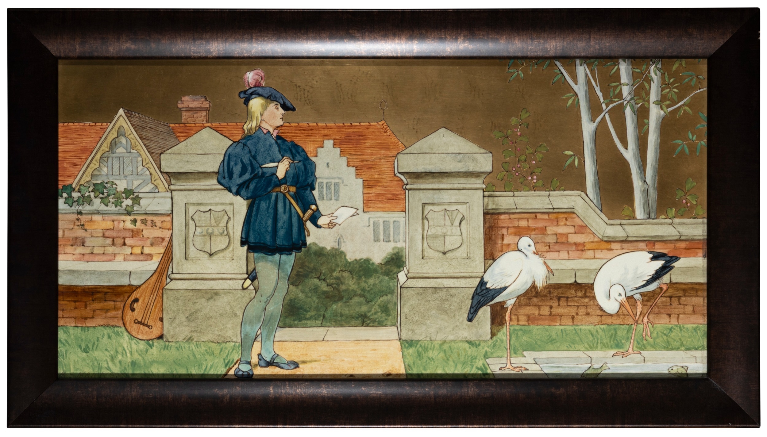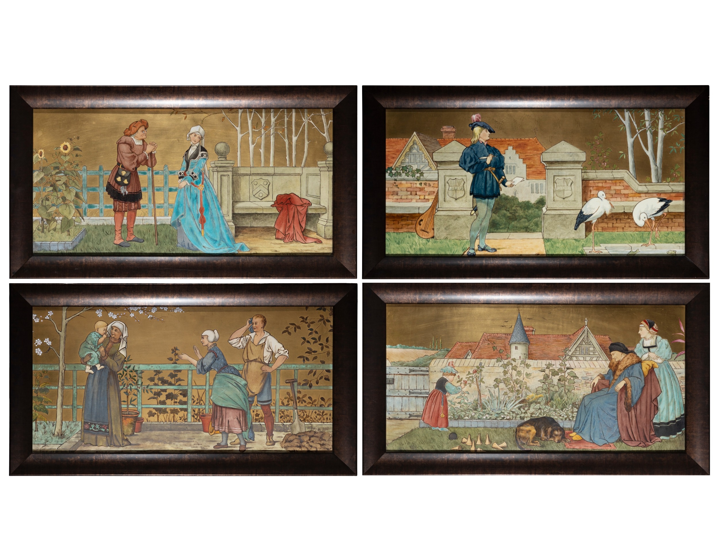 'THE SEVEN AGES OF MAN' FOUR FROM A SERIES OF SEVEN MINTON ART POTTERY STUDIO RECTANGULAR PLAQUES DESIGNED BY HENRY STACY MARKS, c.1874, various impressed, incised and stamped marks, decorator's marks to each verso, each inscribed H.S. marks, 25 x 50.7cm (plaque). Contained in wooden frames Based on scenes from William Shakespeare's 'As You Like It', and depicting figures in Medieval dress. The first with a young child being held by his grandmother while his mother and father look on under a blossoming tree; the second depicting the child in a summer garden overlooked by his parents; the fourth depicting the adolescent composing music before a building; the seventh depicting the old man wooing a much younger woman