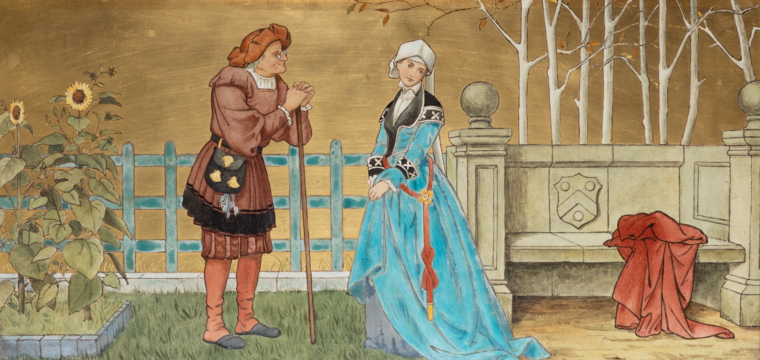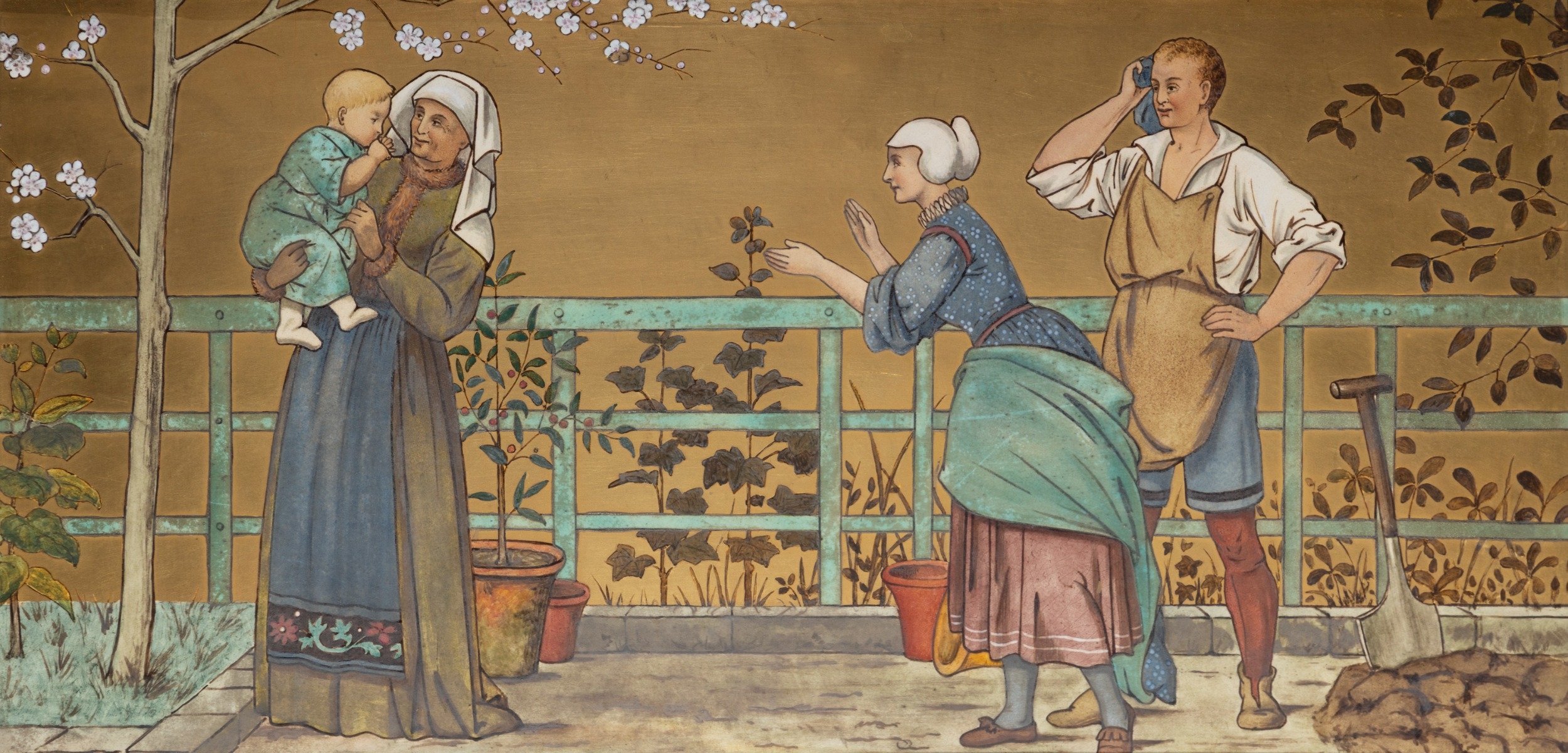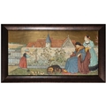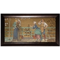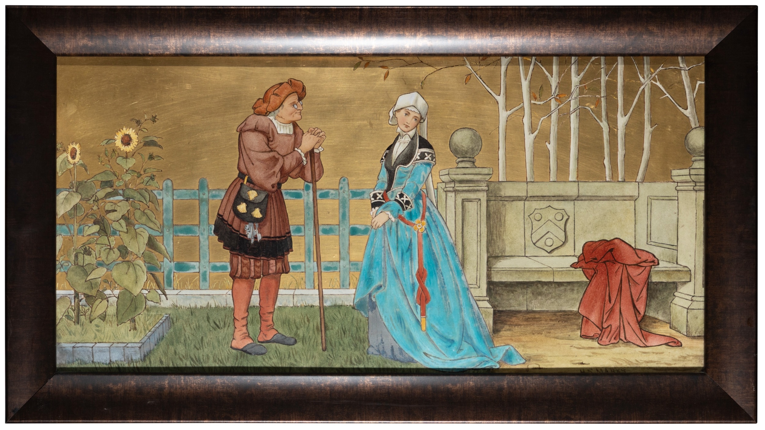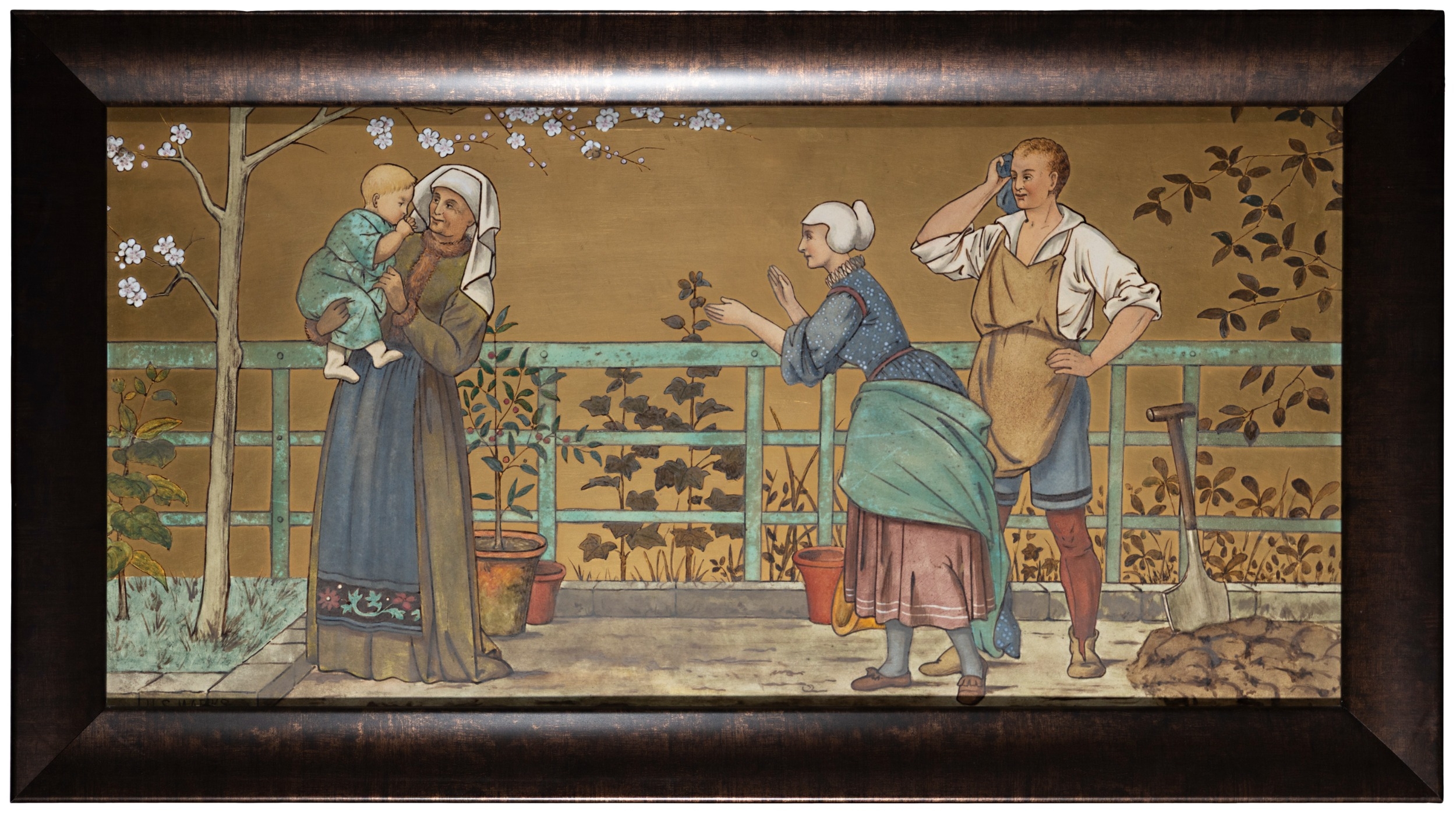 'THE SEVEN AGES OF MAN' FOUR FROM A SERIES OF SEVEN MINTON ART POTTERY STUDIO RECTANGULAR PLAQUES DESIGNED BY HENRY STACY MARKS, c.1874, various impressed, incised and stamped marks, decorator's marks to each verso, each inscribed H.S. marks, 25 x 50.7cm (plaque). Contained in wooden frames Based on scenes from William Shakespeare's 'As You Like It', and depicting figures in Medieval dress. The first with a young child being held by his grandmother while his mother and father look on under a blossoming tree; the second depicting the child in a summer garden overlooked by his parents; the fourth depicting the adolescent composing music before a building; the seventh depicting the old man wooing a much younger woman