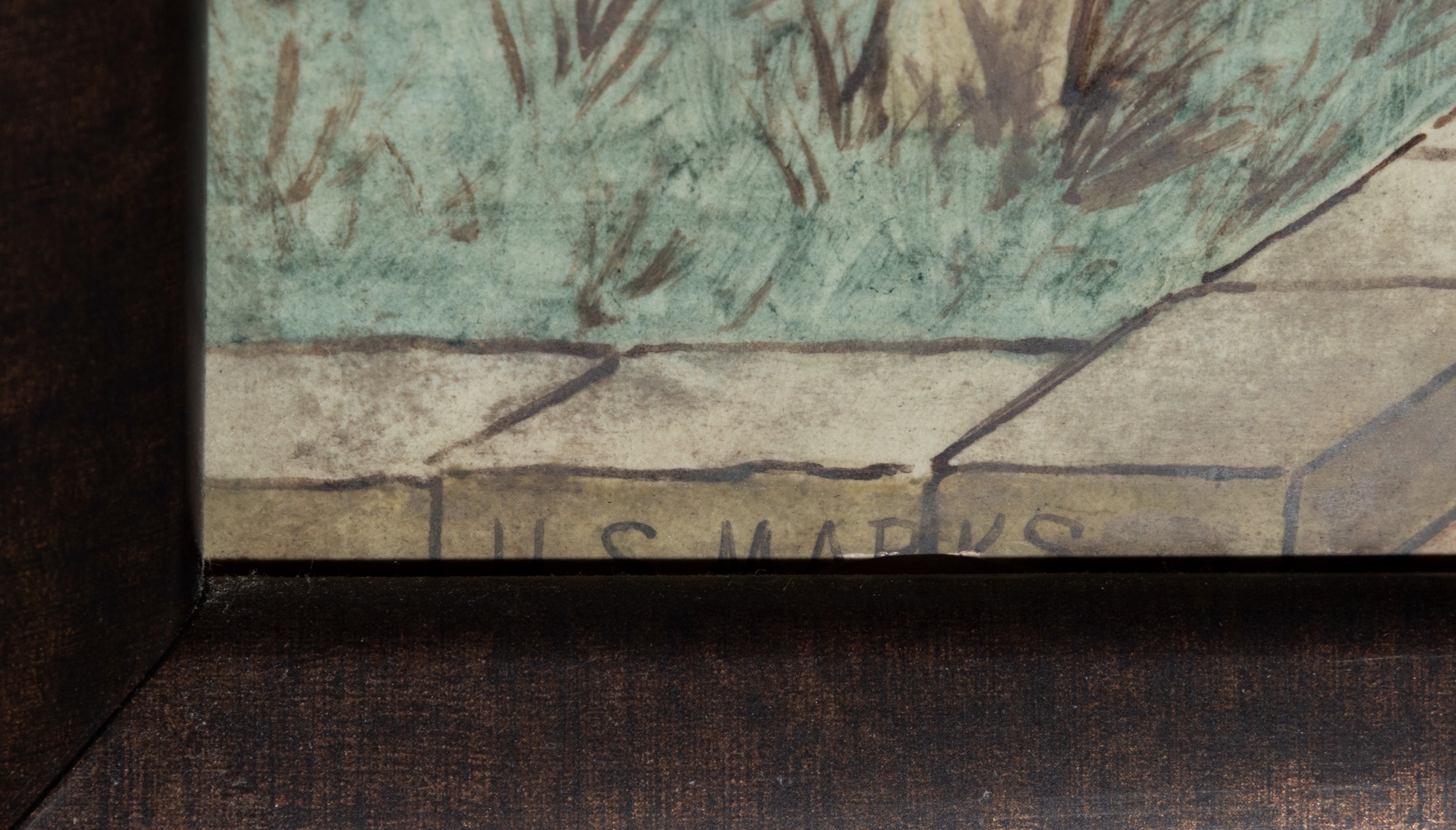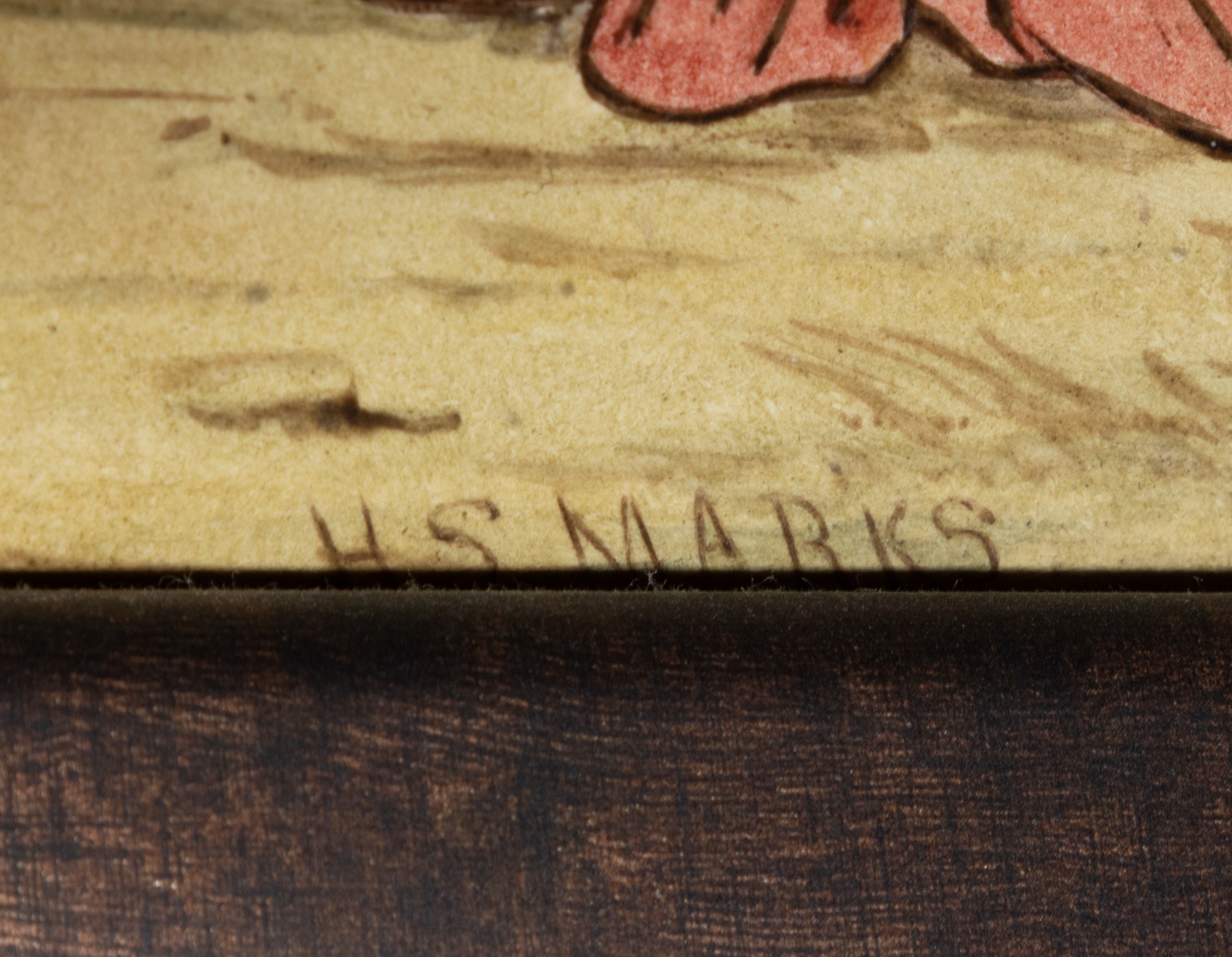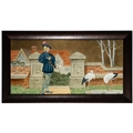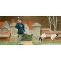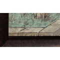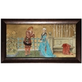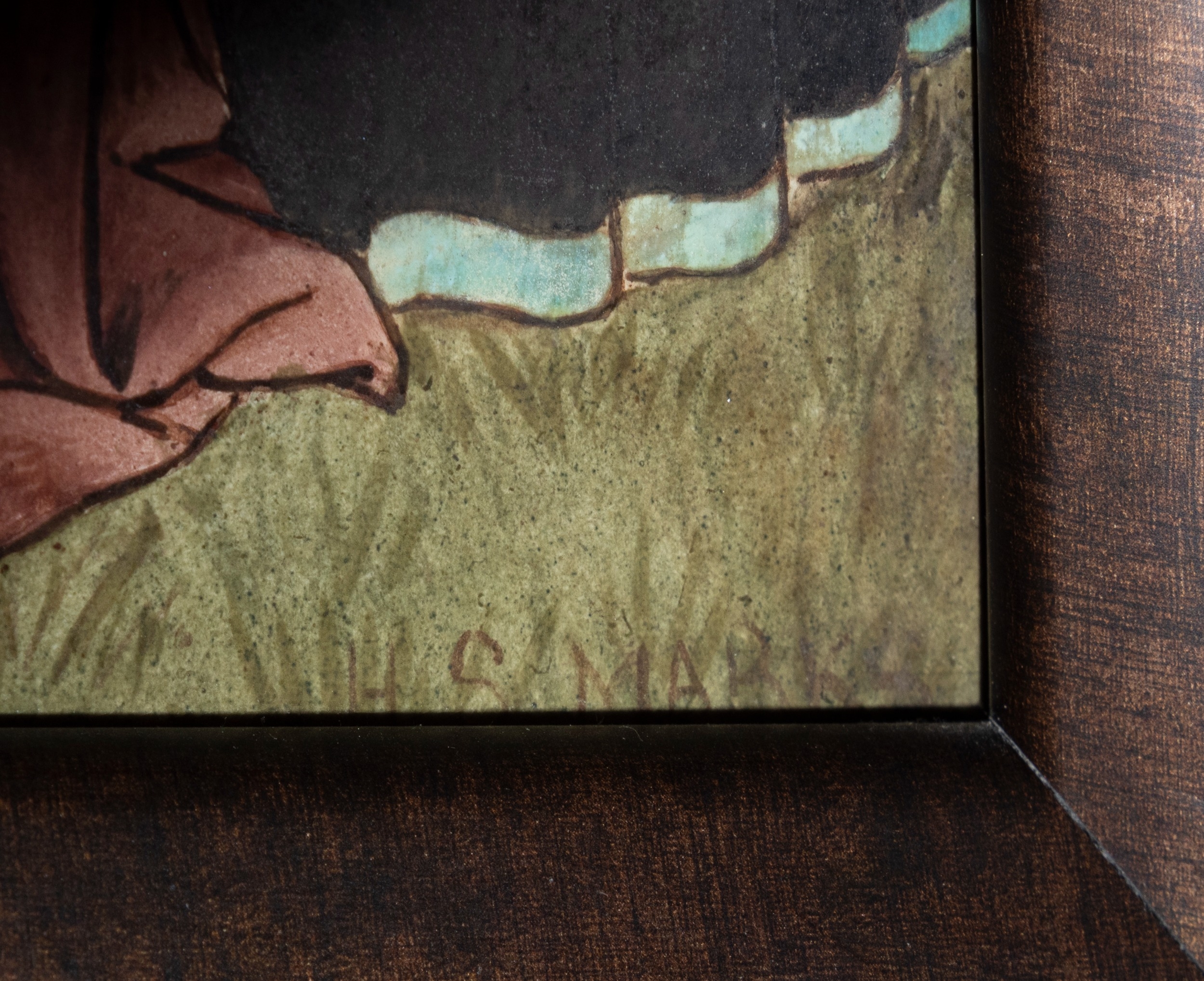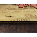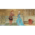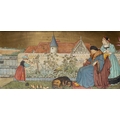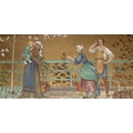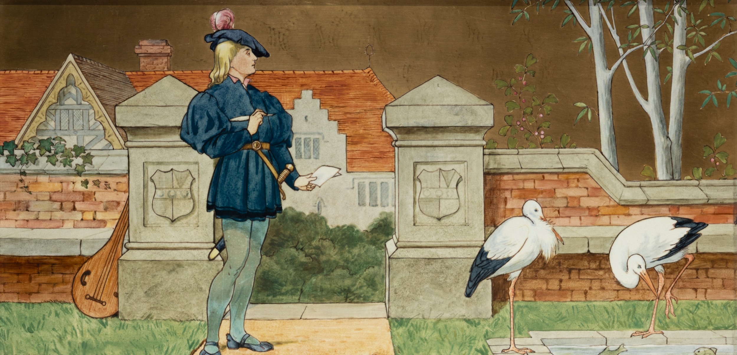 'THE SEVEN AGES OF MAN' FOUR FROM A SERIES OF SEVEN MINTON ART POTTERY STUDIO RECTANGULAR PLAQUES DESIGNED BY HENRY STACY MARKS, c.1874, various impressed, incised and stamped marks, decorator's marks to each verso, each inscribed H.S. marks, 25 x 50.7cm (plaque). Contained in wooden frames Based on scenes from William Shakespeare's 'As You Like It', and depicting figures in Medieval dress. The first with a young child being held by his grandmother while his mother and father look on under a blossoming tree; the second depicting the child in a summer garden overlooked by his parents; the fourth depicting the adolescent composing music before a building; the seventh depicting the old man wooing a much younger woman