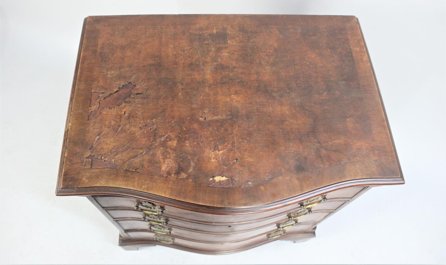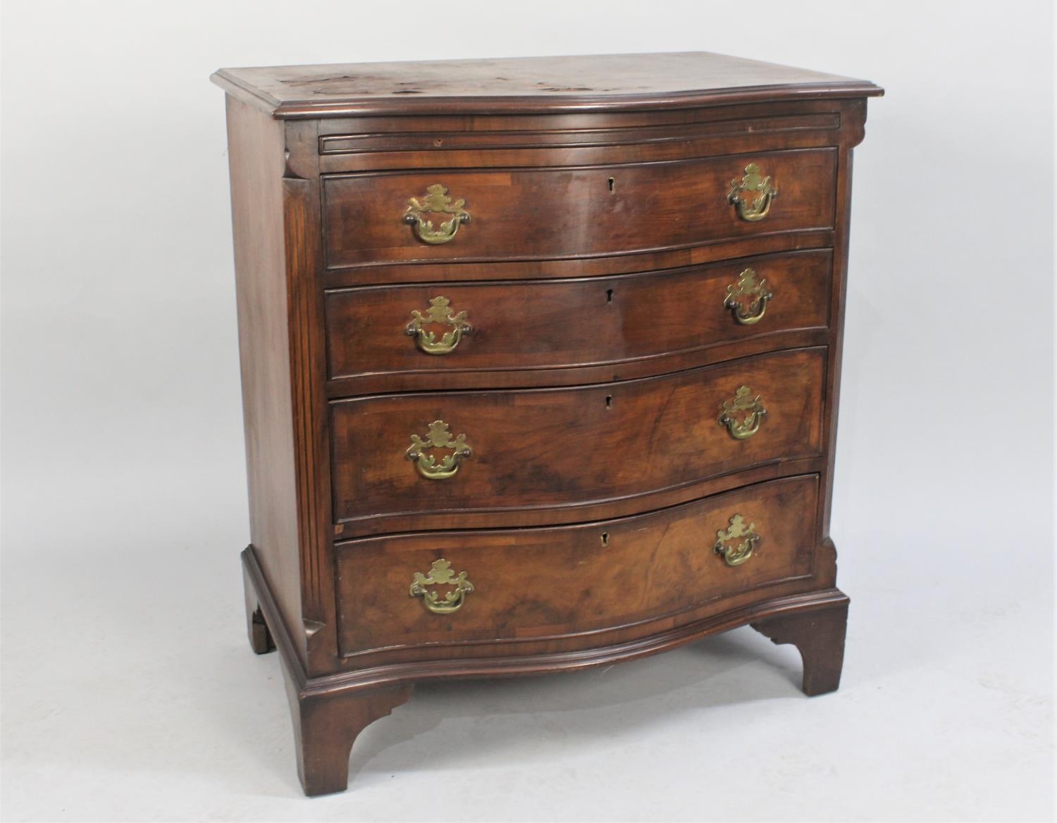 A Mid 20th Century Serpentine Front Chest of Four Graduated Drawers, Brushing Slide Over, Veneered Top Lifting with Water Damage, Bracket Feet, 71cms Wide