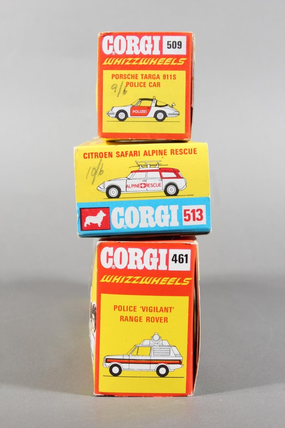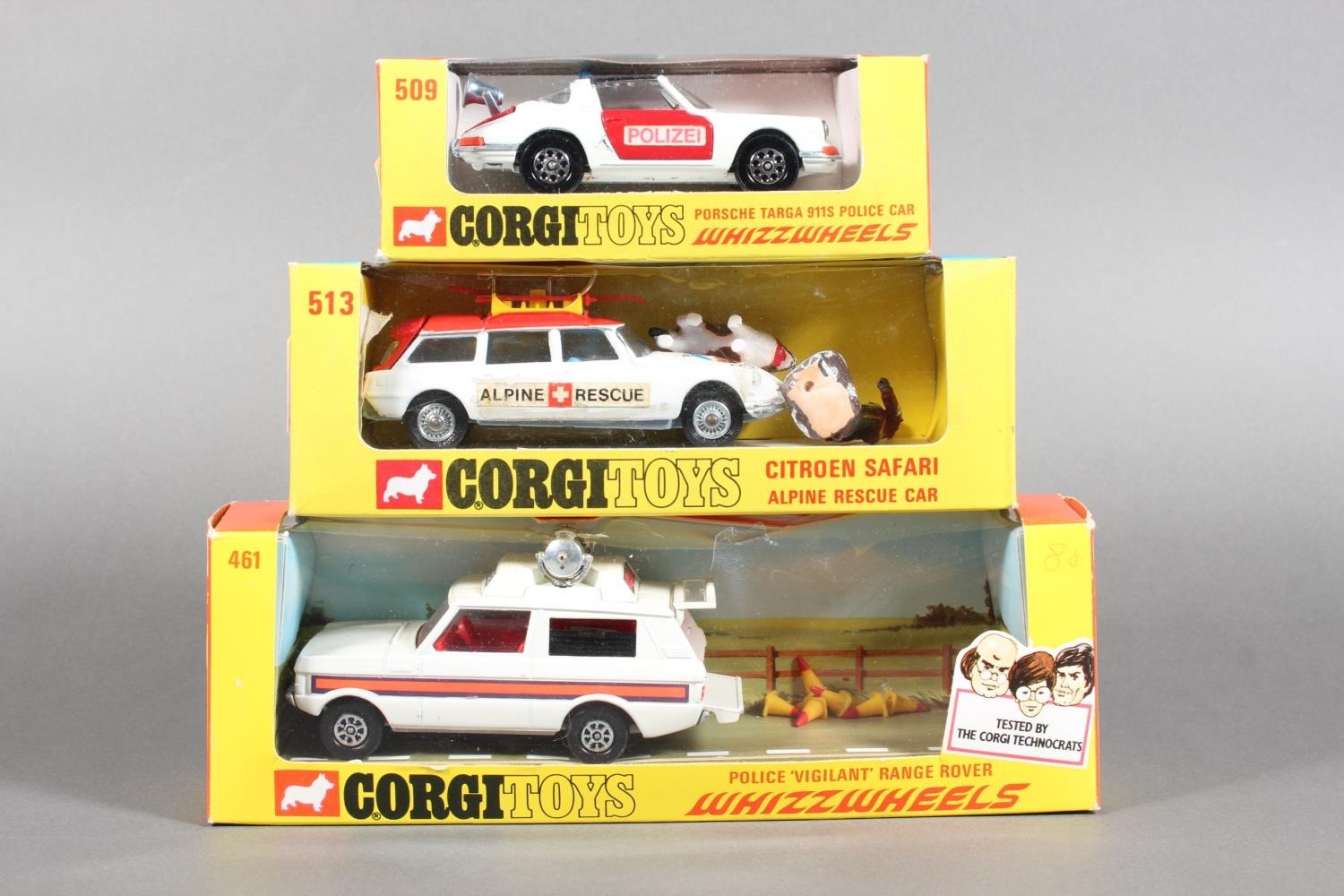 Corgi Toys diecast model vehicles to include 461 Police Vigilant Range Rover, 513 Citroen Safari Alpine Rescue and 509 Porsche Targa 911S Police Car, each boxed. (3)