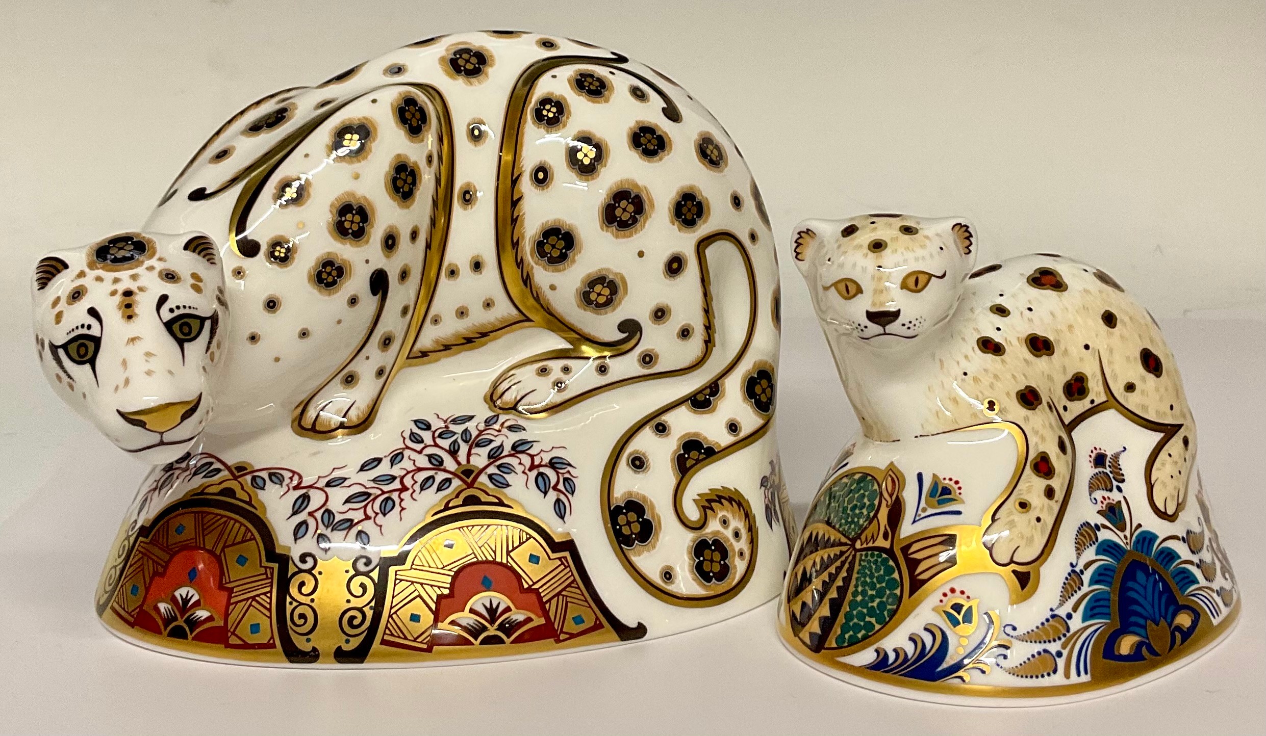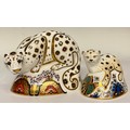 A Royal Crown Derby paperweight, Snow Leopard, designed by John Ablitt, gold stopper, 17cm long, printed mark in red, signed in gold; another, Leopard Cub, the first in a series specially commissioned by Sinclairs, limited edition 558/1500, gold stopper, 11cm long, printed mark in red, signed in gold (2)