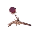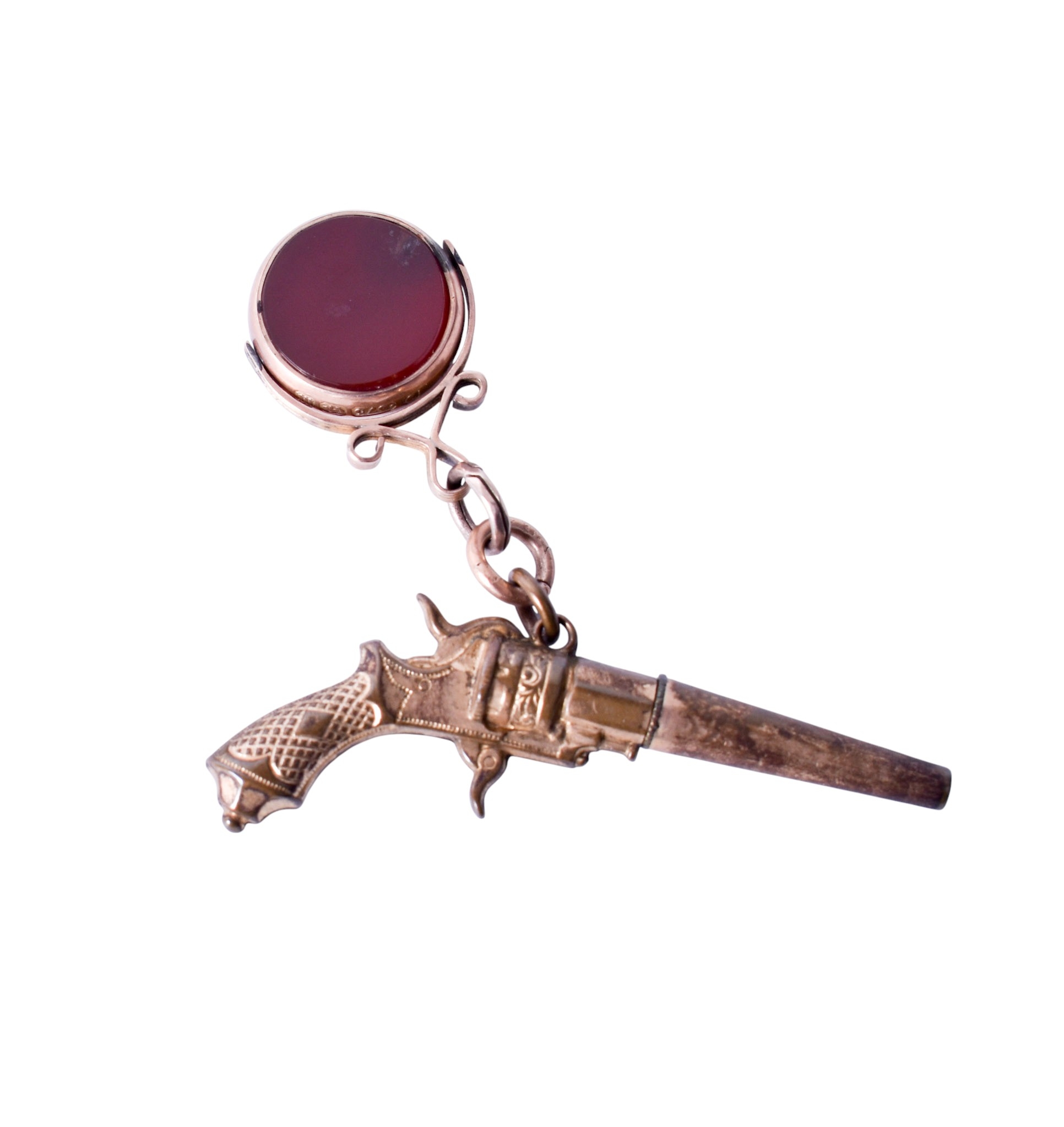 A 9ct gold fob with a gilt metal pendant firearm. The fob set with bloodstone and carnelian in a hallmarked mount, this gross weight 3.2g, with an attached gilt metal revolver pendant.
