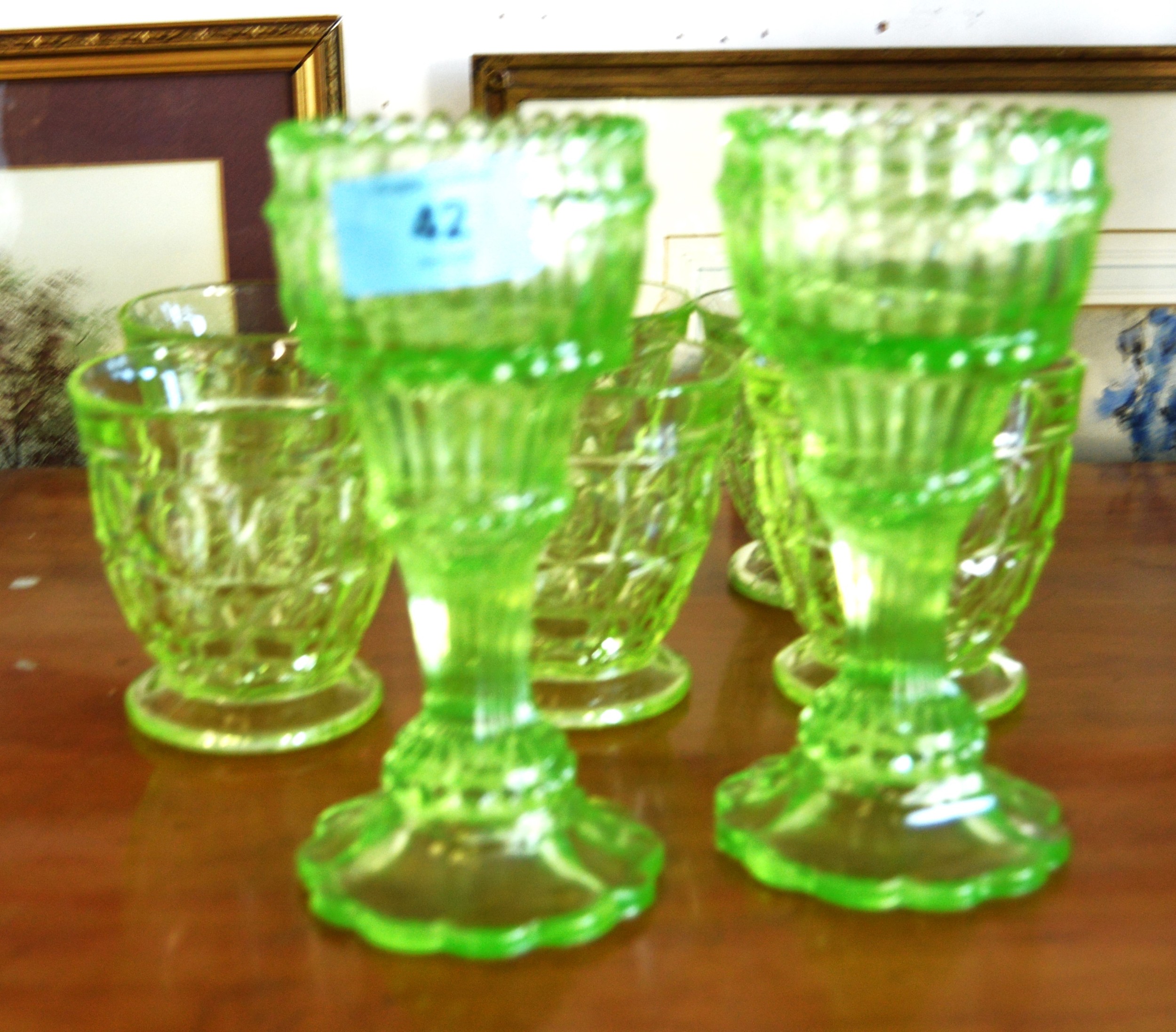 Six Uranium Pressed Glass Sundae/Ice Cream Bowls, Plus Two Uranium Glass Ornate Vases