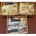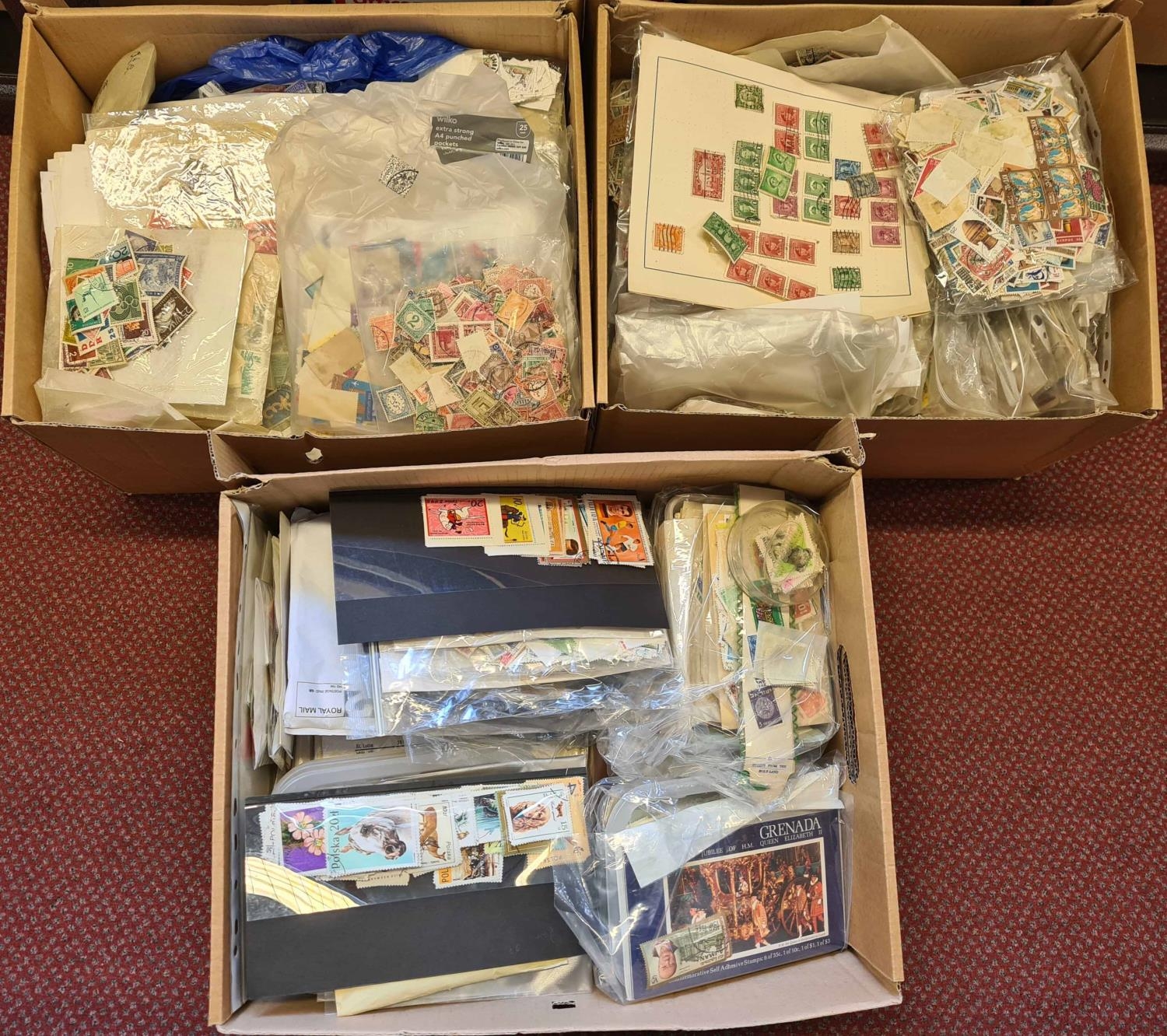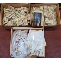 WORLDWIDE ACCUMULATION; Three very big archive boxes containing kiloware in packets, tubs or loose stamps. Mostly used with a wide range of countries & periods. (Qty)