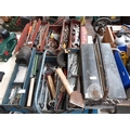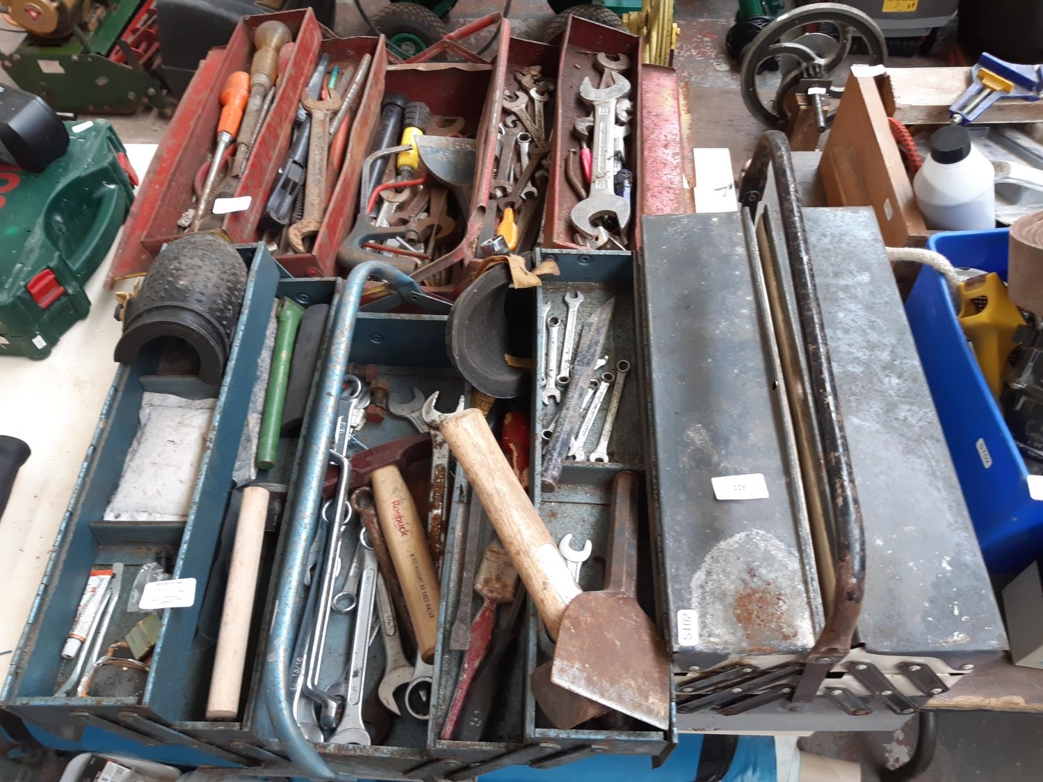 THREE METAL CANTILEVER TOOL BOXES CONTAINING KING DICK, STANLEY AND SUPER SLIM SPANNERS, ROEBUCK BRICK HAMMER, BOLSTER CHISELS, LUMP HAMMER ETC.