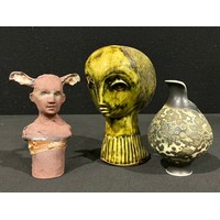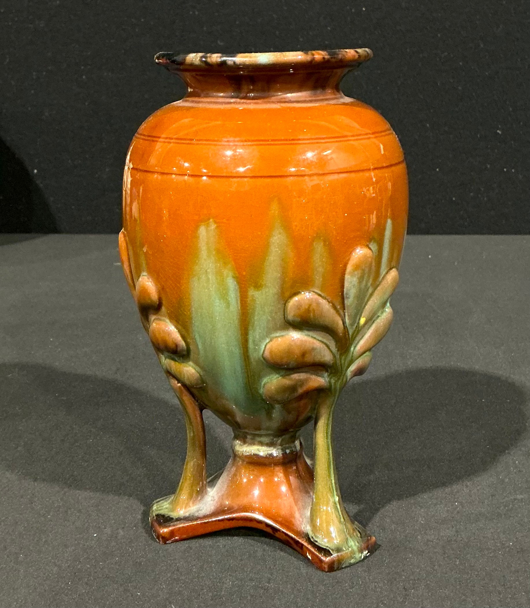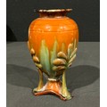 An Arts & Craft period terracotta urnular pedestal vase, in the manner of Christopher Dresser, drip glazed in earthy tones, the triform base with sinuous stylised leafy fronds, 17cm high, c.1900