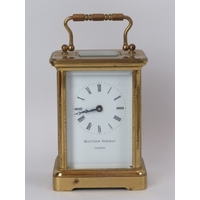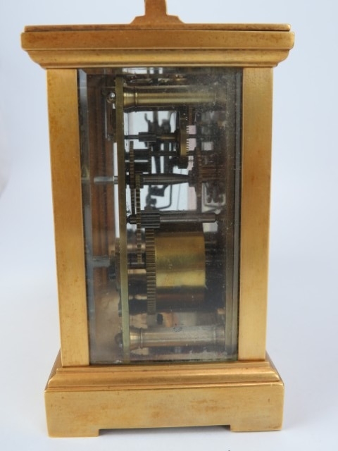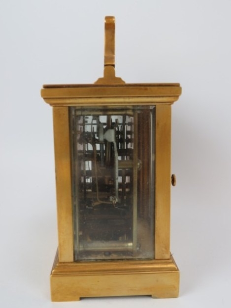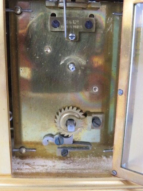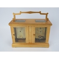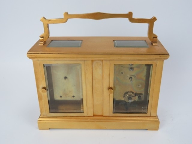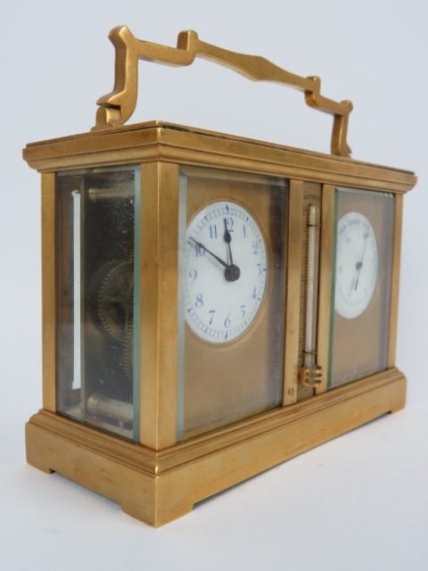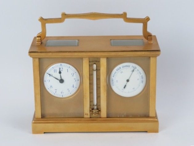 A French gilt brass combined carriage clock, barometer and thermometer by Richard et Cie (Richard & Co), mid/late 19th century. Marked ‘R & Co Made in Paris’. 16.2 cm length.