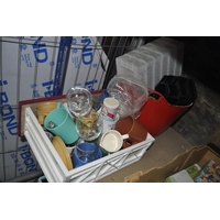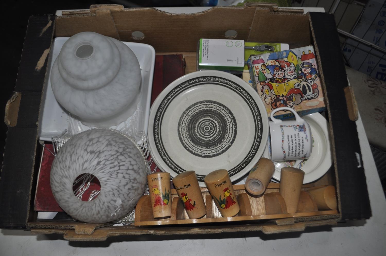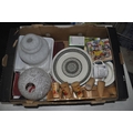 BOX OF LAMPSHADES, GLASS, PLATES ETC