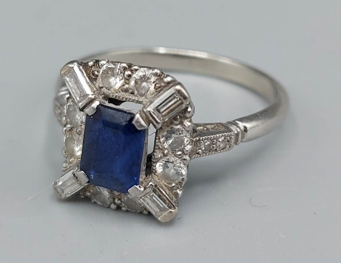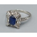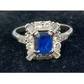 An 18ct gold ring set with a rectangular Sapphire surronded by Diamonds, Diamond baguette corners and Diamond shoulders, 4.2gms, ring size P