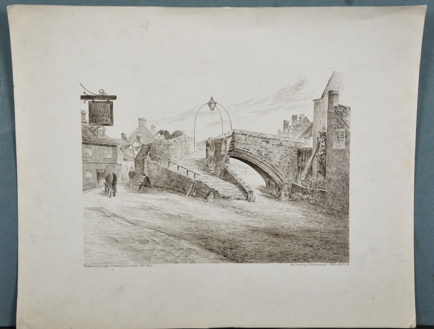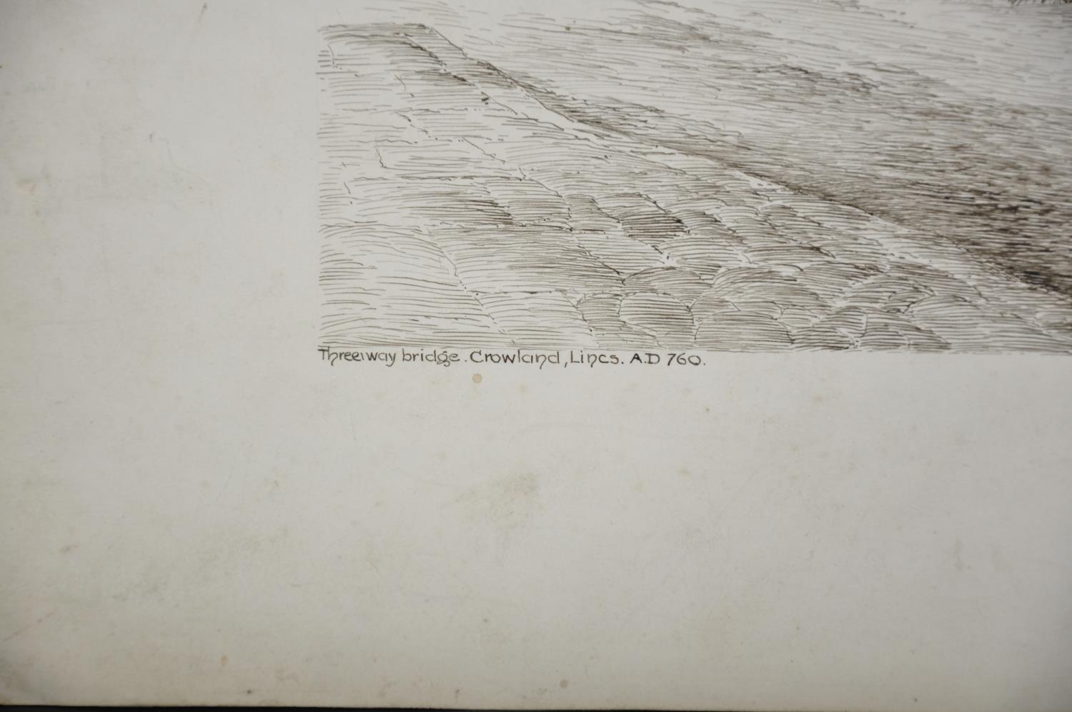 W Cowley Stevenson (Early 20th Century) British. “Threeway Bridge, Crowland, Lincs, A.D. 760”, Ink, Signed, Inscribed and Dated ‘23.2.13’, Unframed, 7.25” x 10” (18.5 x 25.5cm)