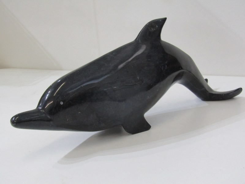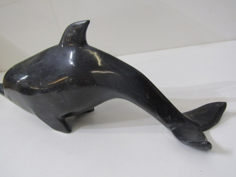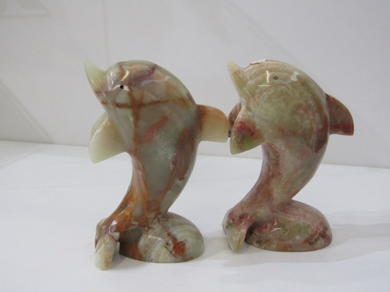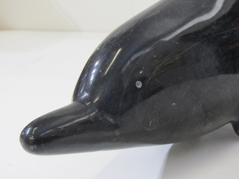 VINTAGE CARVED STONE DOLPHIN, good quality carved black stone dolphin, 42cm, also pair of onyx style leaping dolphins, 15cm height