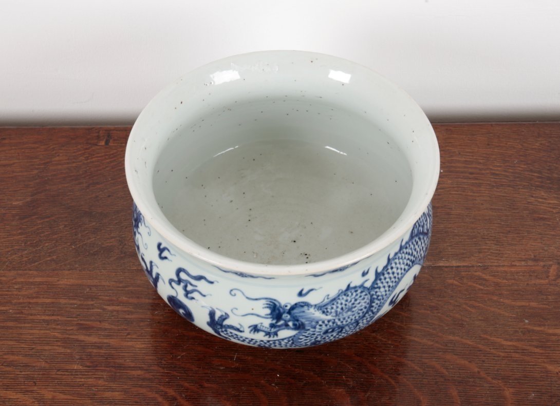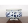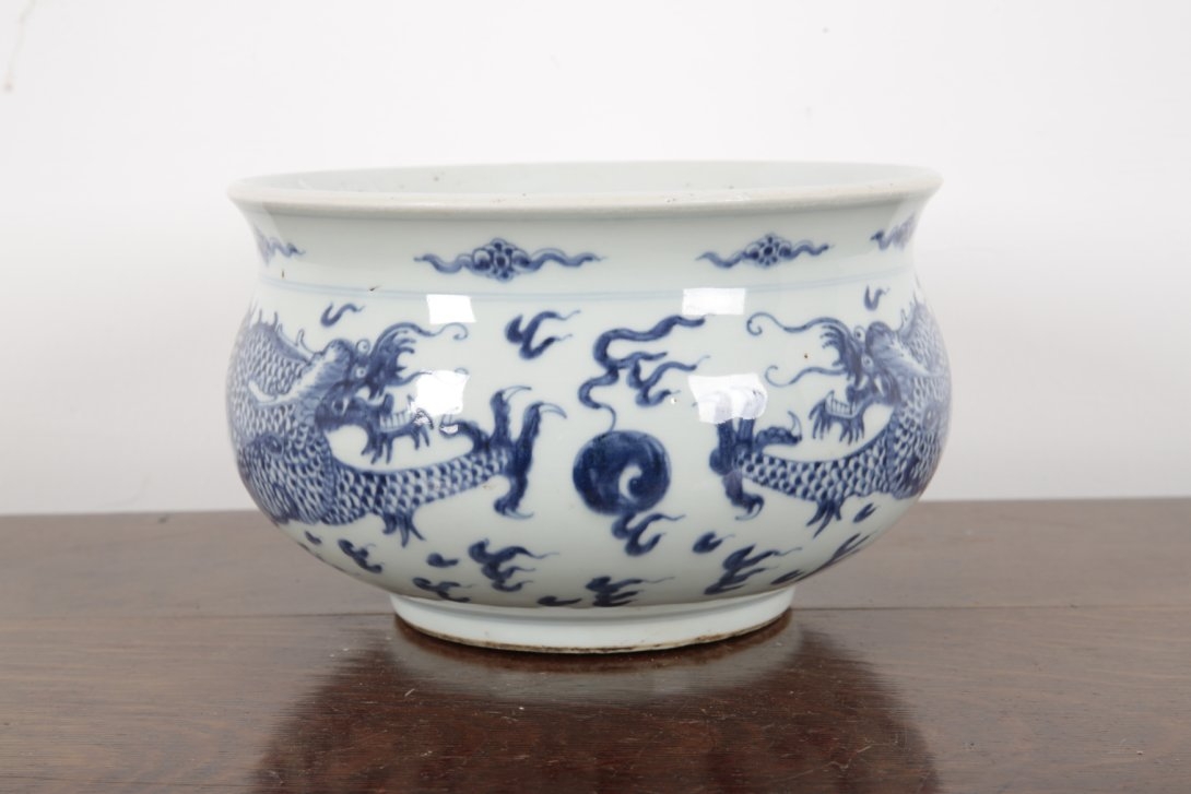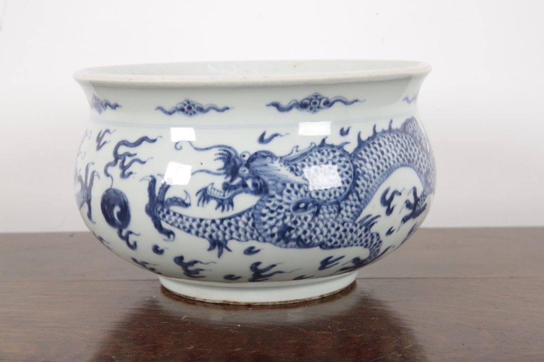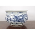 A CHINESE BLUE AND WHITE TRANSITIONAL STYLE 'DRAGON ' JARDNIERE20th century, decorated with dragons chasing pearls, 14cm x 23cm