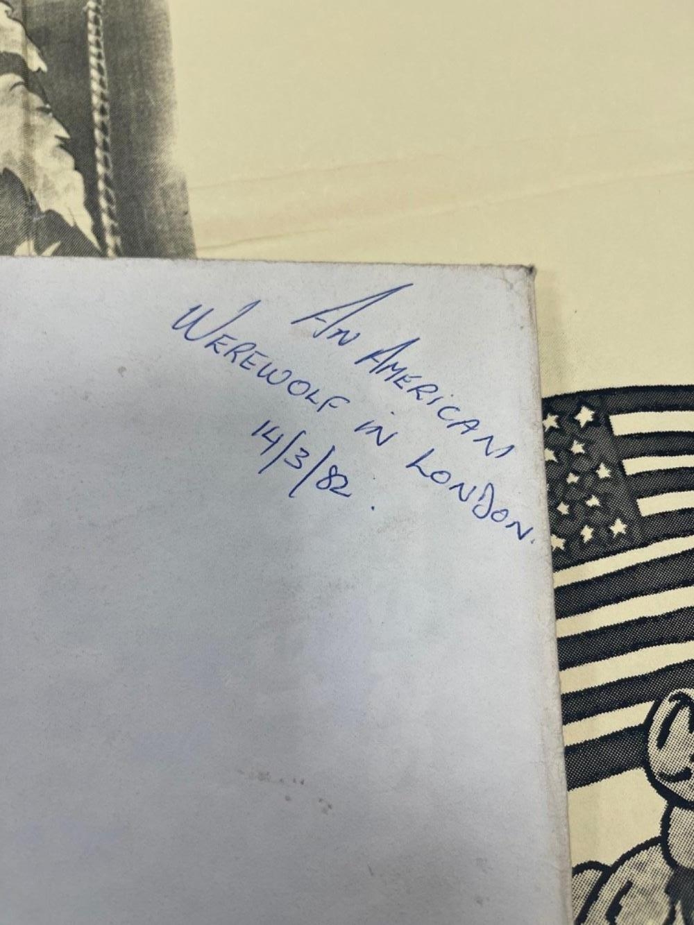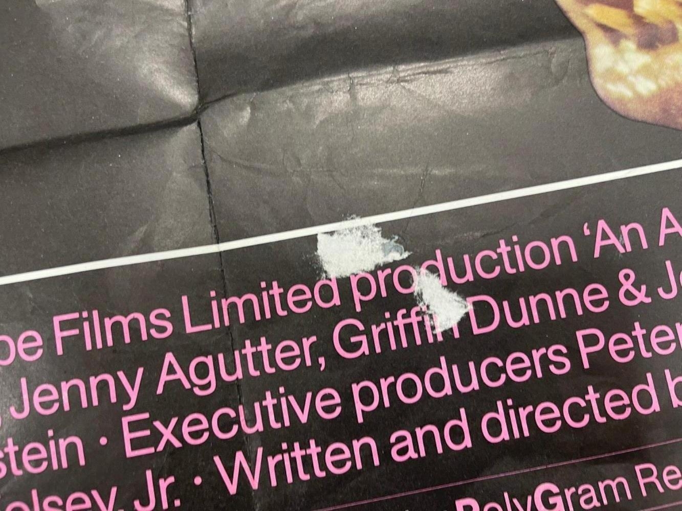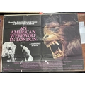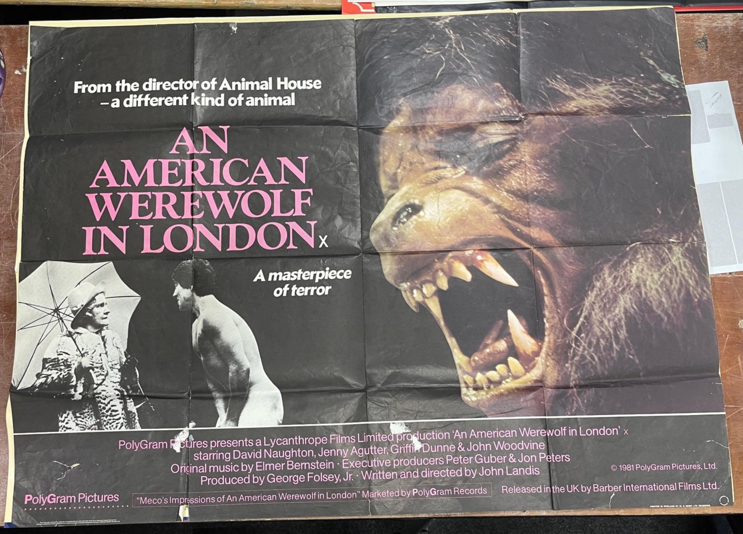 1982 AN AMERICAN WEREWOLF IN LONDON hand written dated verso 14/3/82? large wall poster 40" x 30" dimensions approx with a small V shaped tear bottom left hand corner 3cm approx, a small historical tear at the top edge LHS and a sellotape 'lifting-off' mark middle of credits and another LHS in pink font, and a small historical tear 2.5cm bottom LH corner - and all the usual folds - this poster is stated 1981 Polygram Pictures Ltd