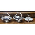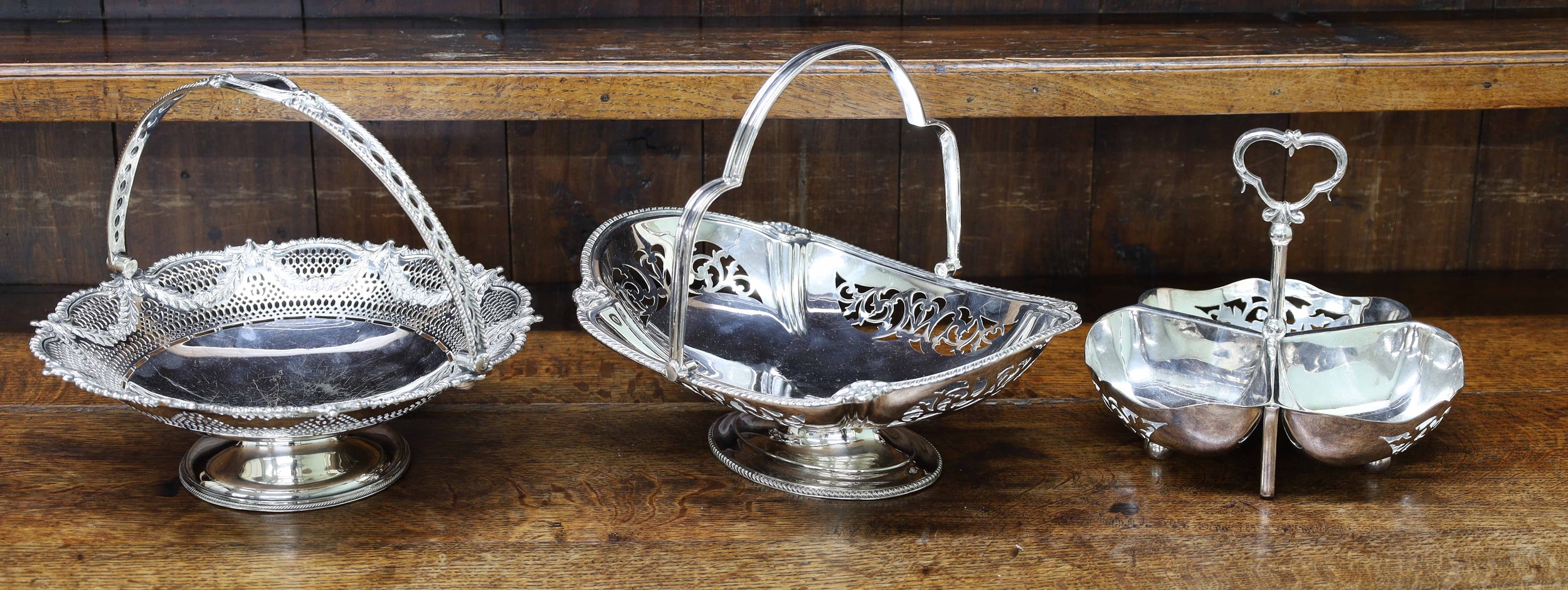 Three silver plated bonbon dishes, including a pierced boat shaped example with swing handle by Walker & Hall, 11" wide, 9" high (3)