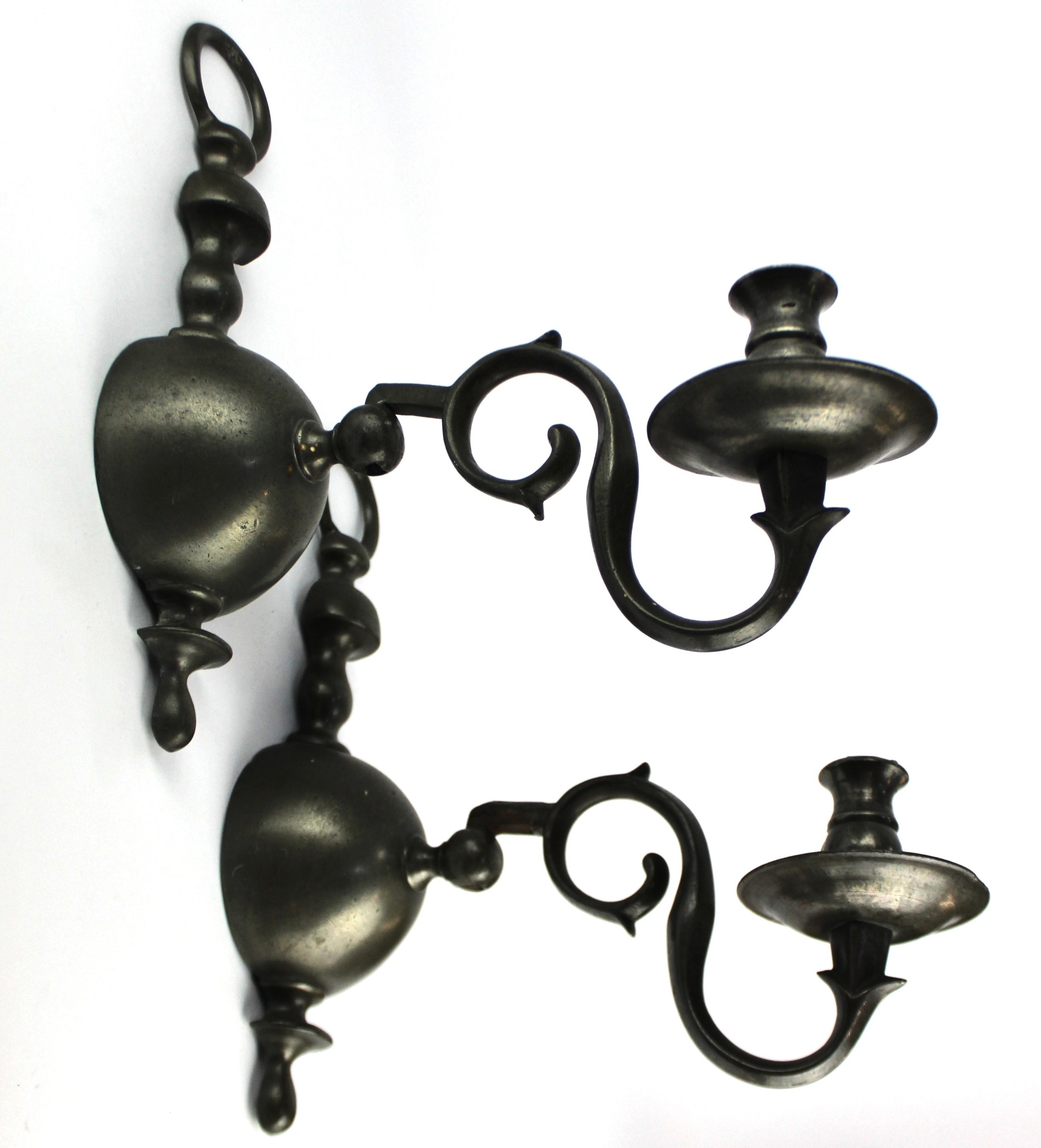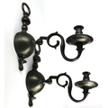 A pair of heavy pewter wall sconces each with single candle holder on adjustable scroll stem, height 33cm