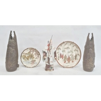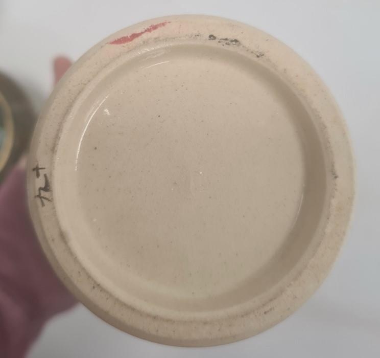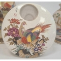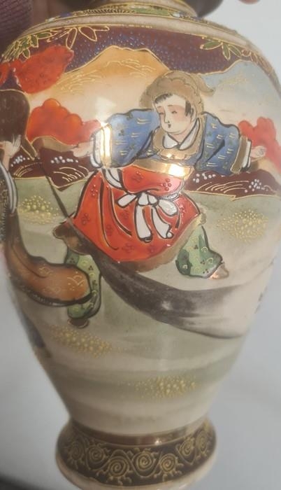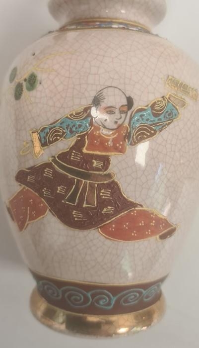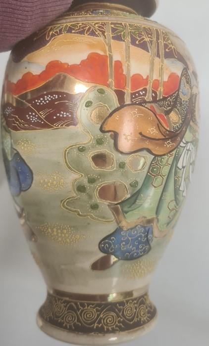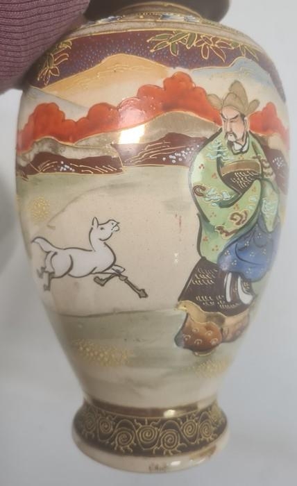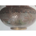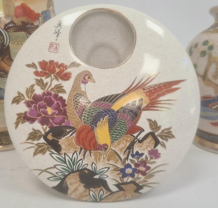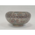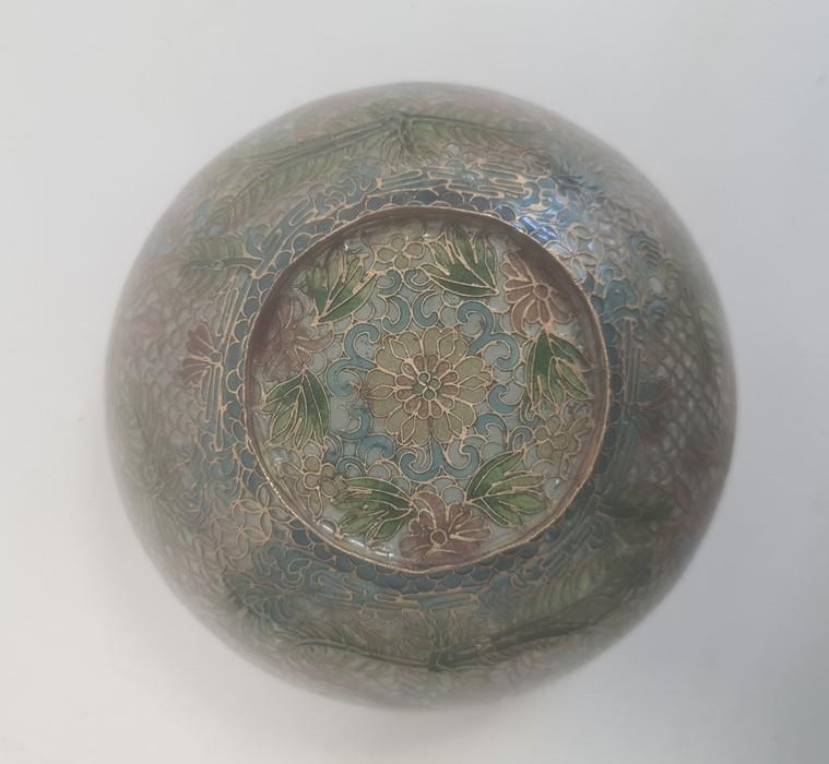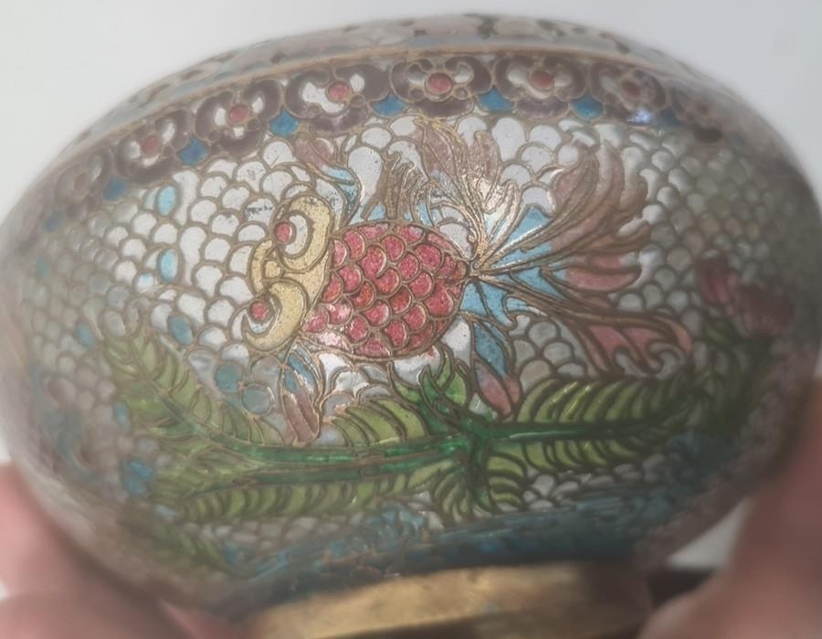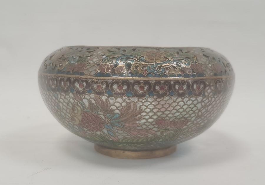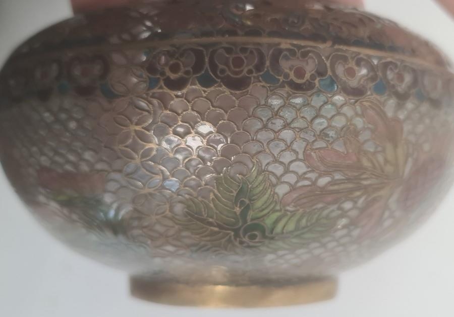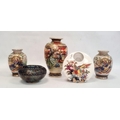 Japanese plique-a-jour enamel bowl with incurved rim, brass mounted and decorated with koi carp and foliage, probably first-half 20th century, 14cm diameter, three Japanese Satsuma-style 20th century vases and one further (5)