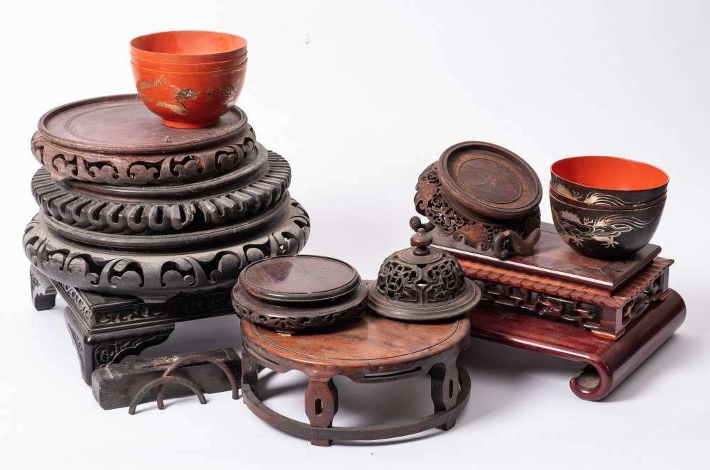 A group of Chinese carved hardwood and other stands together with one cover: 12-28cm [10].