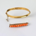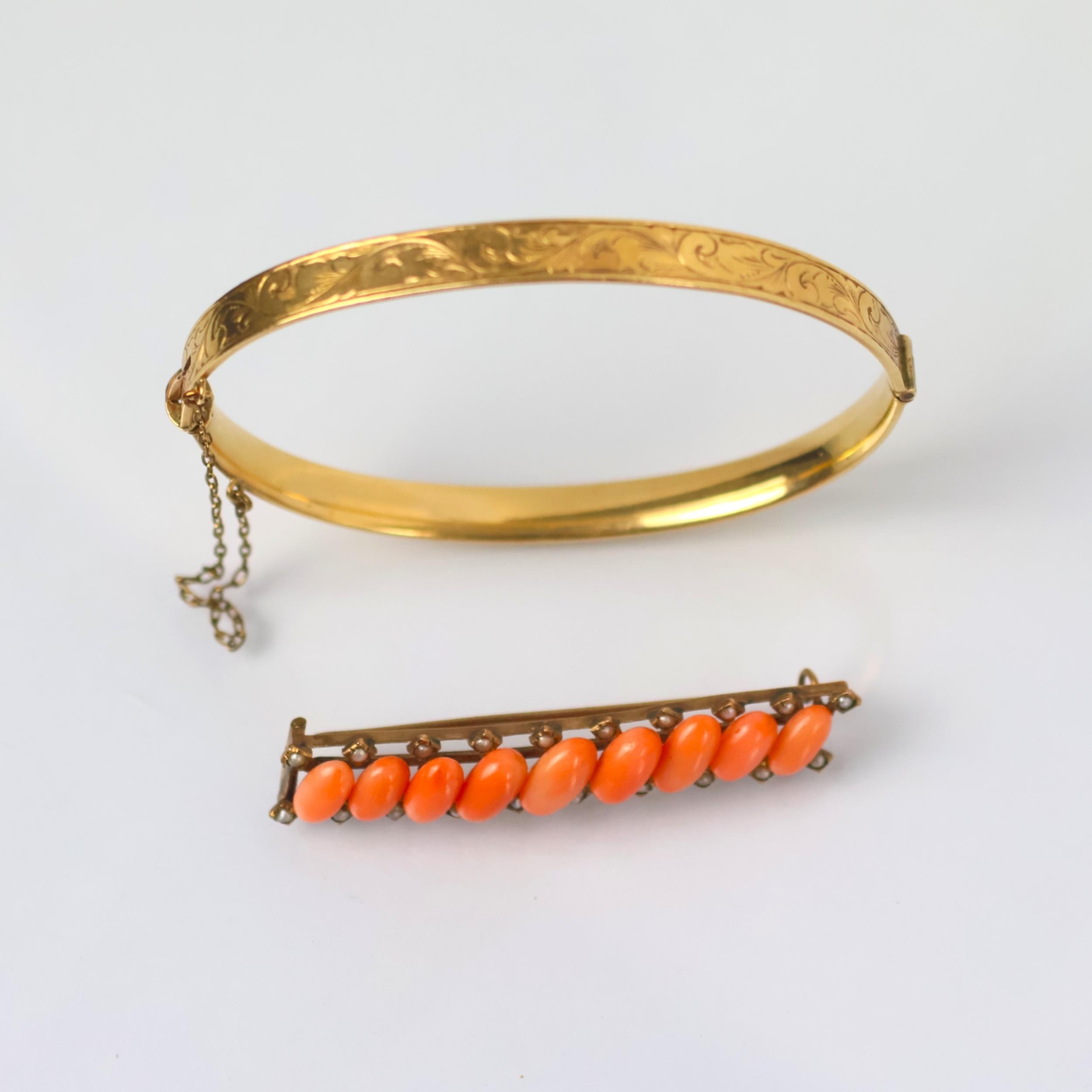 An early 20th century style gold plated bangle, with florally engraved front leading to plain polished reverse, stamped ‘9ct gold, bronze core’ 7cm wide, with a coral and seed pearl brooch (2)