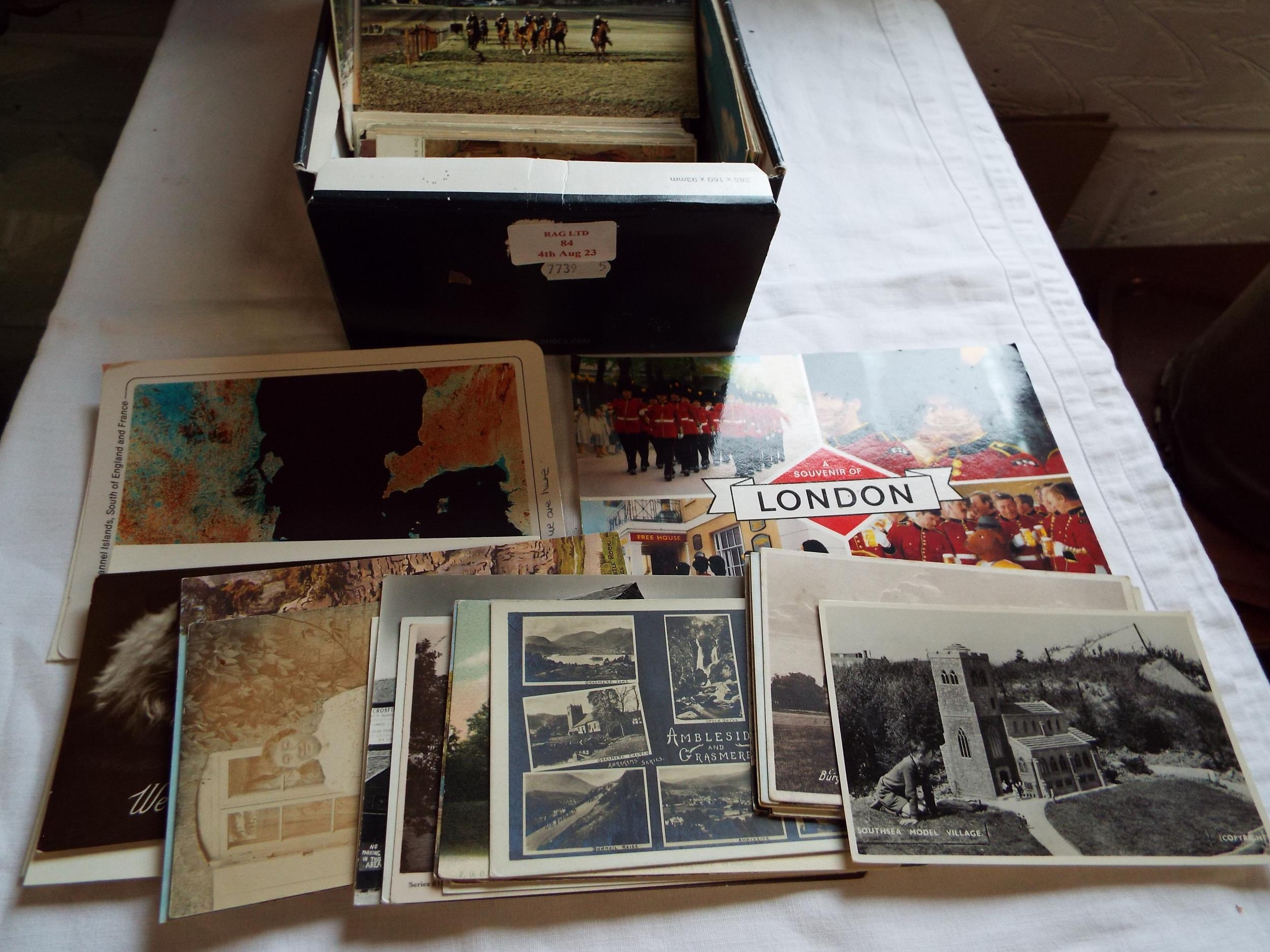 A box of assorted vintage postcards